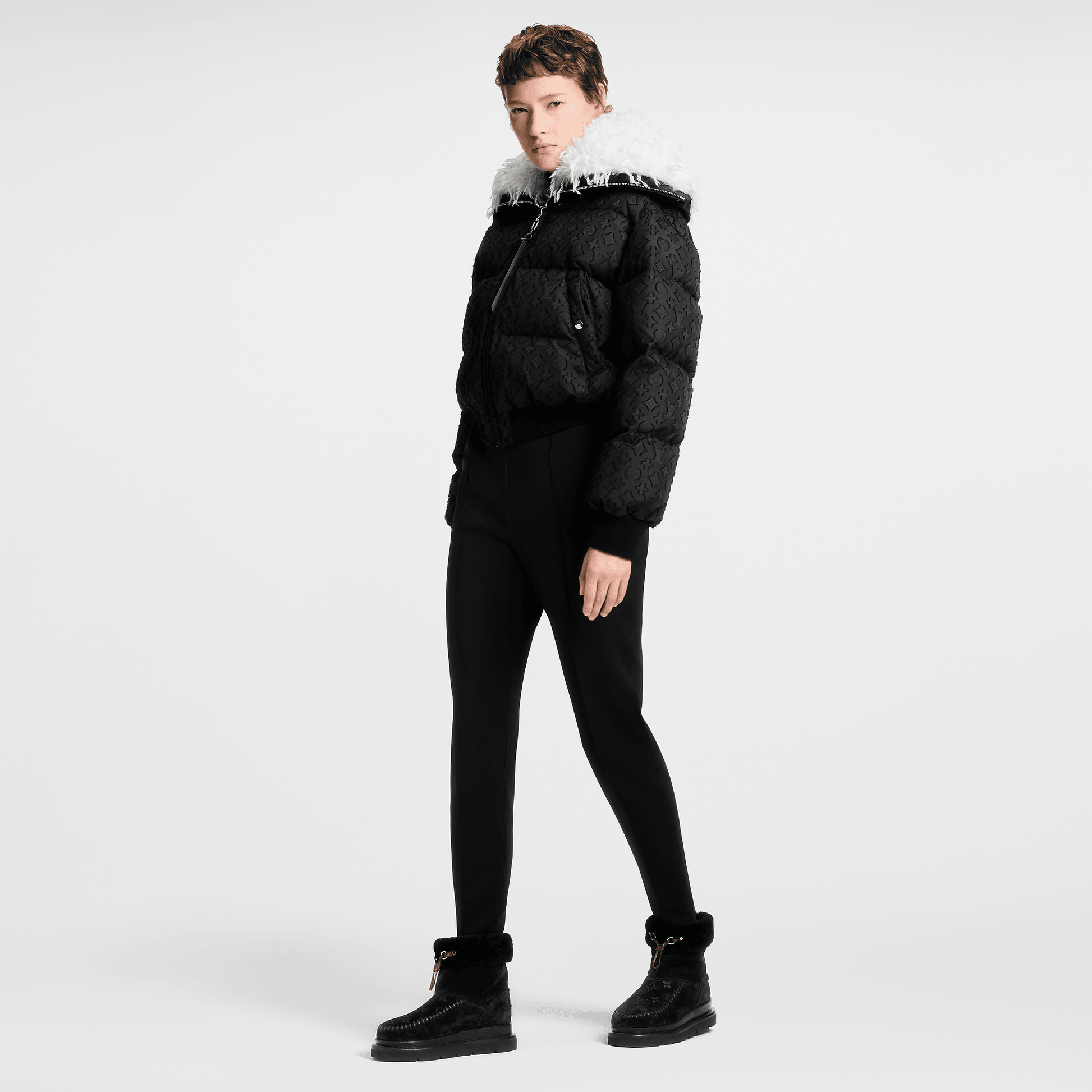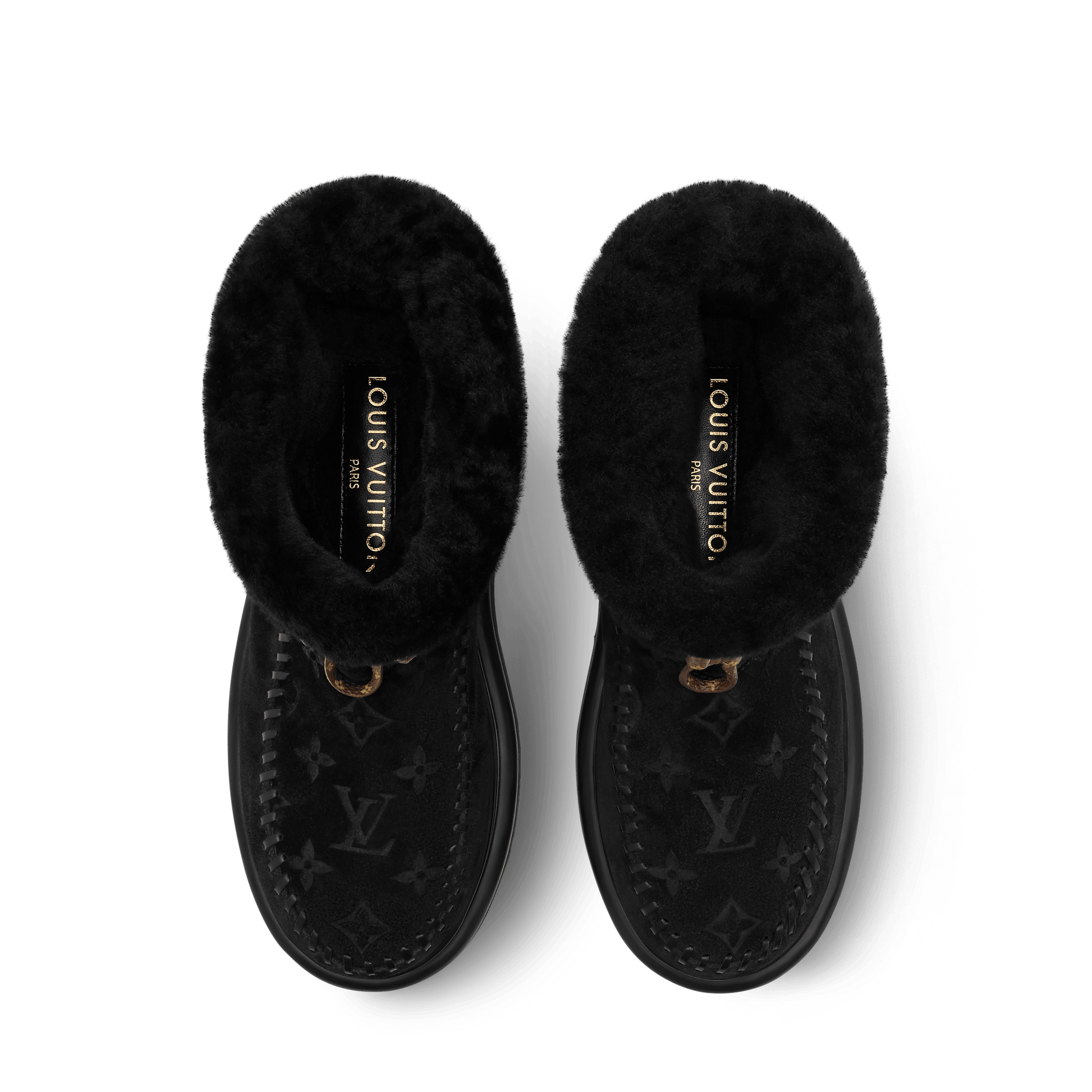 The Cortina ankle boot combines an upper in suede calf leather with a snug shearling lining. Part of the LV Ski capsule, this model is distinguished by refined signatures, including a Monogram-pattern vamp and leather laces finished with an LV Circle accessory. Perfect for both winter escapes and city life, it comes on a slip-resistant rubber outsole.