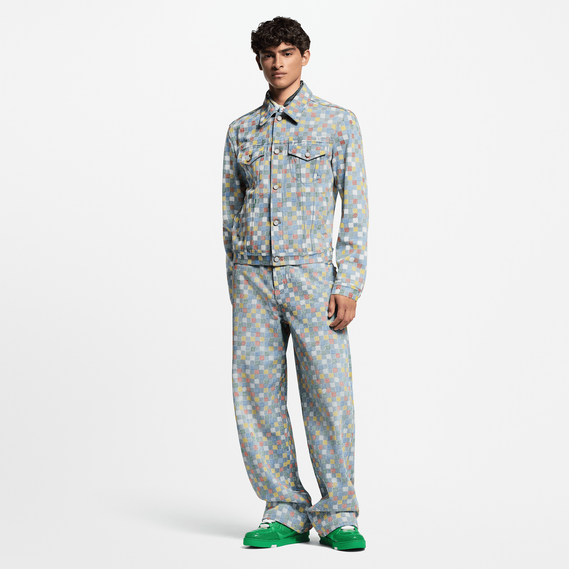 This graphic trucker jacket in washed, organic denim is adorned with the emblematic LV Vers Damier motif incorporating Marque L.Vuitton Déposée signatures from the Spring-Summer 2025 show. Printed in bold primary colors with a hand-painted effect, it recalls the display of flags at the UNESCO rooftop garden where the collection was presented. Pearl-effect buttons lend a sophisticated finishing touch.
