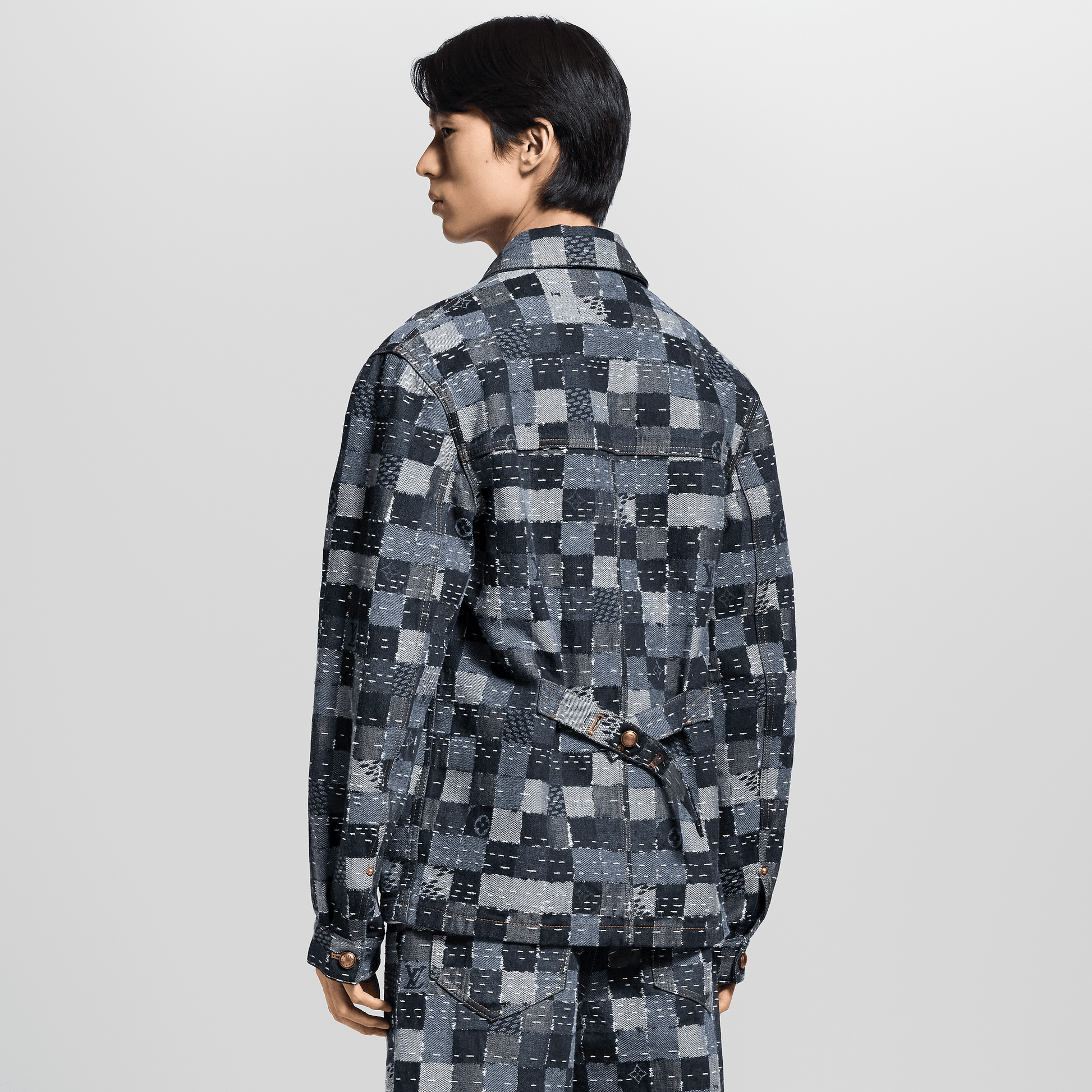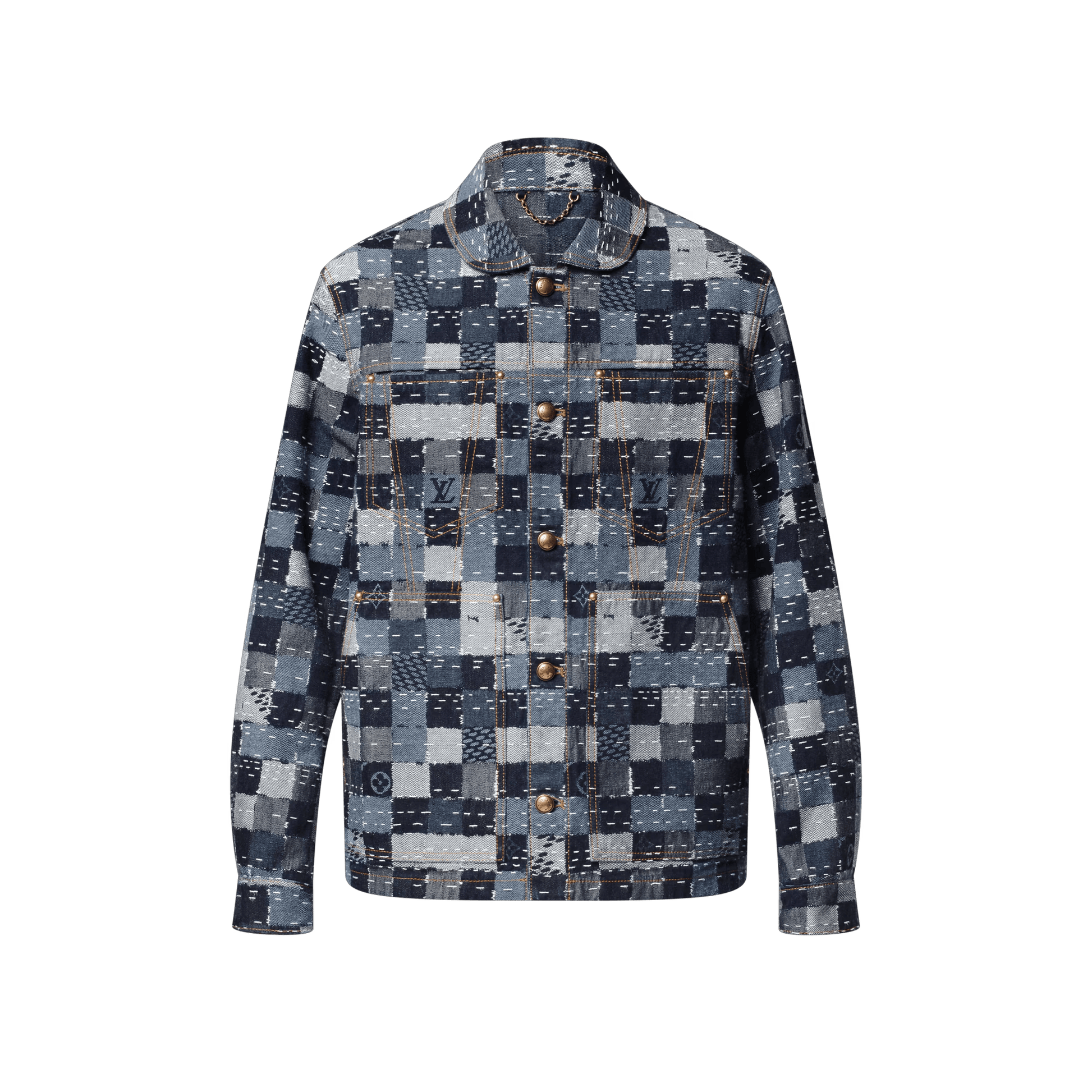 This richly worked denim workwear blouson is from the Fall-Winter 2025 collaboration between Pharrell and Nigo. It is adorned with a patchwork-effect Damier jacquard inspired by the craft traditions of Nigo’s native Japan. A rounded collar lends an elegant accent to the utilitarian silhouette, which is further adorned golden domed metal buttons. Matching pants make a standout runway look.