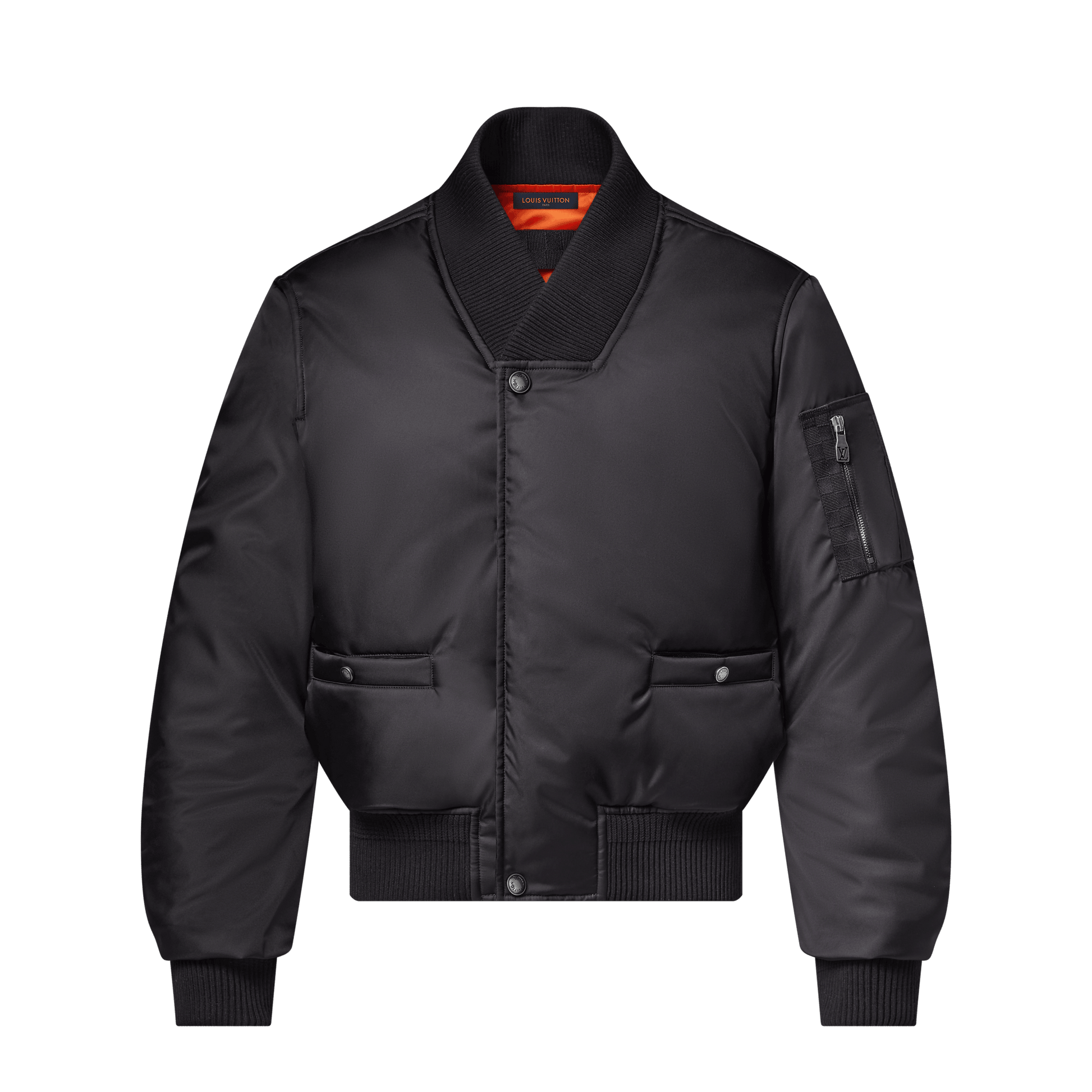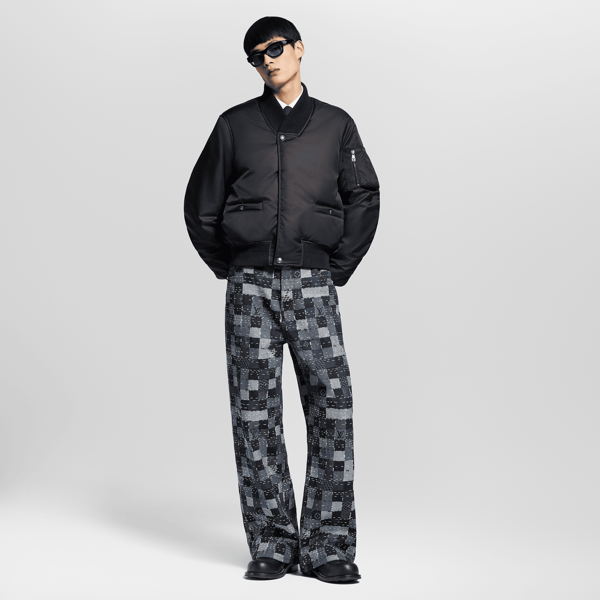 This sleek black flight blouson in a lustrous technical twill is from the Fall-Winter 2025 collaboration between Pharrell and Nigo. Inspired by the Rockabilly movement from Tokyo, it has a cropped silhouette and a modern ribbed Kimono-style collar. Damier grosgrain trim accents the sleeve pocket while a glossy 3D Marque L.Vuitton Déposée signature adorns the back.