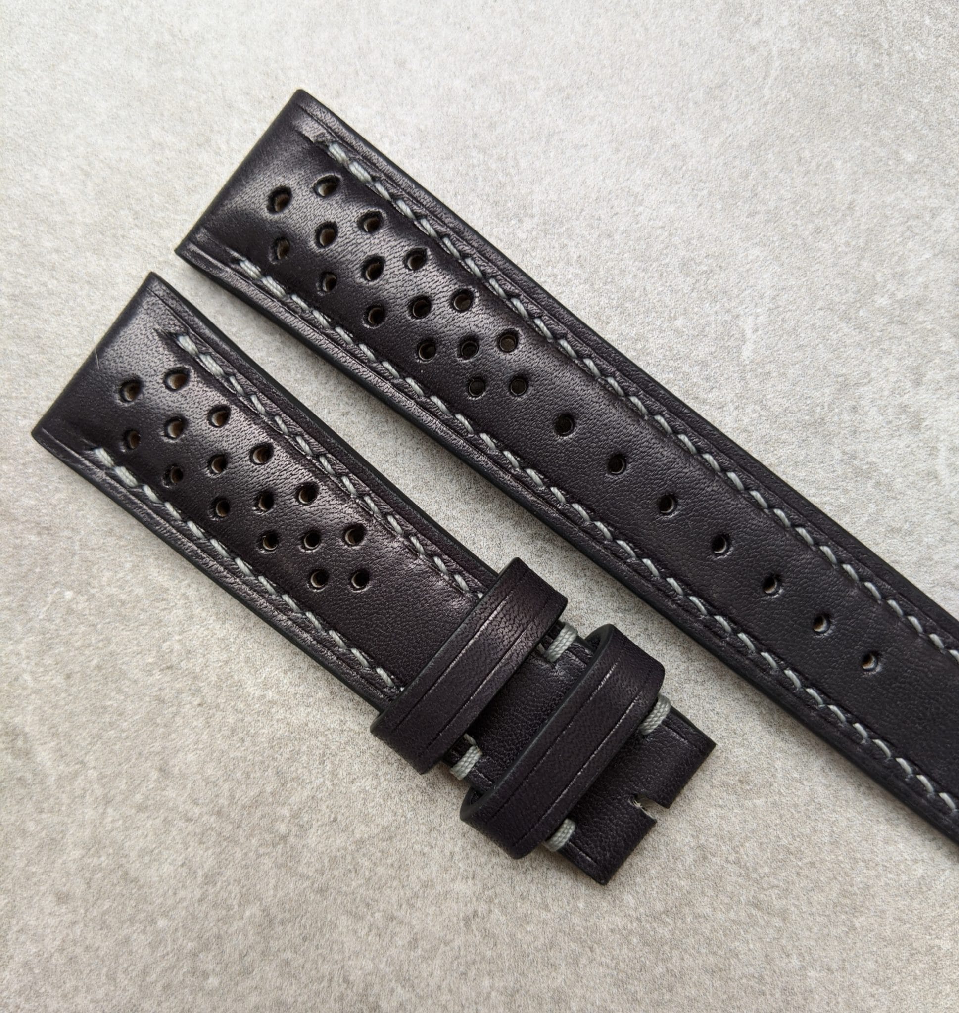 French Calfskin Rally Watch Strap - Black & Smoke Grey
