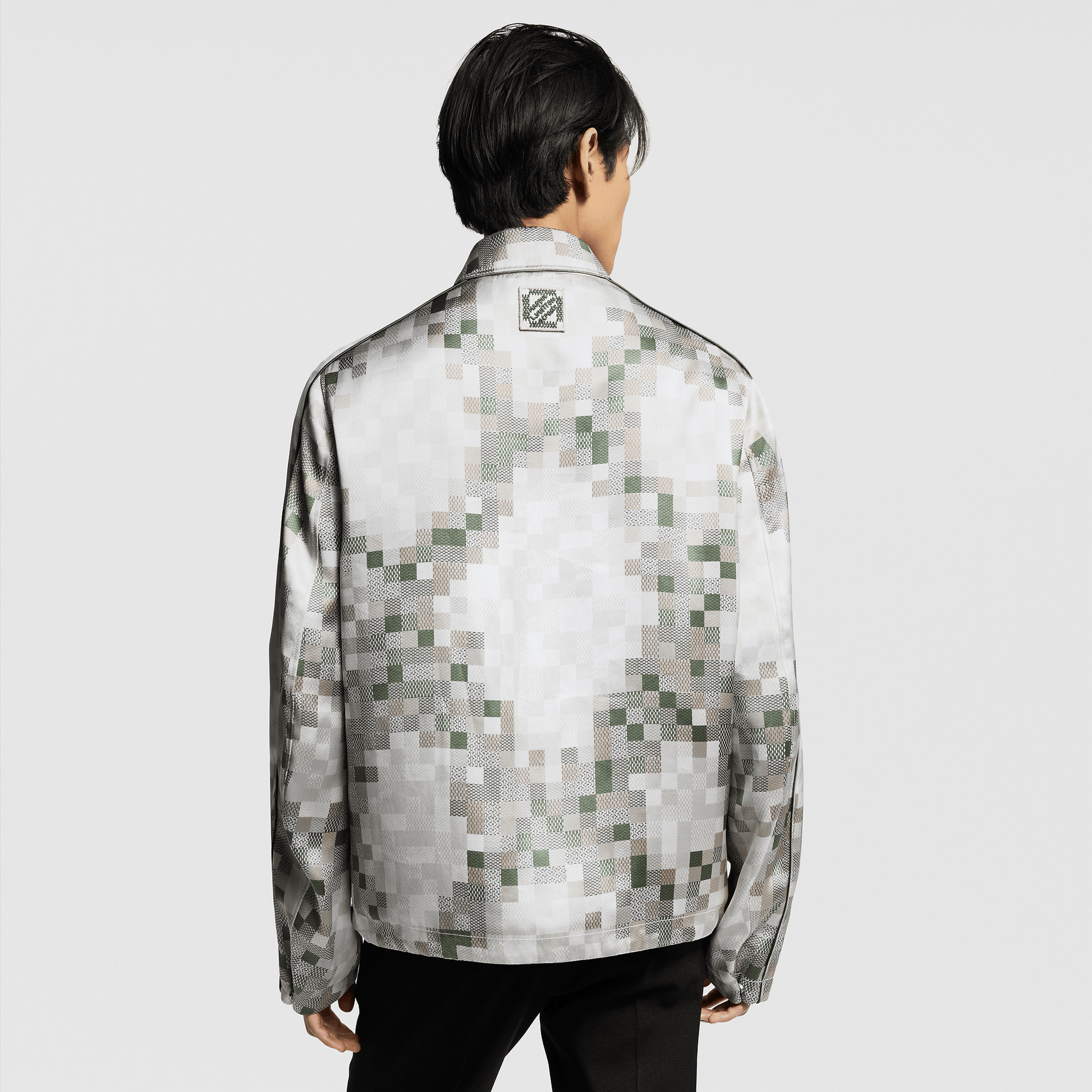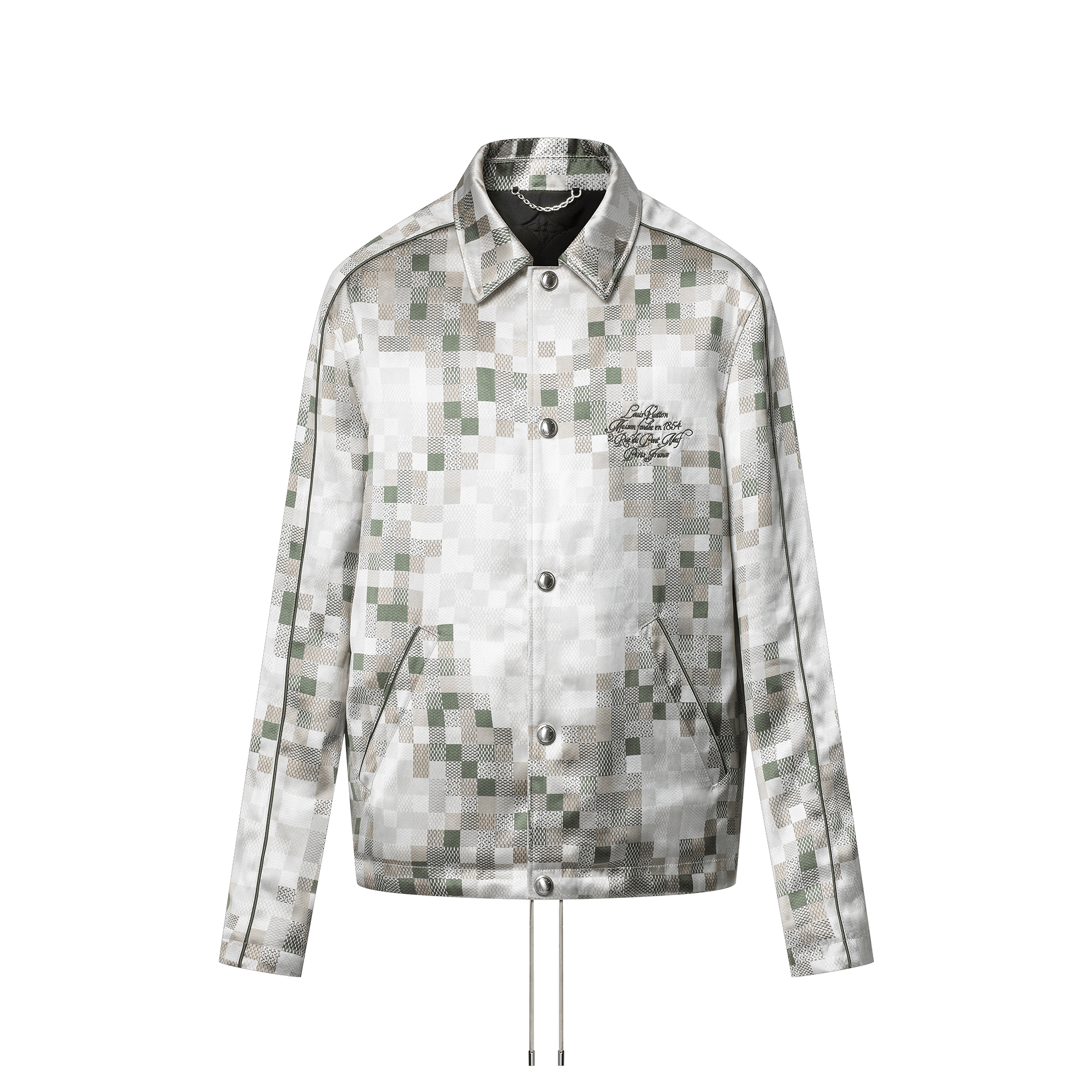 This coach jacket elegantly twists a sporty silhouette with its fluid satin construction and graphic Snakoflage print that revisits the iconic Damier in pixelated pale khaki and beige tones that call to mind the markings on snakeskin. An embroidered Louis Vuitton signature adorns the chest, while piped details on the sleeves and pockets add a chic finishing touch.