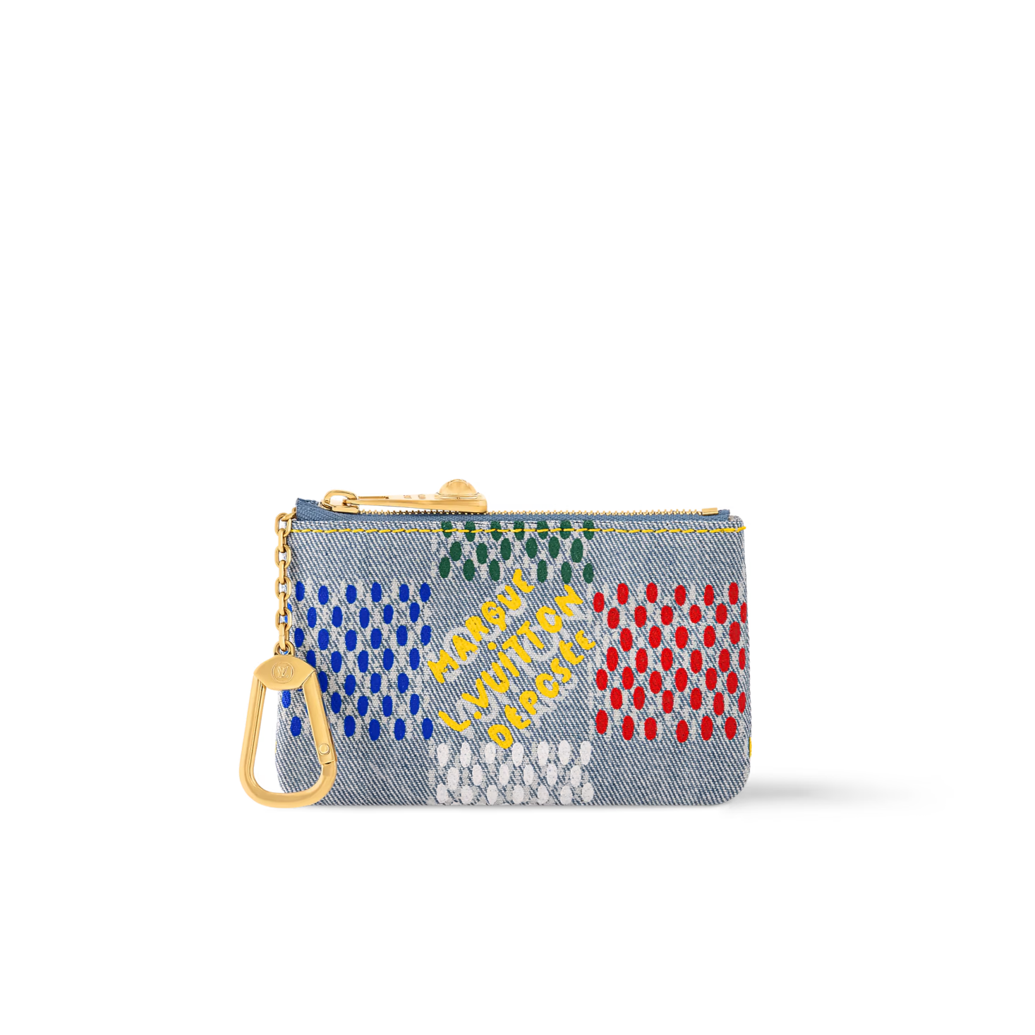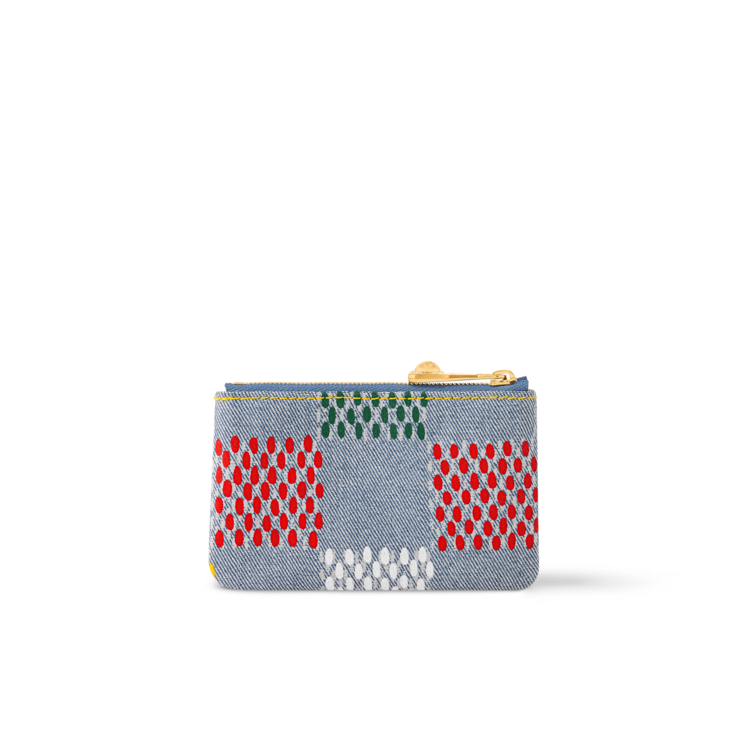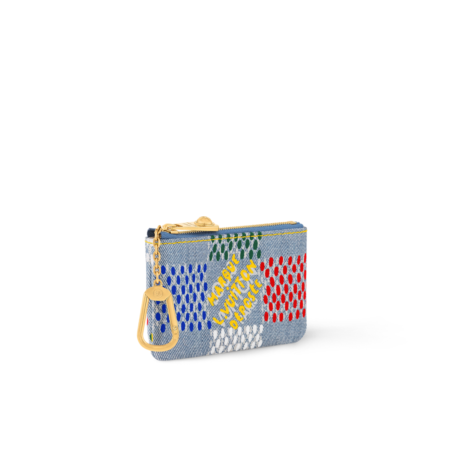 Made from LV Vers Damier Denim, the Key Pouch is adorned with an over-sized version of the Damier checkerboard pattern, including the "Marque Louis Vuitton Déposée" found on the original design. Perfect for keys, it can also be used to hold cash and cards. A small hook-and-chain enables it to be attached to a belt or bag.