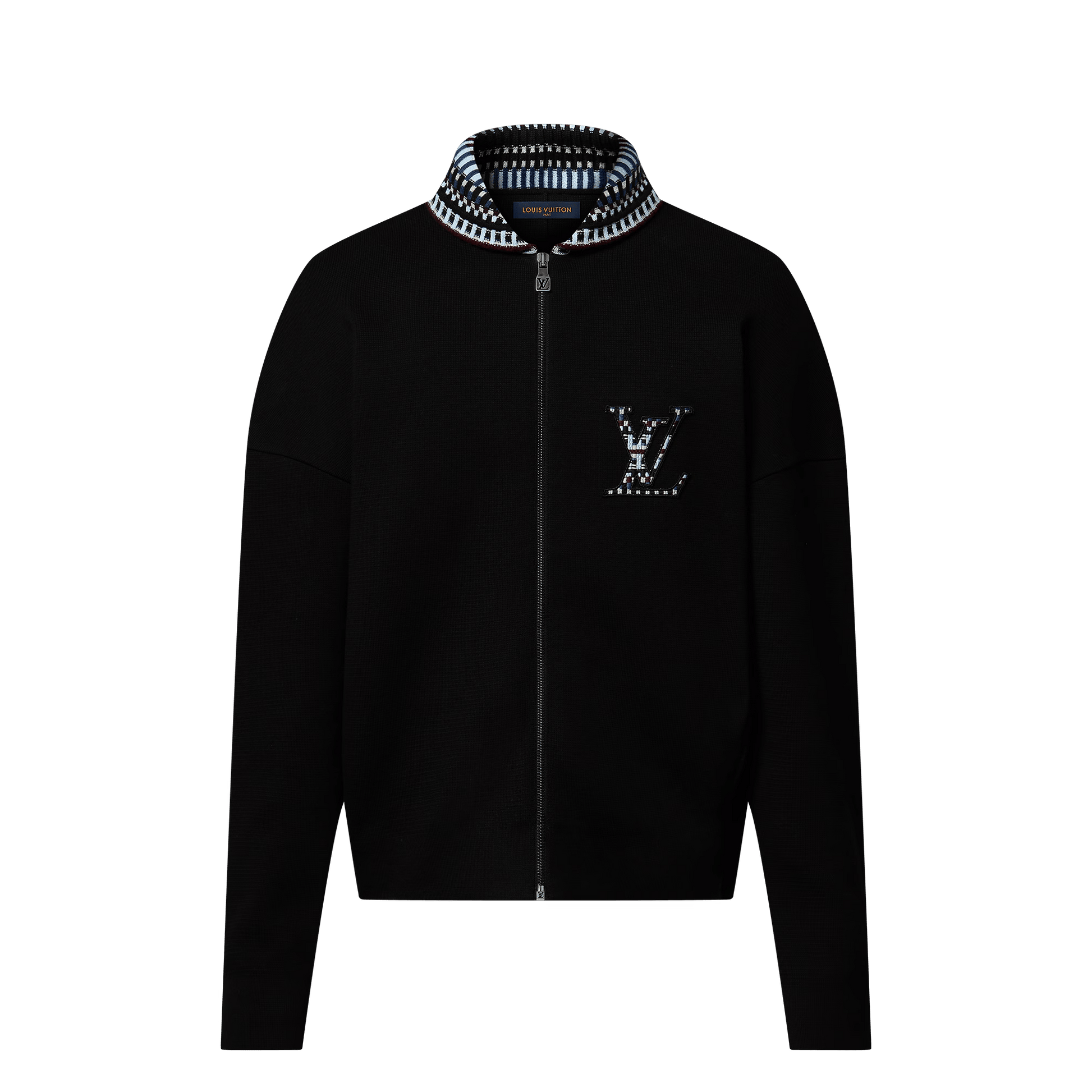 A light mid-season layer, this elegant black bomber in organic knitted cotton is perfect for lounging on the deck of this collection’s cruise ship. The zippered silhouette is accented with a crochet-style folded ribbed collar with a colorful checkered motif repeated on an embroidered LV patch on the chest. Matching pants make a chic yet casual set.