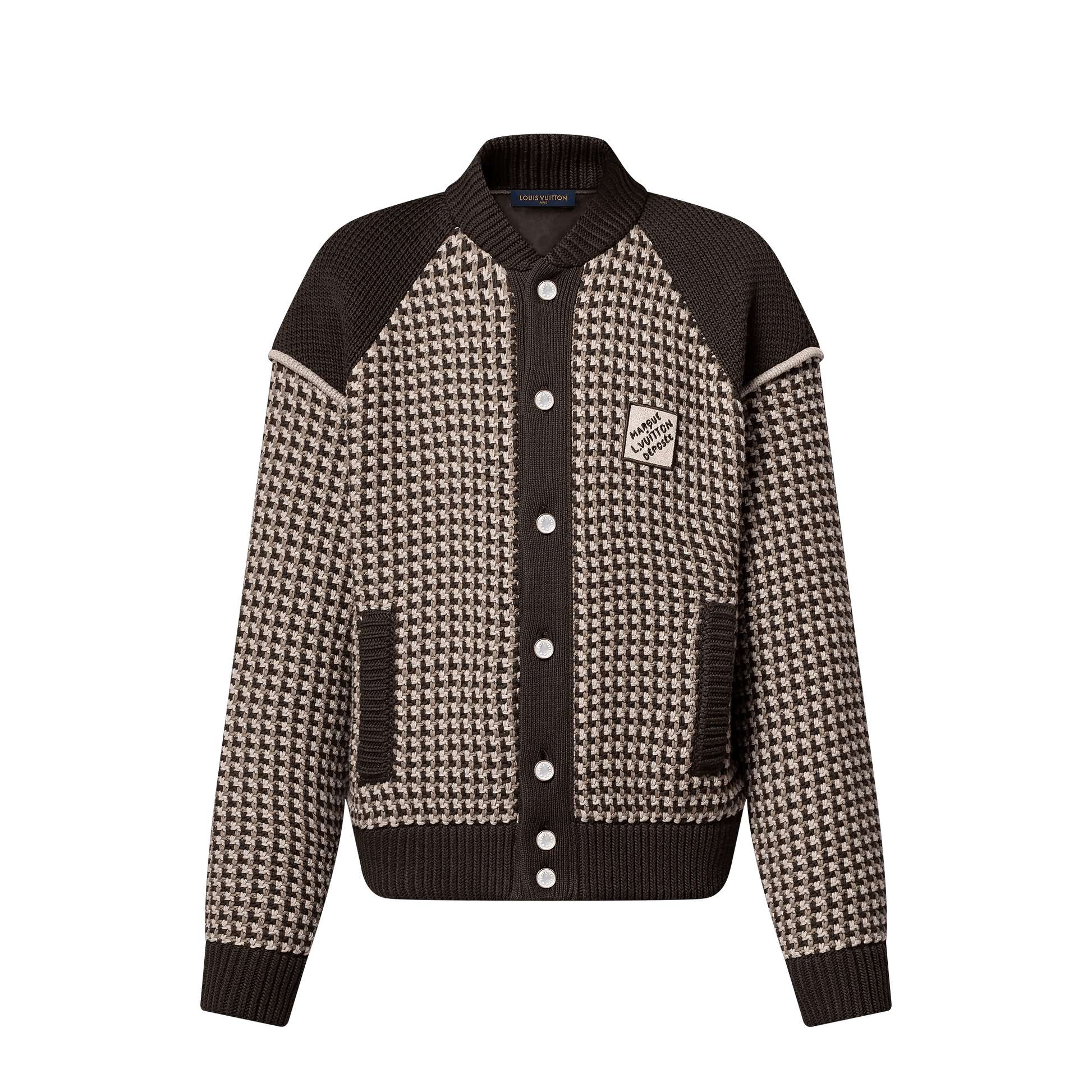 This cotton bomber from the Spring-Summer 2025 show features a chunky LV Stitch jacquard in brown tones resembling miniature LVs. Dark brown ribbed accents frame this piece, from the collar and raglan shoulders to the pockets. A Marque L.Vuitton Déposée patch signs the chest while pearl-effect buttons add a dandy twist. Casual yet refined, this buy-now-wear-now piece is perfect for layering as the seasons transition.