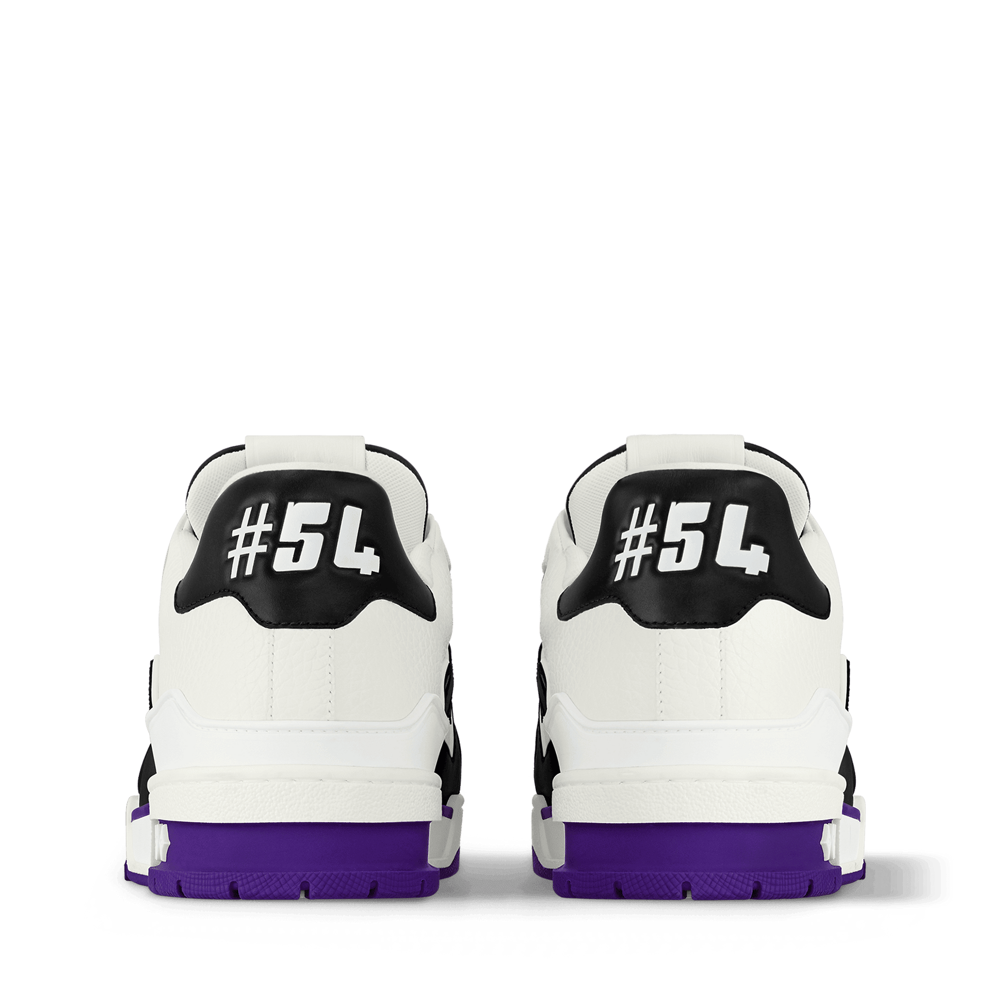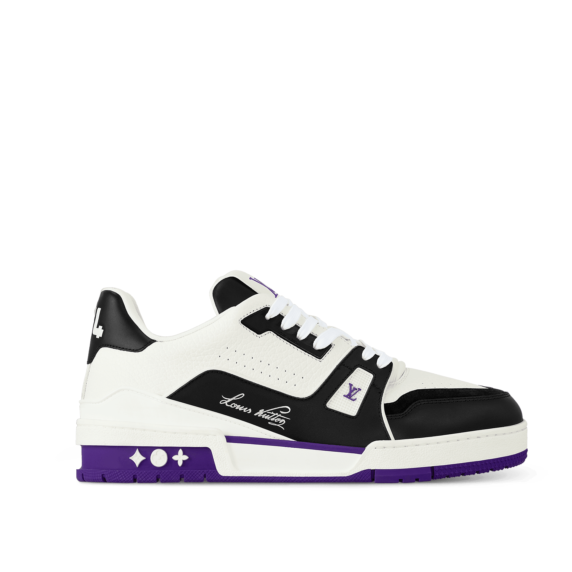 This edition of the LV Trainer sneaker comes in nubuck calf leather, which is partially debossed with the Monogram pattern. Inspired by vintage basketball sneakers, this model has a richly detailed upper featuring an adjustable velcro strap, a large Monogram Flower, and an asymmetrical Louis and Vuitton signature. It is finished with a two-tone rubber outsole.