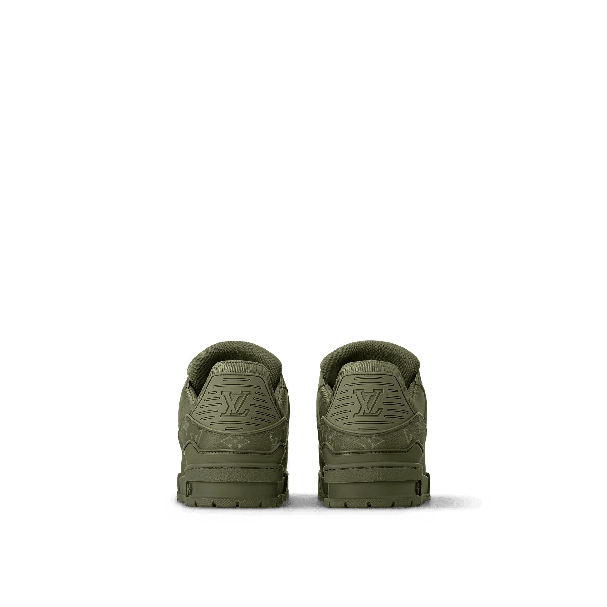 The sporty aesthetic of the LV Trainer sneaker is complemented by grained nubuck calf leather, including trim which replicates the look of iconic Monogram canvas. This model is notable for its rubber LV Initials and Vuitton signatures. It is finished with a tone-on-tone, technical outsole, which is decorated with Monogram Flowers.