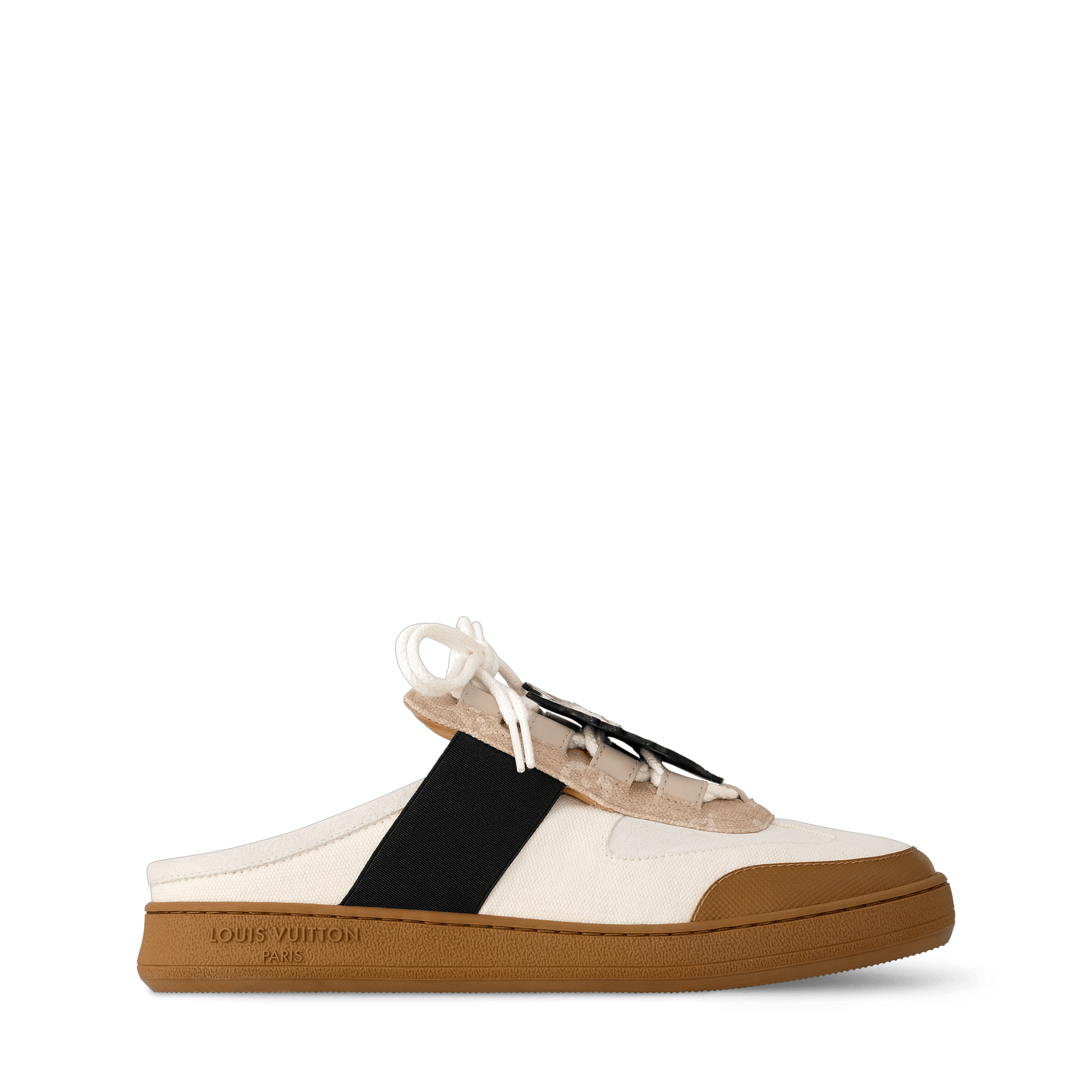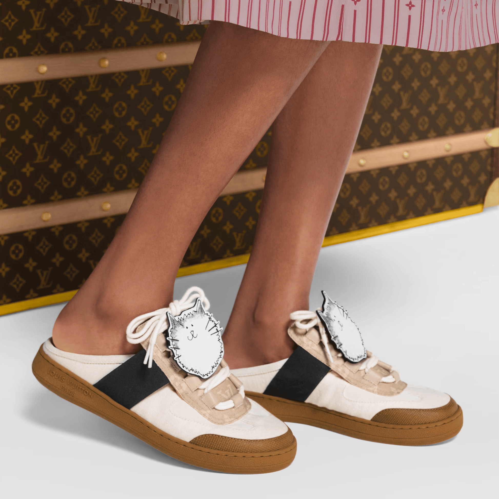 The Lous open-back sneaker is reworked this season in plain and Monogram-patterned canvas, while its double laces are embellished with a playful cat accessory. This versatile and stylish sneaker features discreet elastic inserts for easy fitting. It is finished with a supple rubber outsole bearing the Louis Vuitton signature.