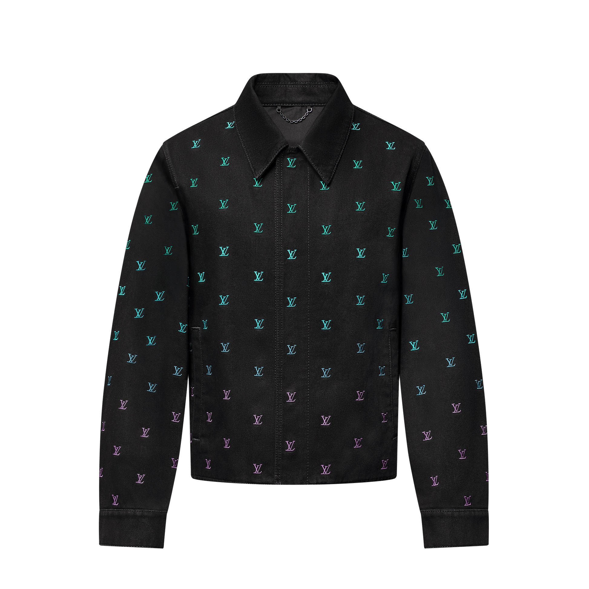 Crafted in washed black denim, this casual coach jacket is elevated with an allover embroidered LV Blason motif in a sophisticated gradient treatment, with pop colors fading from aqua to shades of green, blue and violet. Matching skate pants make a graphic total look.
