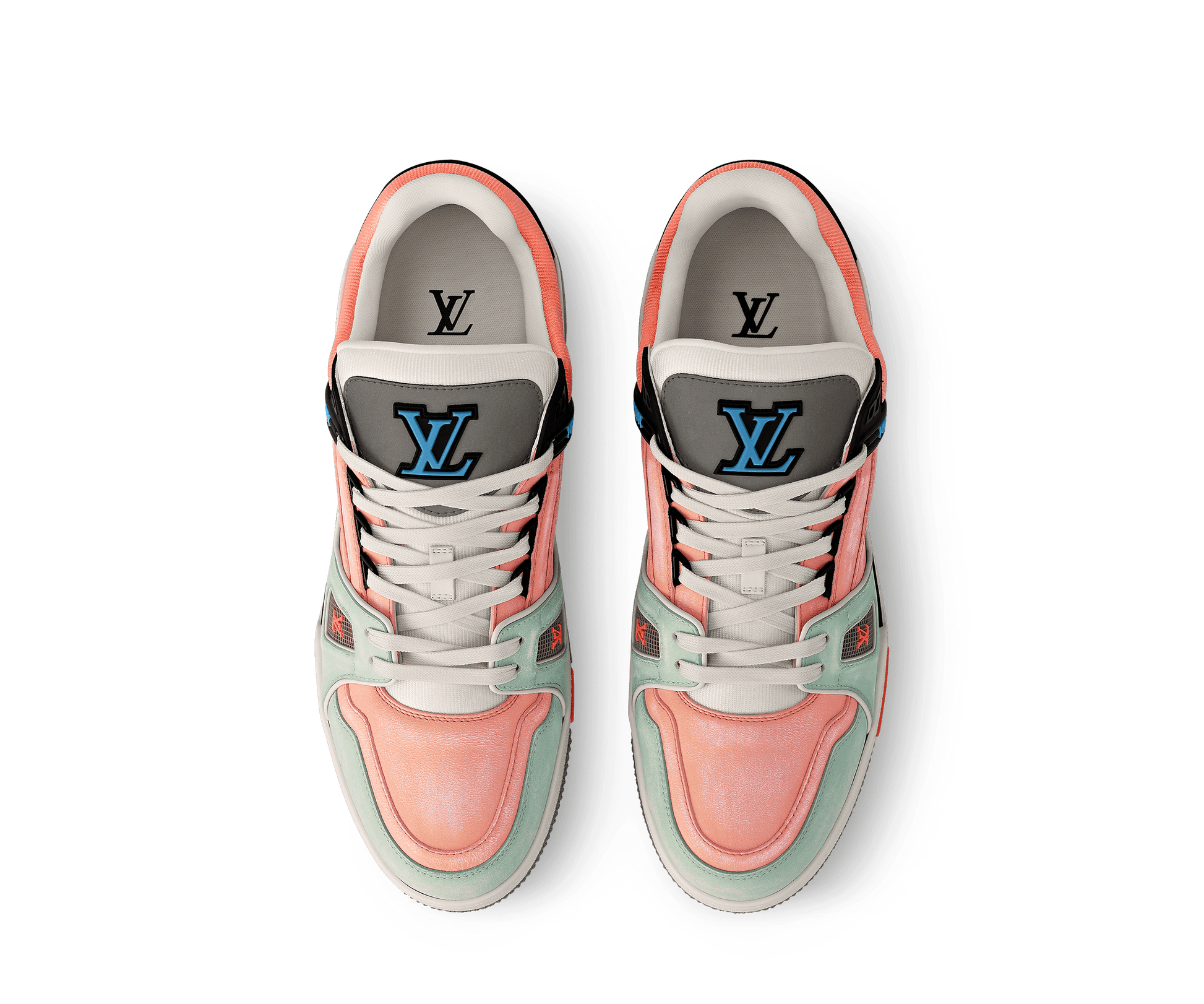 The cult LV Trainer sneaker is revisited in calf leather, which is sprayed by hand to create a subtle vintage effect that makes each pair unique. The different colors on the upper reveal its elaborate construction. This model, originally designed by Virgil Abloh, references vintage basketball sneakers.