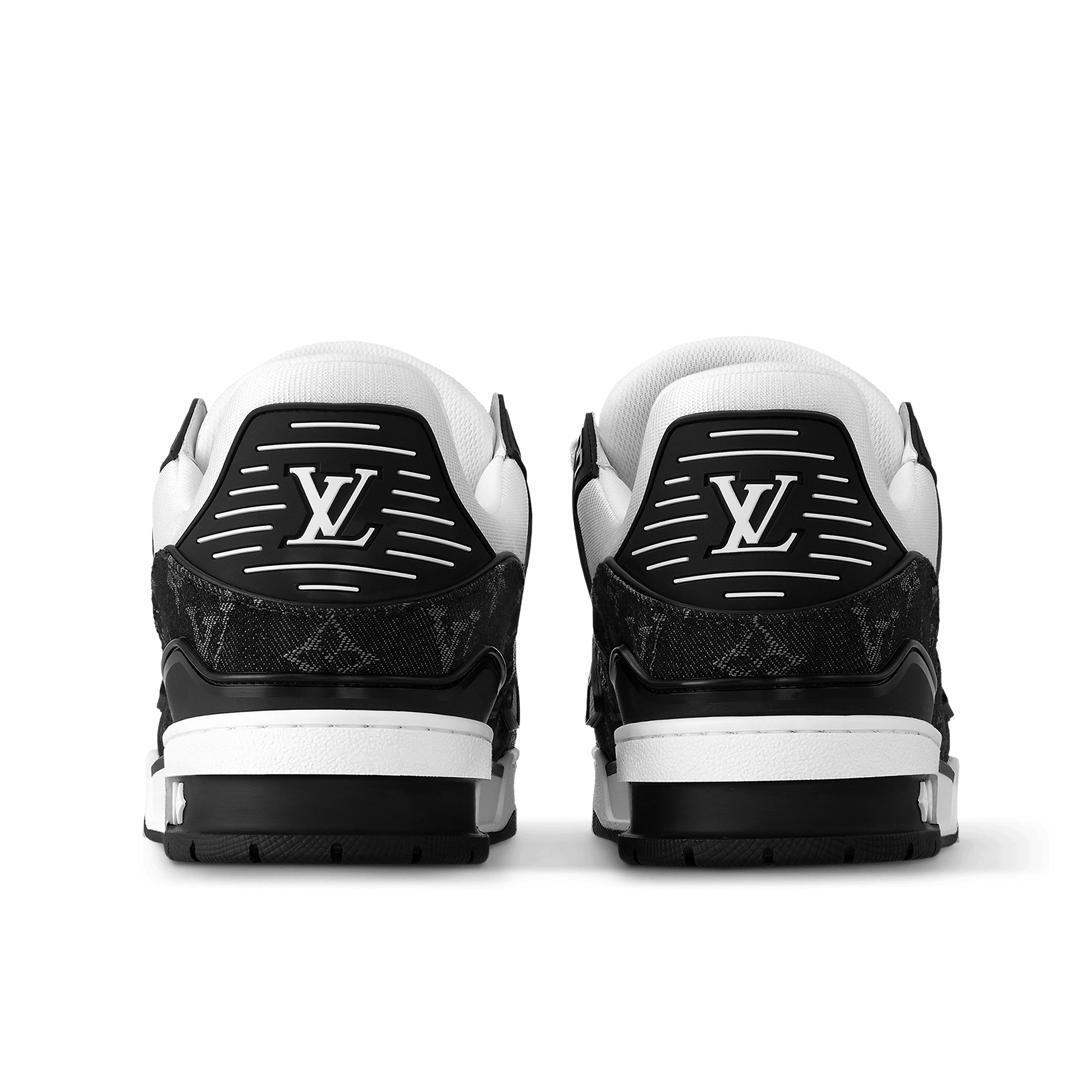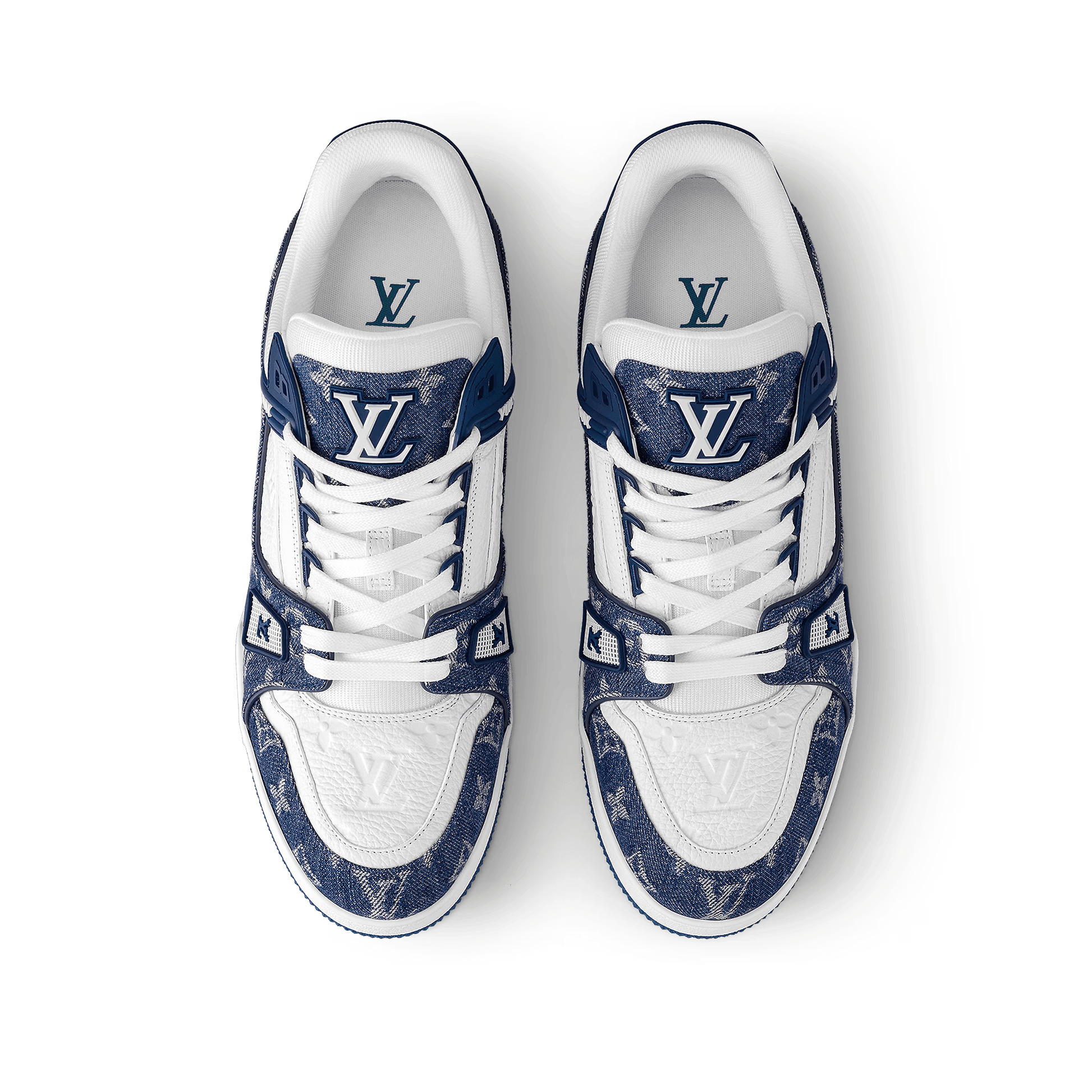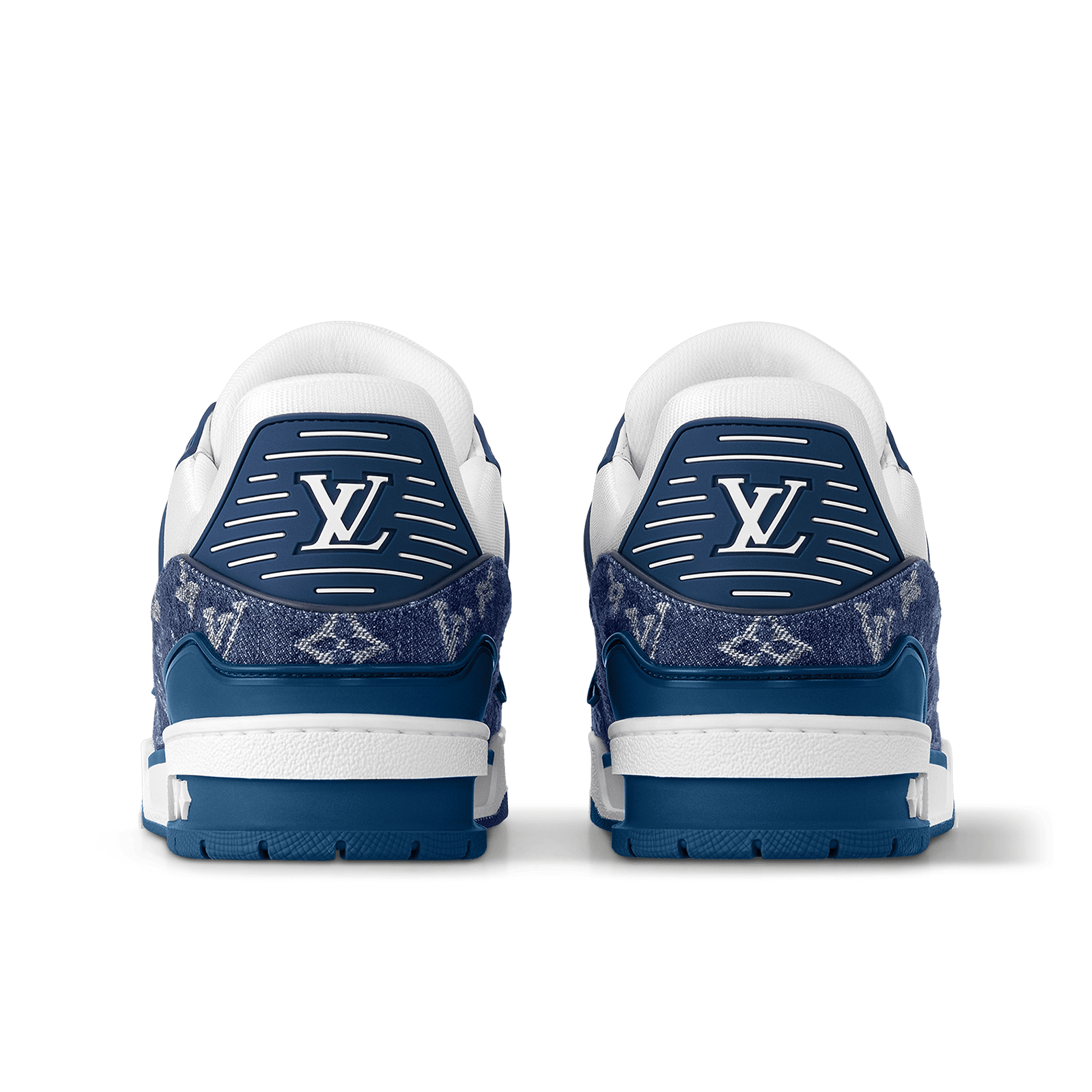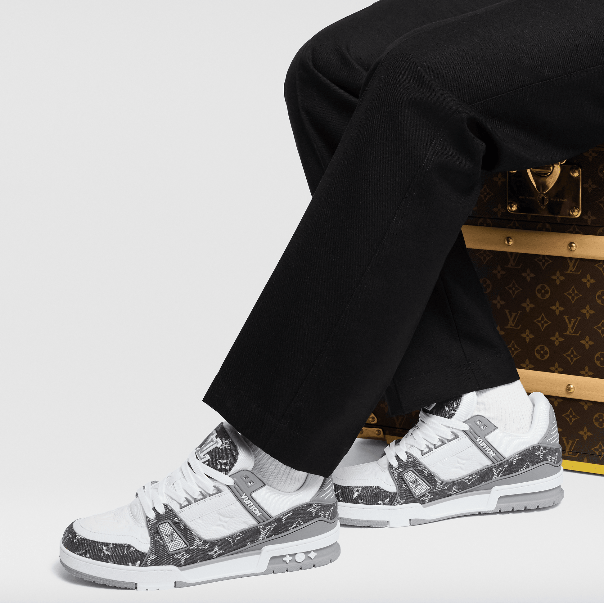Designed by Louis Vuitton Artistic Director Virgil Abloh, the iconic LV Trainer sneaker is revisited this season in Monogram denim and Monogram-embossed grained calf leather. The contrasting colors and materials highlight the elaborate construction of this model, which was inspired by vintage basketball sneakers.
