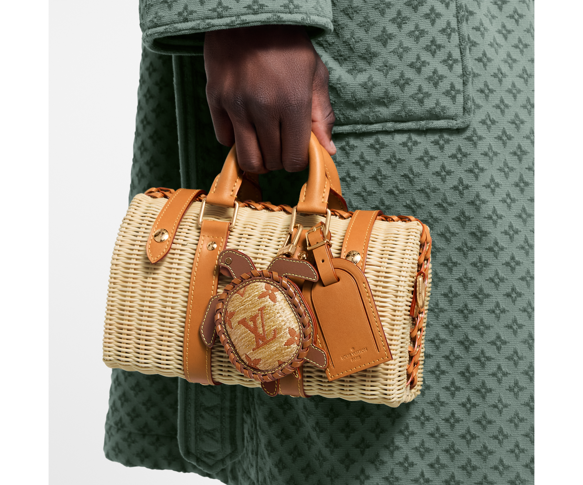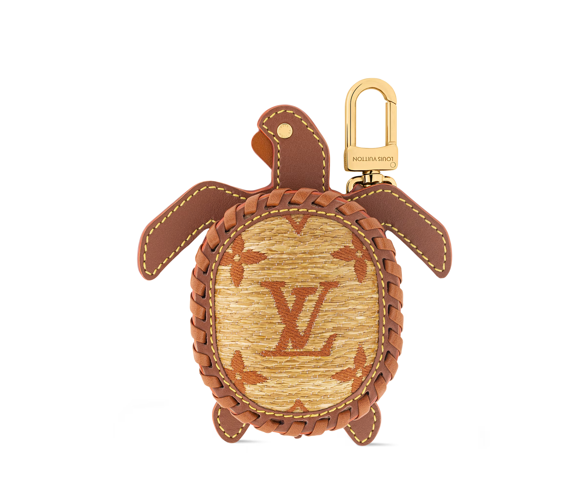 A fun and functional accessory, this turtle-shaped bag charm doubles as a mini pouch. Crafted from Monogram canvas with leather trim, it features Monogram Flower eyes, a gold-tone zip, and an LV-engraved hook for easy attachment to bags or keys.