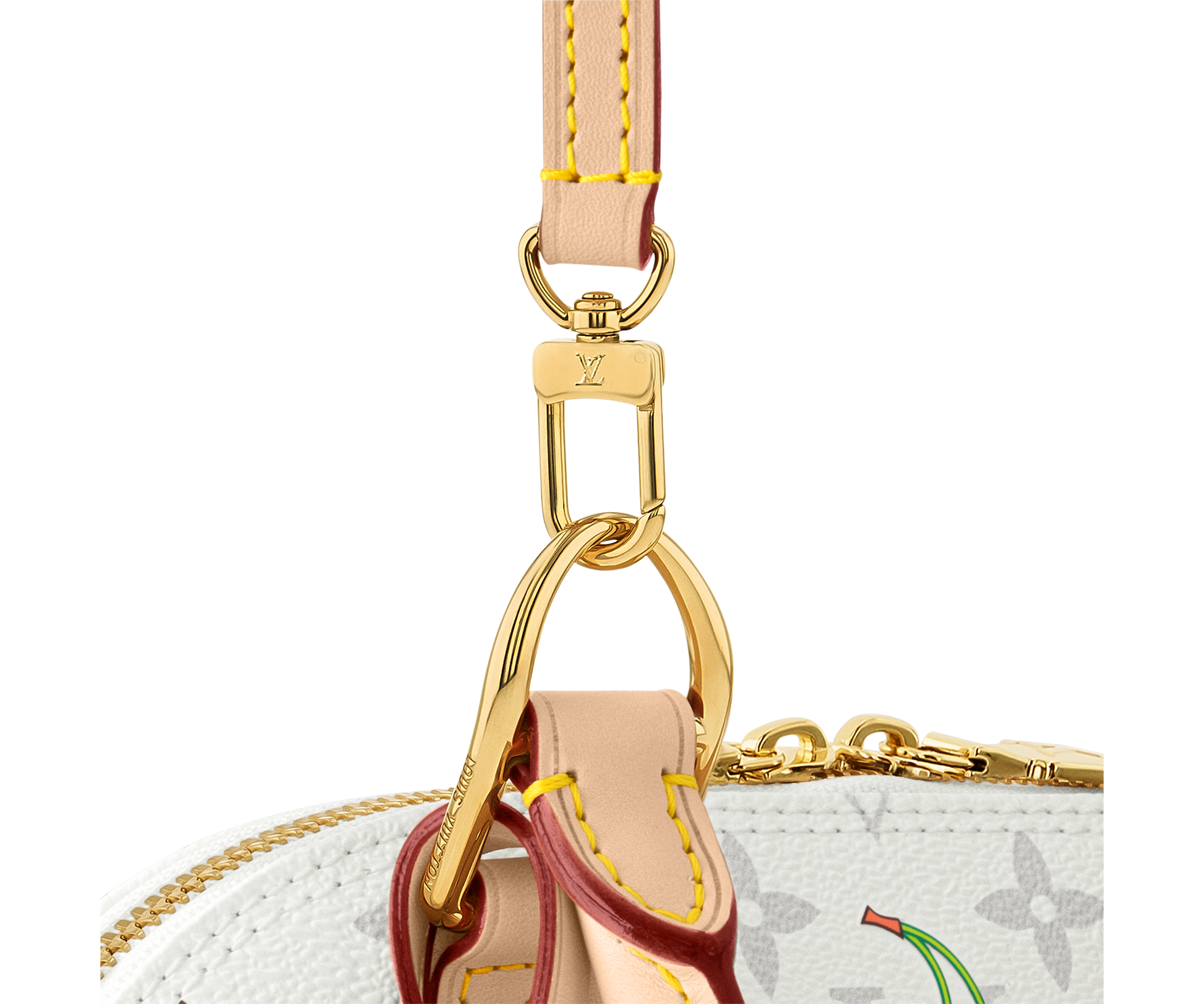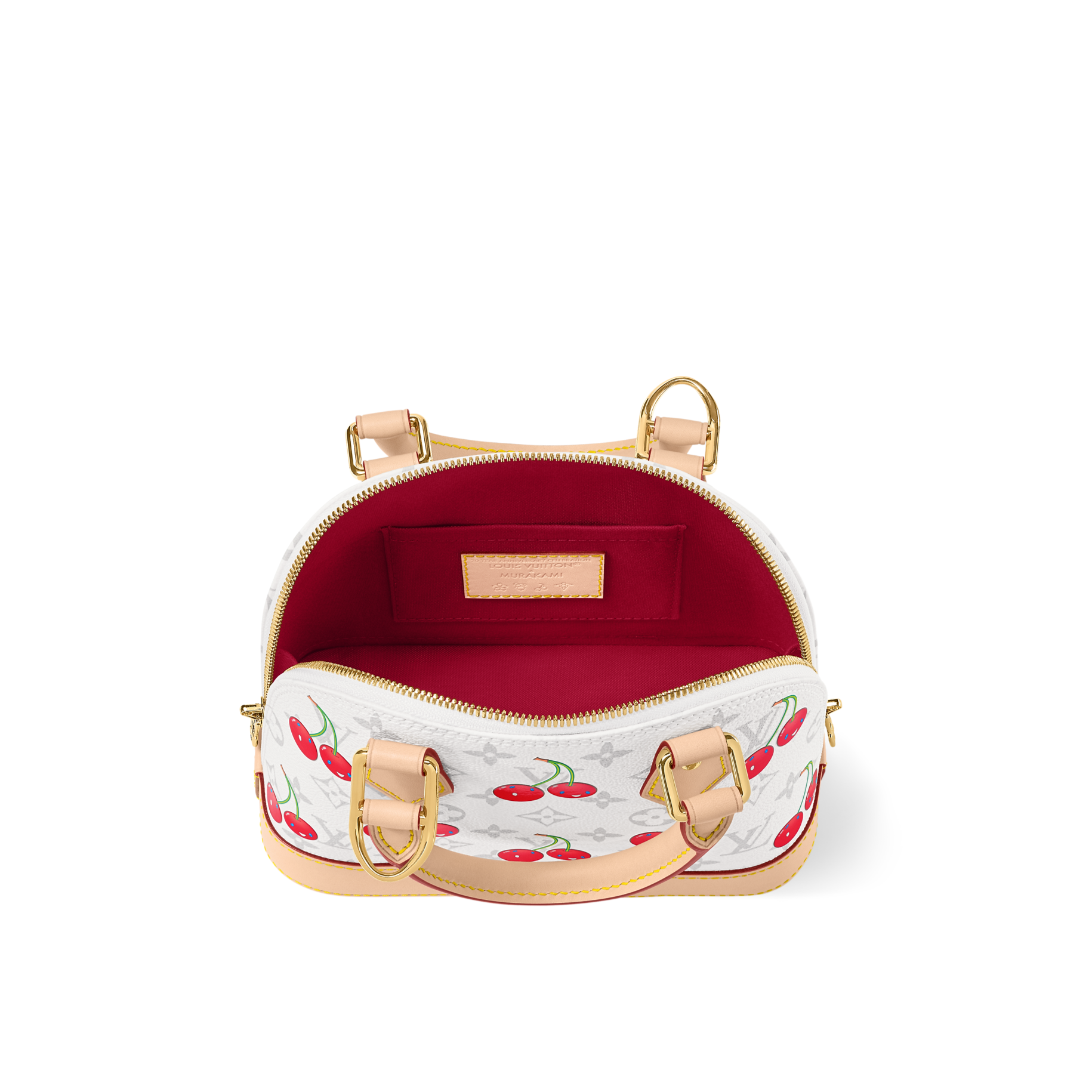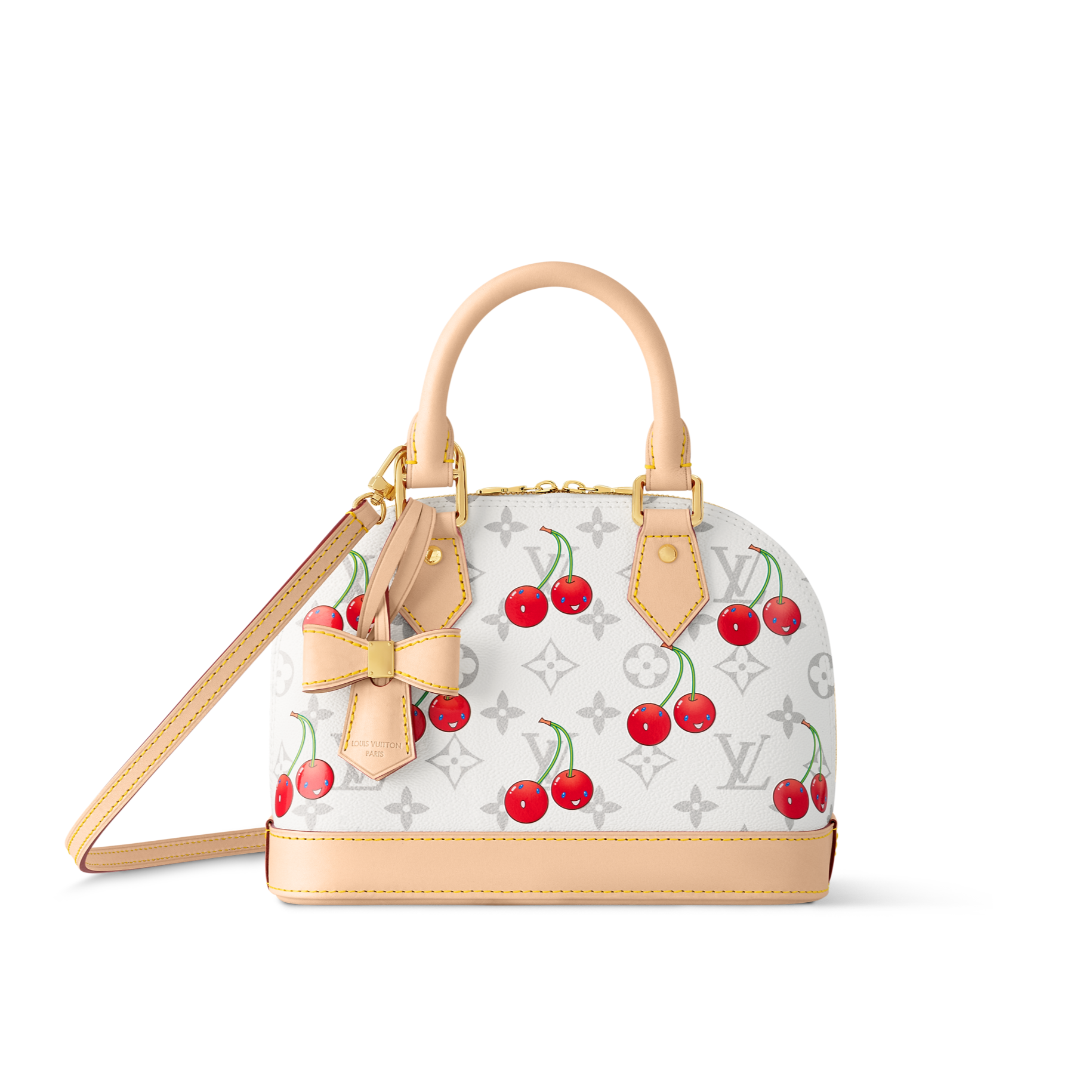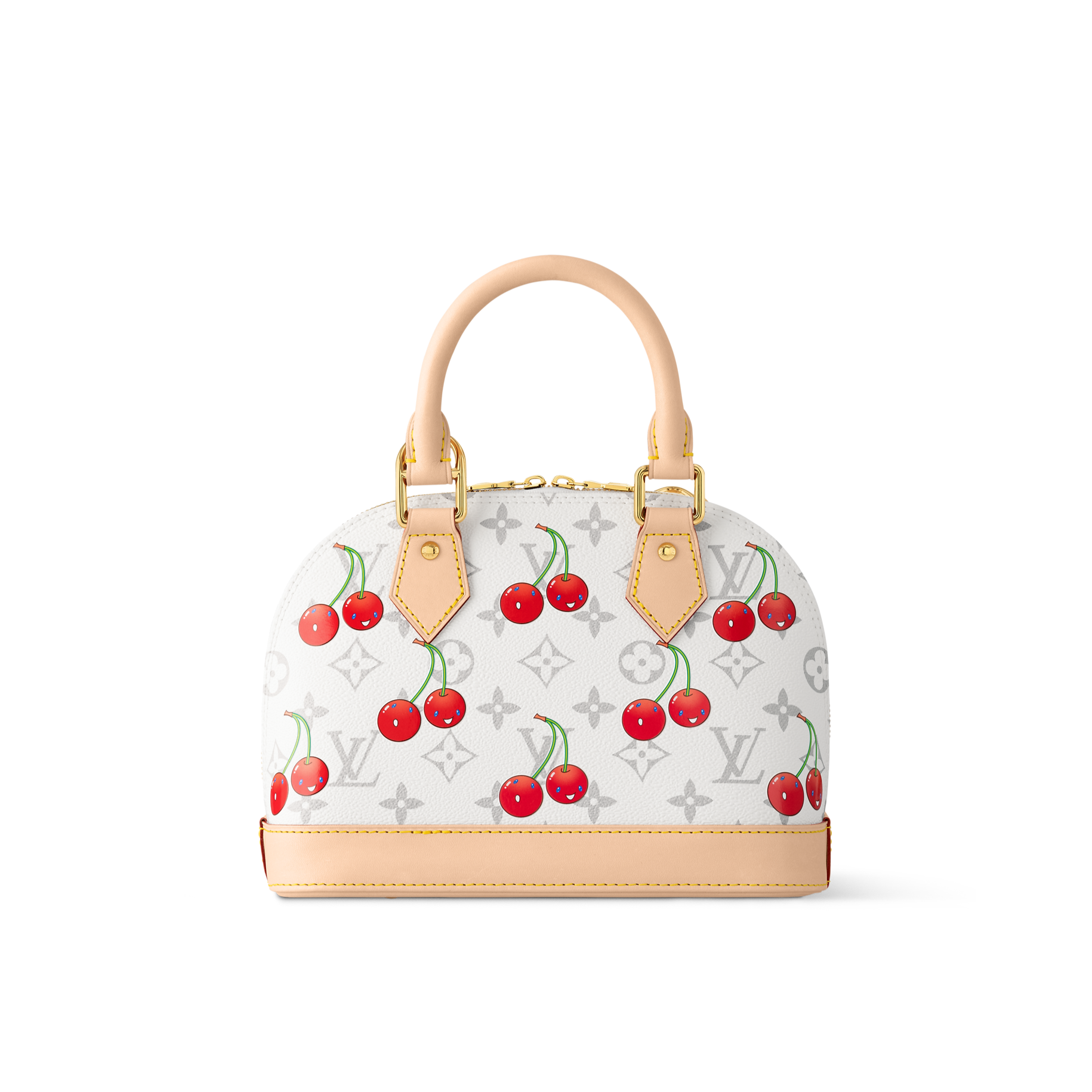 The Alma BB handbag makes a chic statement as part of the joyful re-edition of the Louis Vuitton x Murakami collection. The Art Deco-inspired silhouette catches the eye in the House’s signature Monogram coated canvas embellished with the Japanese artist’s exuberant cherry motifs in bold tones. Emblematic natural leather highlights the elegant Toron top handles, the bottom and the playful bow-shaped keybell.
