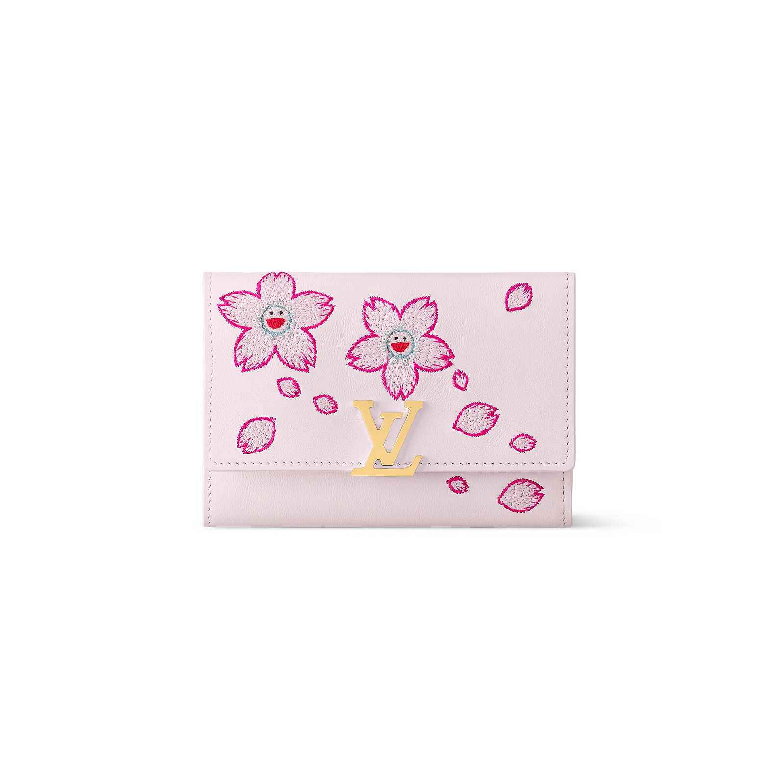 Cheerful codes from the re-edition of the Louis Vuitton x Murakami collection uplift this Capucines wallet. It is crafted from Lambskin leather in a soft shade of pink, which complements the refreshing tones of embroidered Cherry Blossom motifs in the world-renowned Japanese artist’s signature playful style. The snap-button closure is highlighted with golden LV Initials for a chic House touch. The inside is organized with multiple slots and pockets for cards, bills and coins.