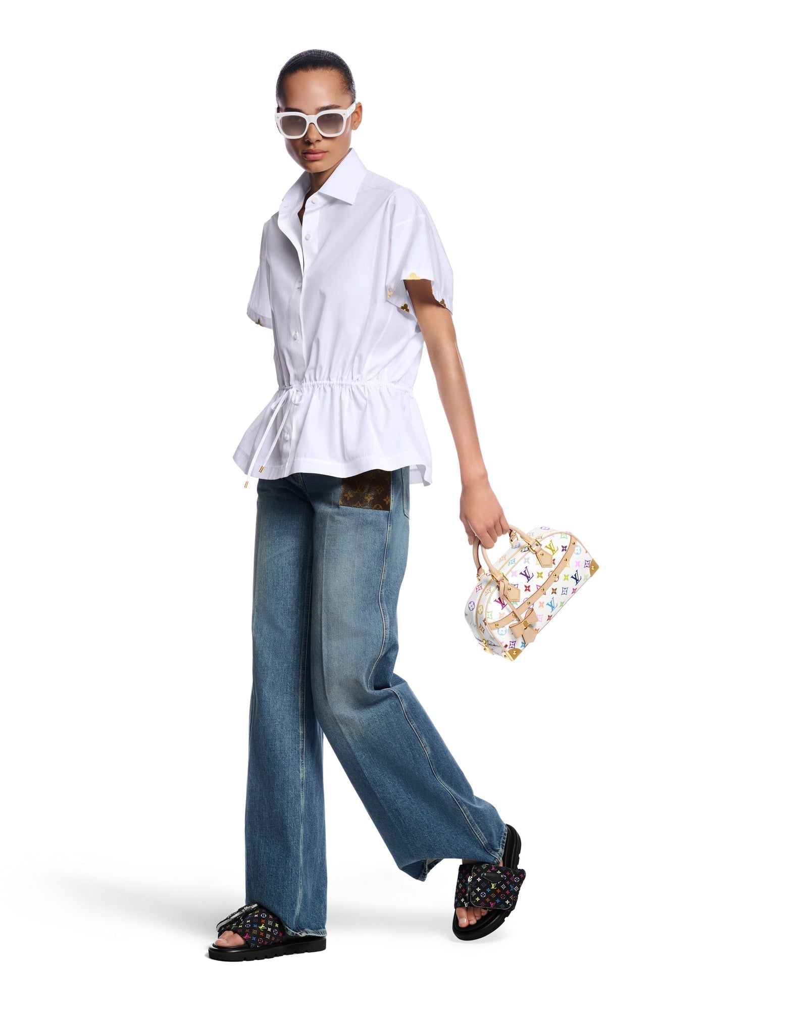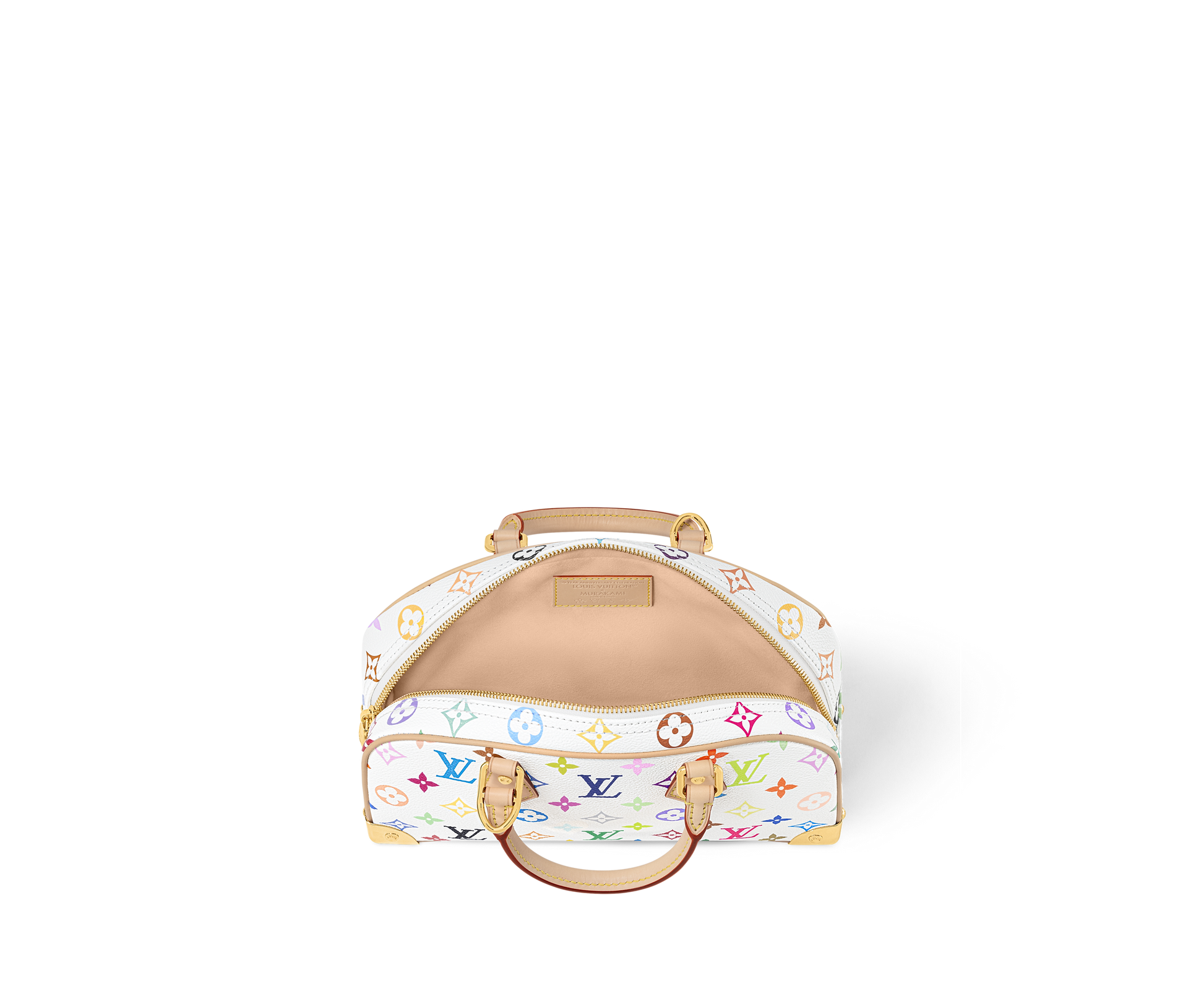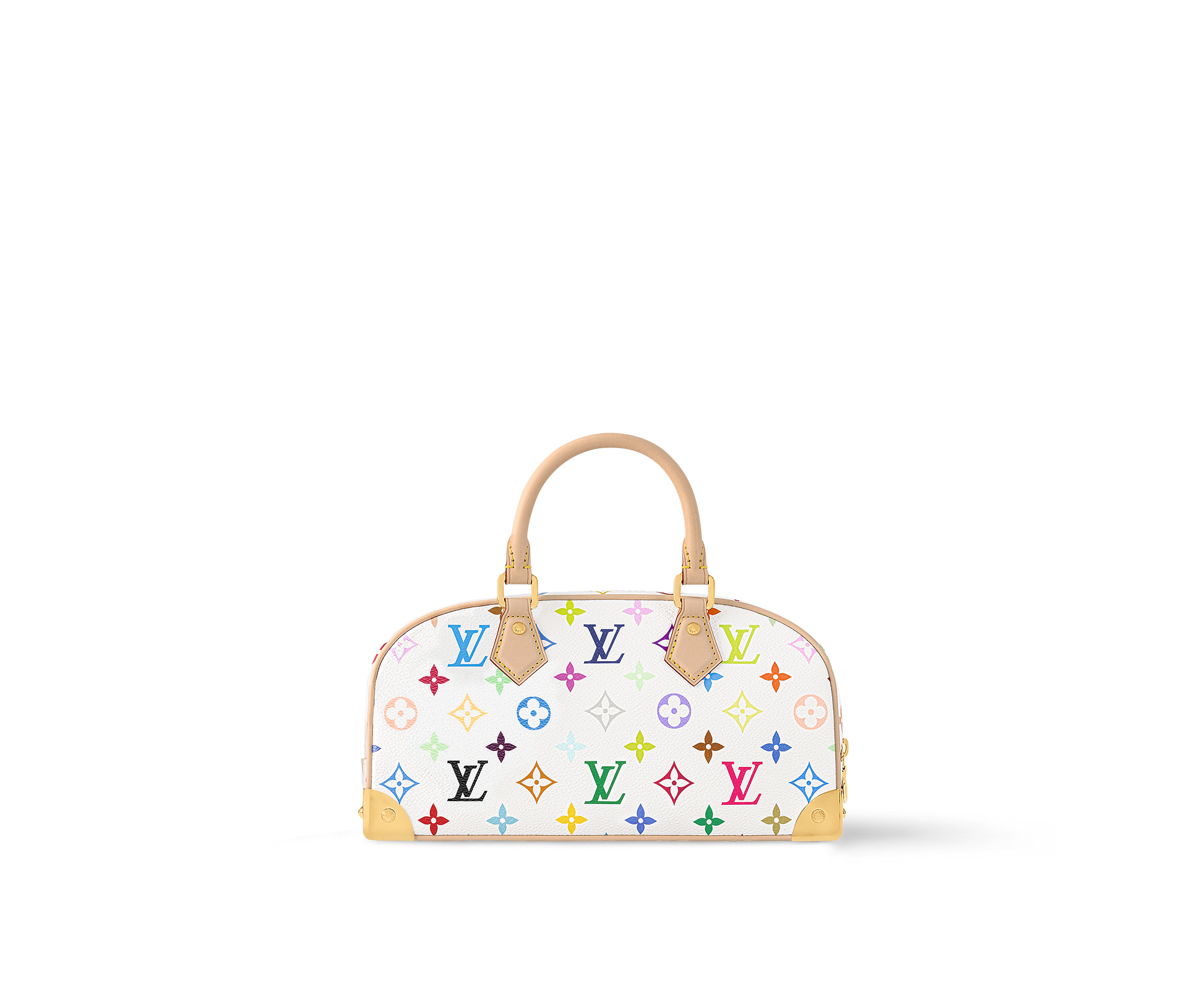 As part of the re-editon of the Louis Vuitton x Murakami collection, the Handbag East West is signed all over with a Monogram motif that has been joyfully reimagined with the Japanese artist’s signature rainbow hues. The sleek east-west design is detailed with emblematic natural cowhide leather details, including two top handles, a rebellious studded lateral band, an adjustable shoulder a removable strap and an exclusive LV x TM keybell, while golden corners nod to the House’s heritage travel trunks.