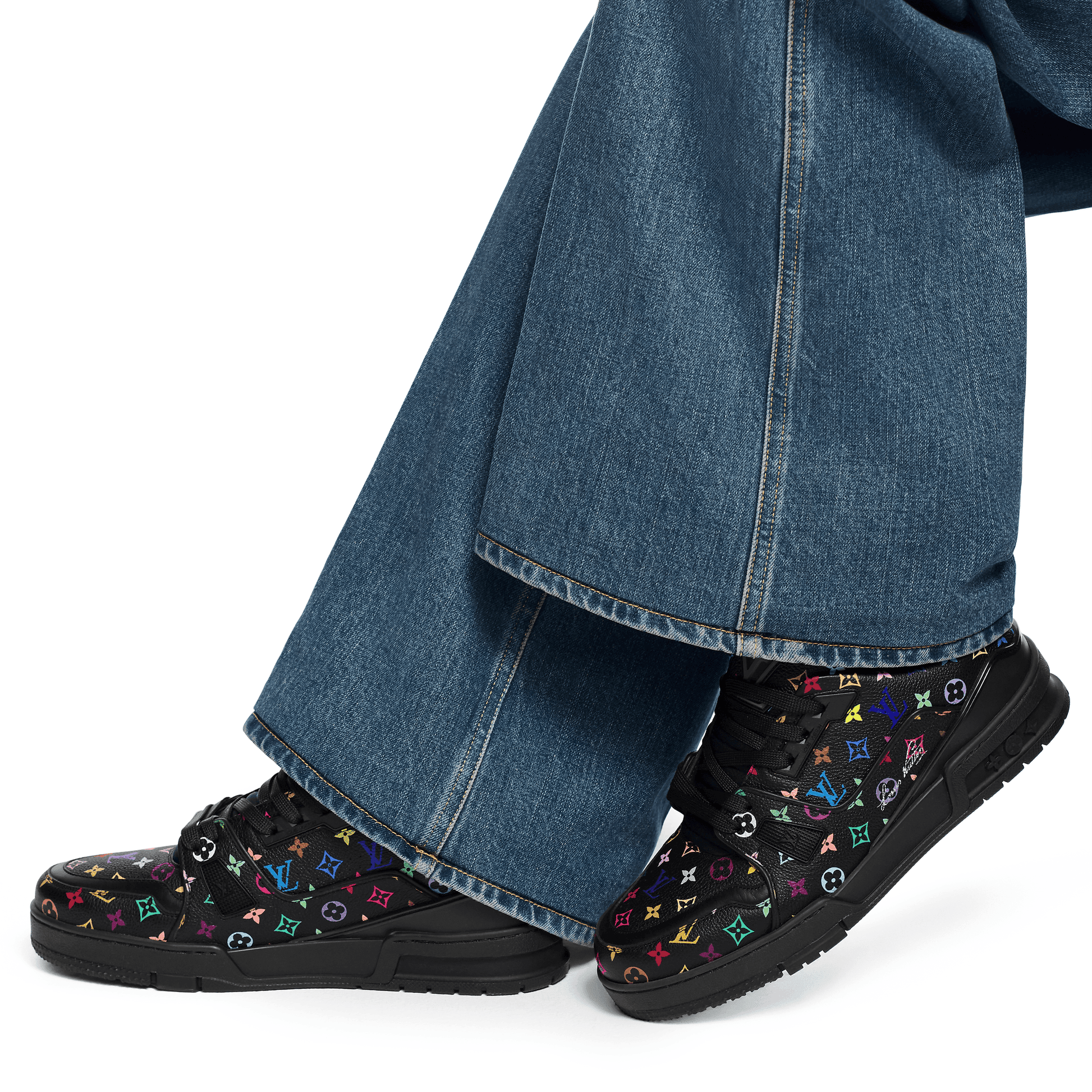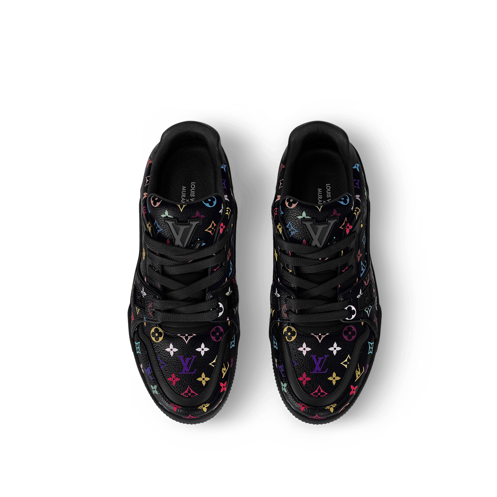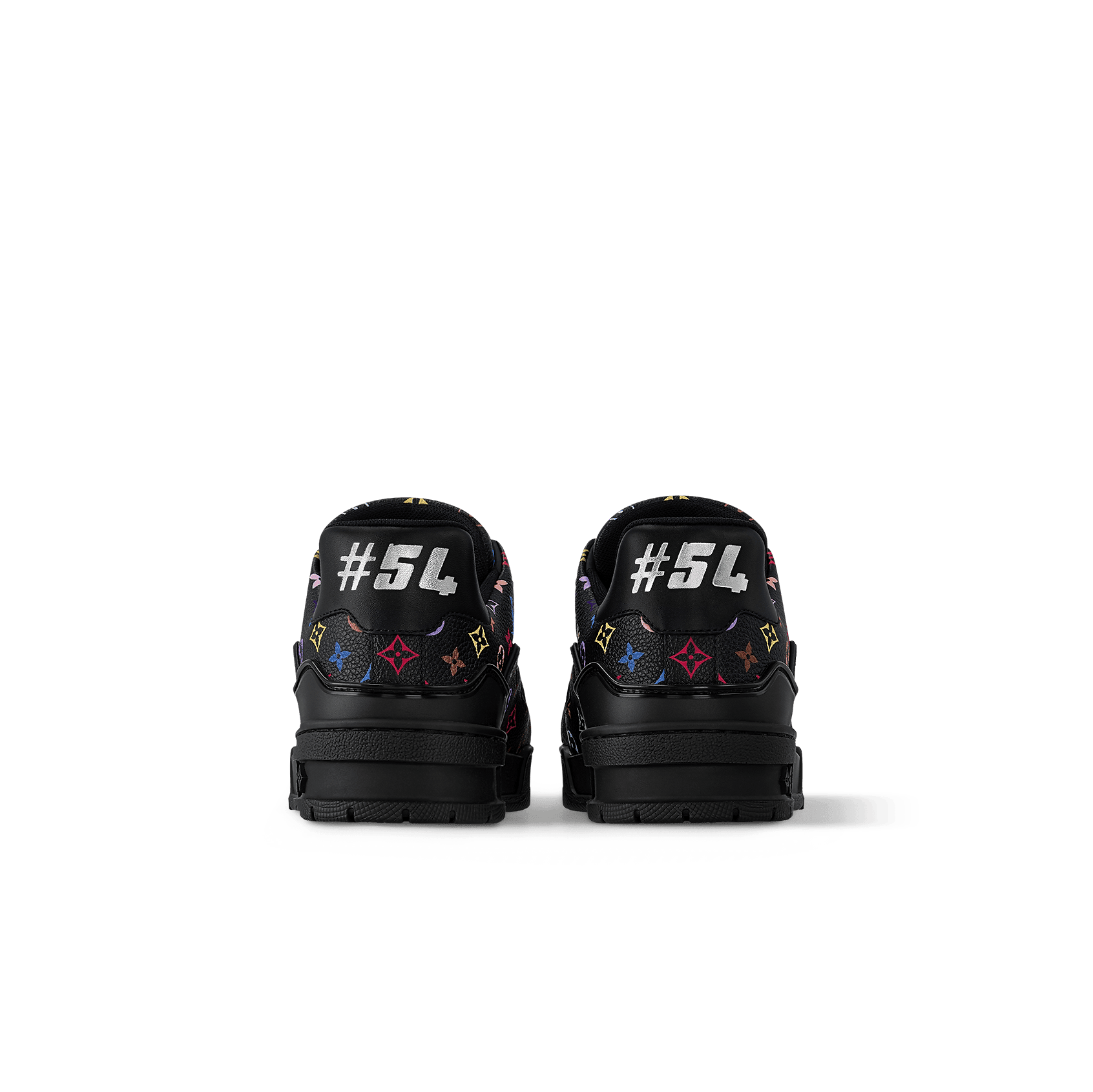 The iconic LV Trainer sneaker makes a fresh statement in grained calf leather featuring an allover print of a multicolored Monogram motif from the re-edition of the Louis Vuitton x Murakami collection, inspired by the artist’s exuberant aesthetic. Informed by vintage sporty styles, the upper is detailed with a cursive Louis Vuitton signature, while the back is printed with the number 54 in reference to 1854, the year the House was founded.