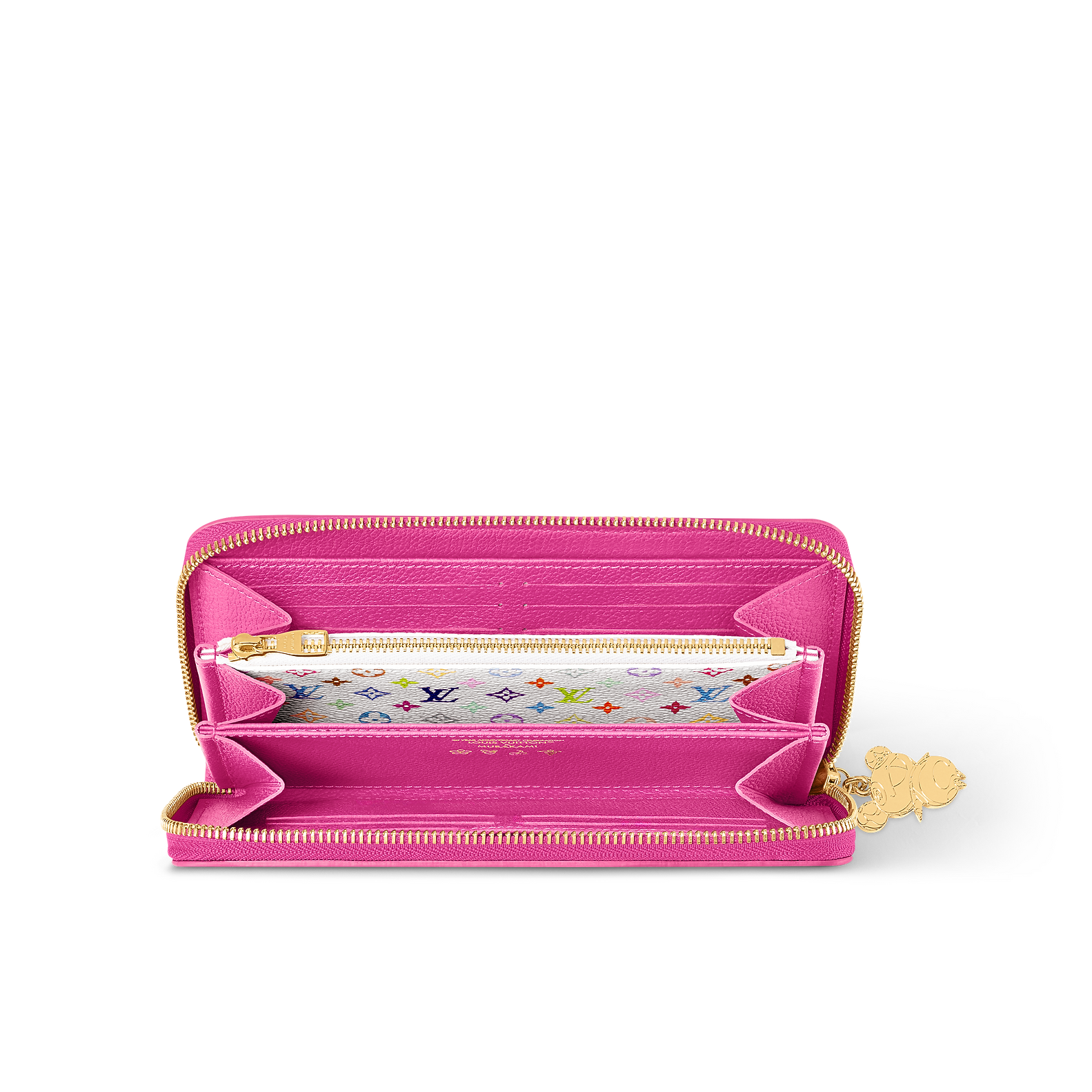 The Zippy wallet is joyfully uplifted with signature codes from the cross-category Louis Vuitton x Murakami collection. It is crafted from Monogram Empreinte leather in an exuberant shade of pink taken from the artist’s go-to rainbow palette, which also accents the Monogram coated canvas on the inside. It is organized into multiple compartments to store bills, cards and receipts, and is fastened with a golden zipper trimmed with a playful Panda-shaped pull.