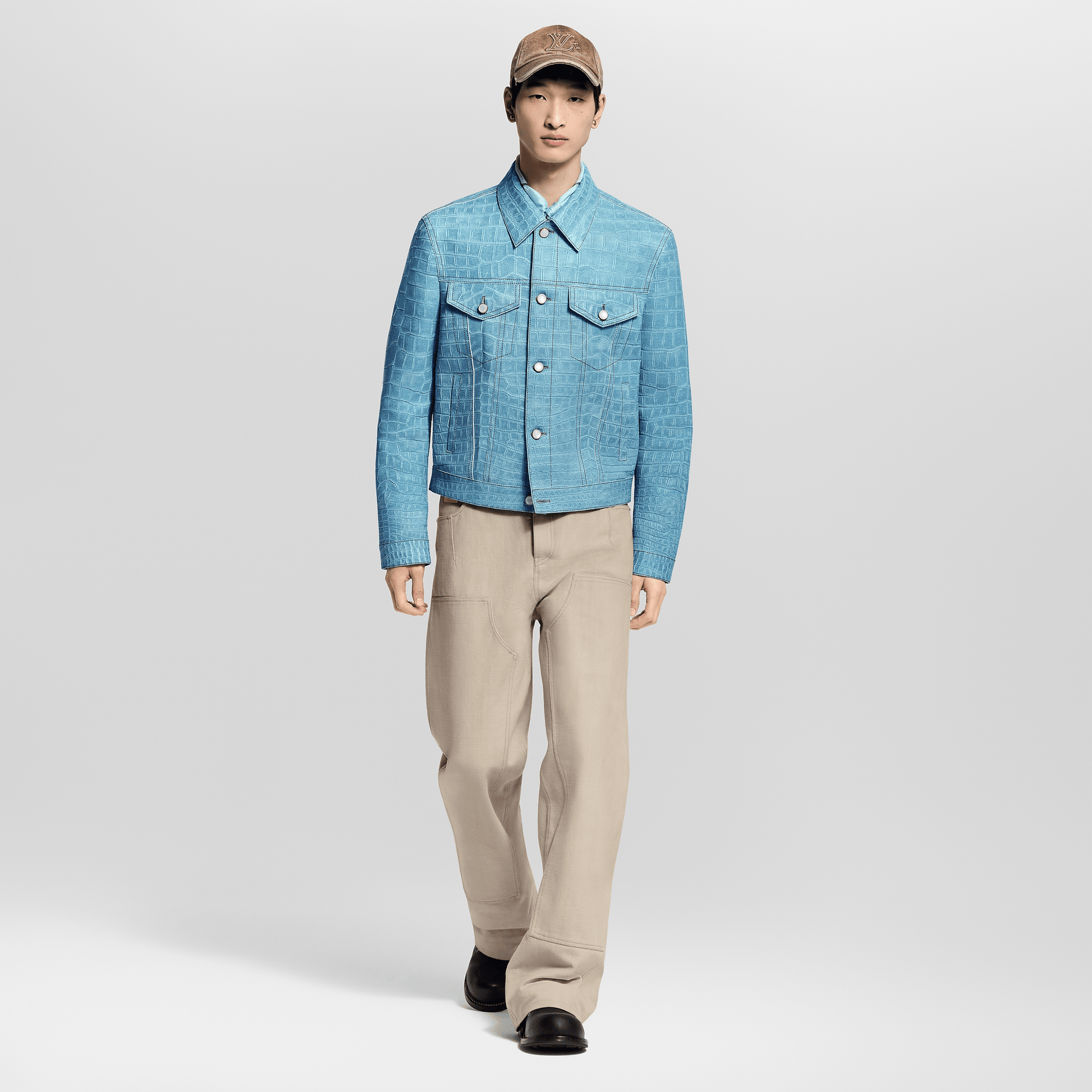 Luxurious crocodile skin elevates this casual trucker silhouette from the Fall-Winter 2025 runway. Inspired by this collection’s rich array of denim looks, this made-to-order piece is meticulously crafted with a trompe l’oeil washed indigo denim effect. A Mini Damier jacqueron signs the back, while pearl-effect buttons lend a dandy finishing touch.