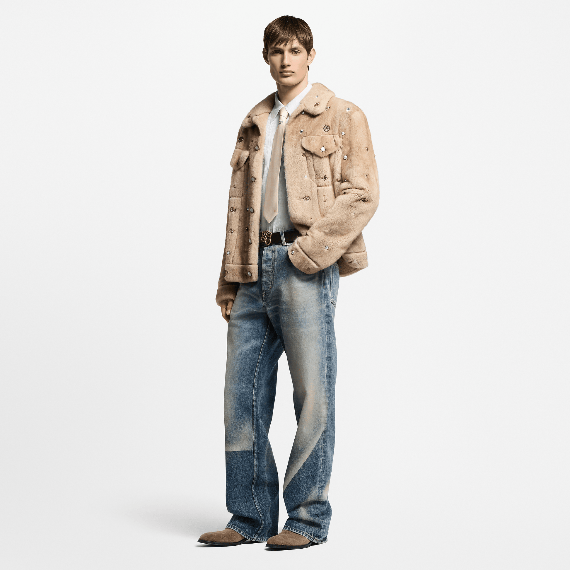 The classic denim trucker jacket gets a luxurious reinvention in mink for Spring-Summer 2025. The deep fur is adorned with jewel-like signature ornaments that are sewn on by hand. Fully lined with silk, this made to order design epitomizes the modern dandy spirit of this collection.