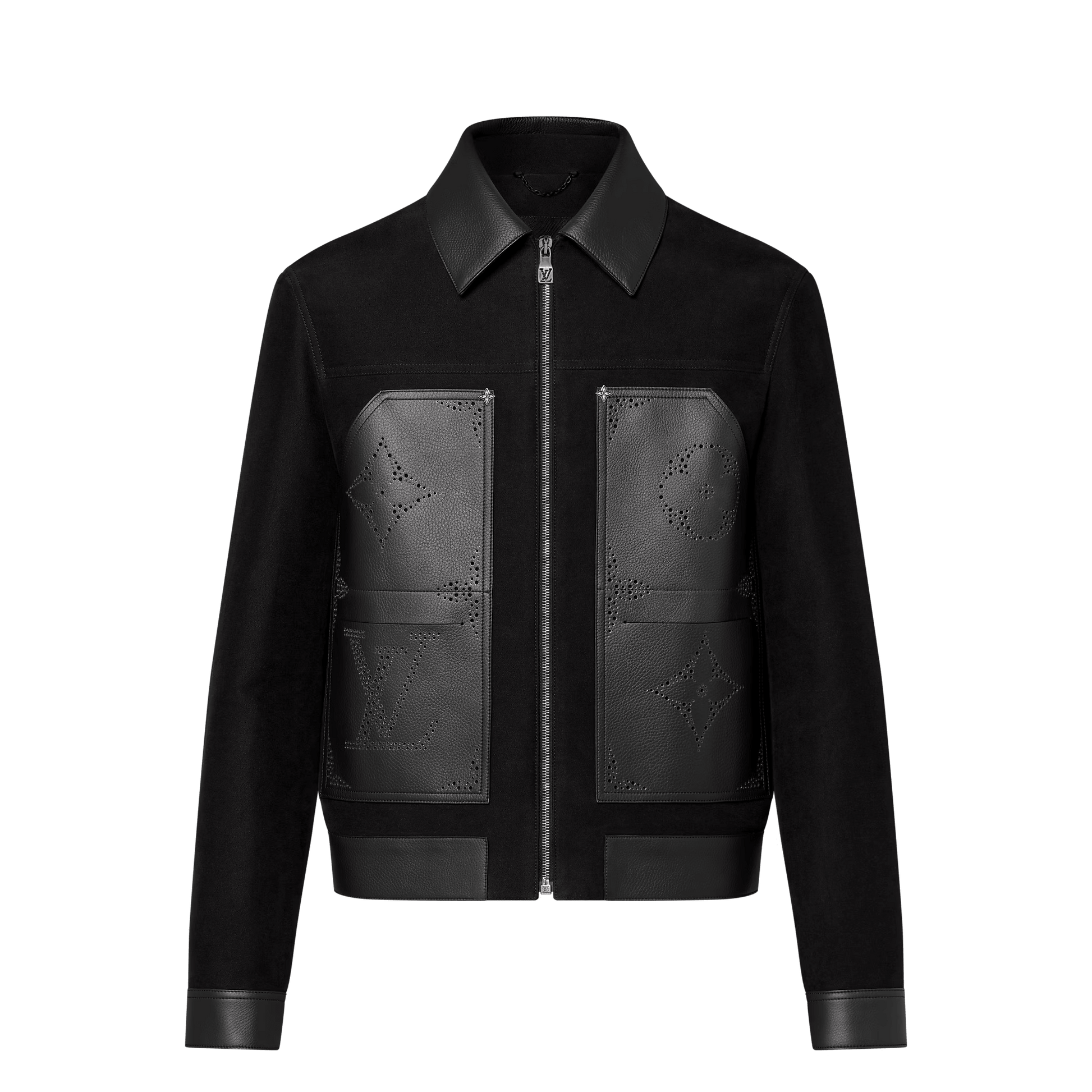 This chic black blouson elevates a workwear silhouette with Monogram-adorned calfskin leather details. The soft moleskin body features leather pockets on the front and a leather yoke on the back, which have been meticulously perforated with holes in varying sizes to create a delicate Monogram Macro motif. Both timeless and modern, this is a perfect buy-now-wear-now piece.