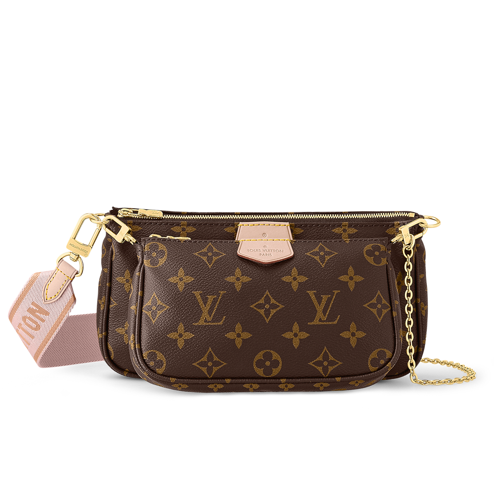 The Multi Pochette Accessoires is a hybrid cross-body bag with multiple pockets and compartments that brings together a Pochette Accessoires, a Mini Pochette Accessoires and a Round Coin Purse. Fashioned from Monogram canvas with a mini Monogram pattern on the sides of the two pochettes, it has both a removable gold-tone chain and an adjustable Louis Vuitton inscribed Jacquard strap for multiple carrying options.