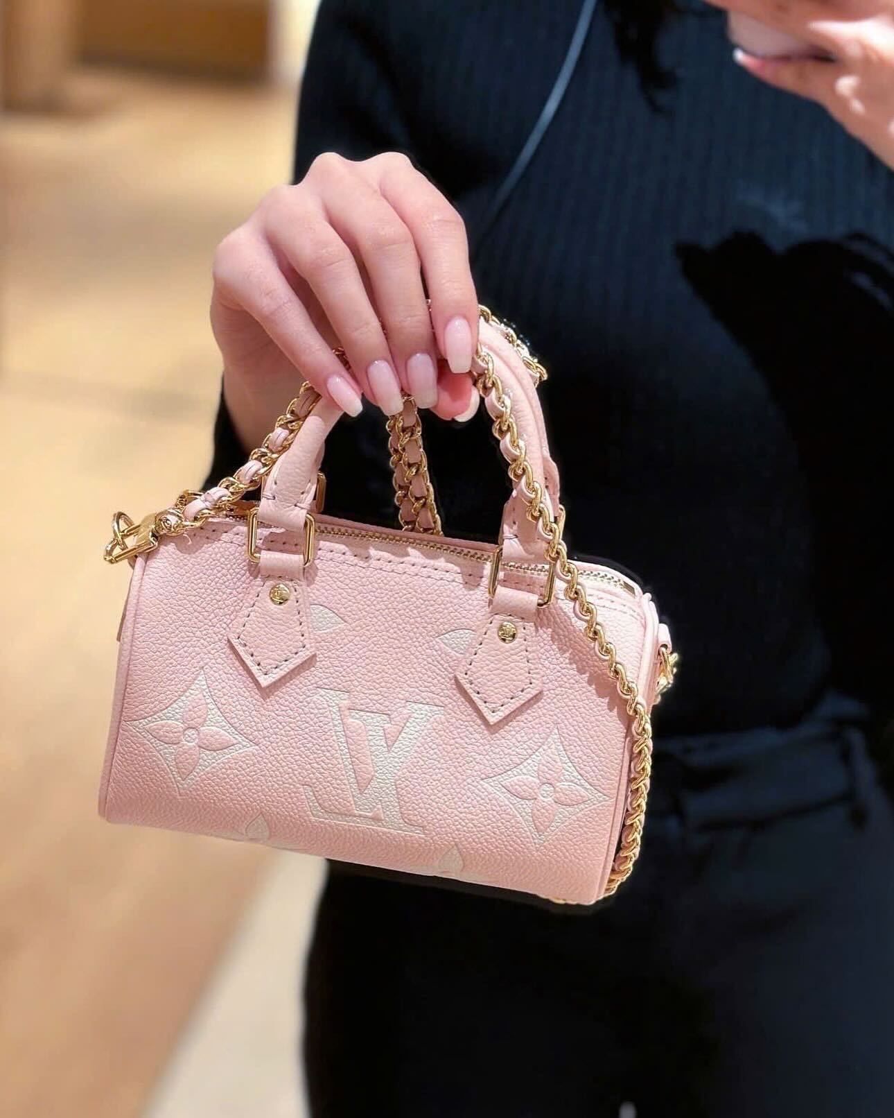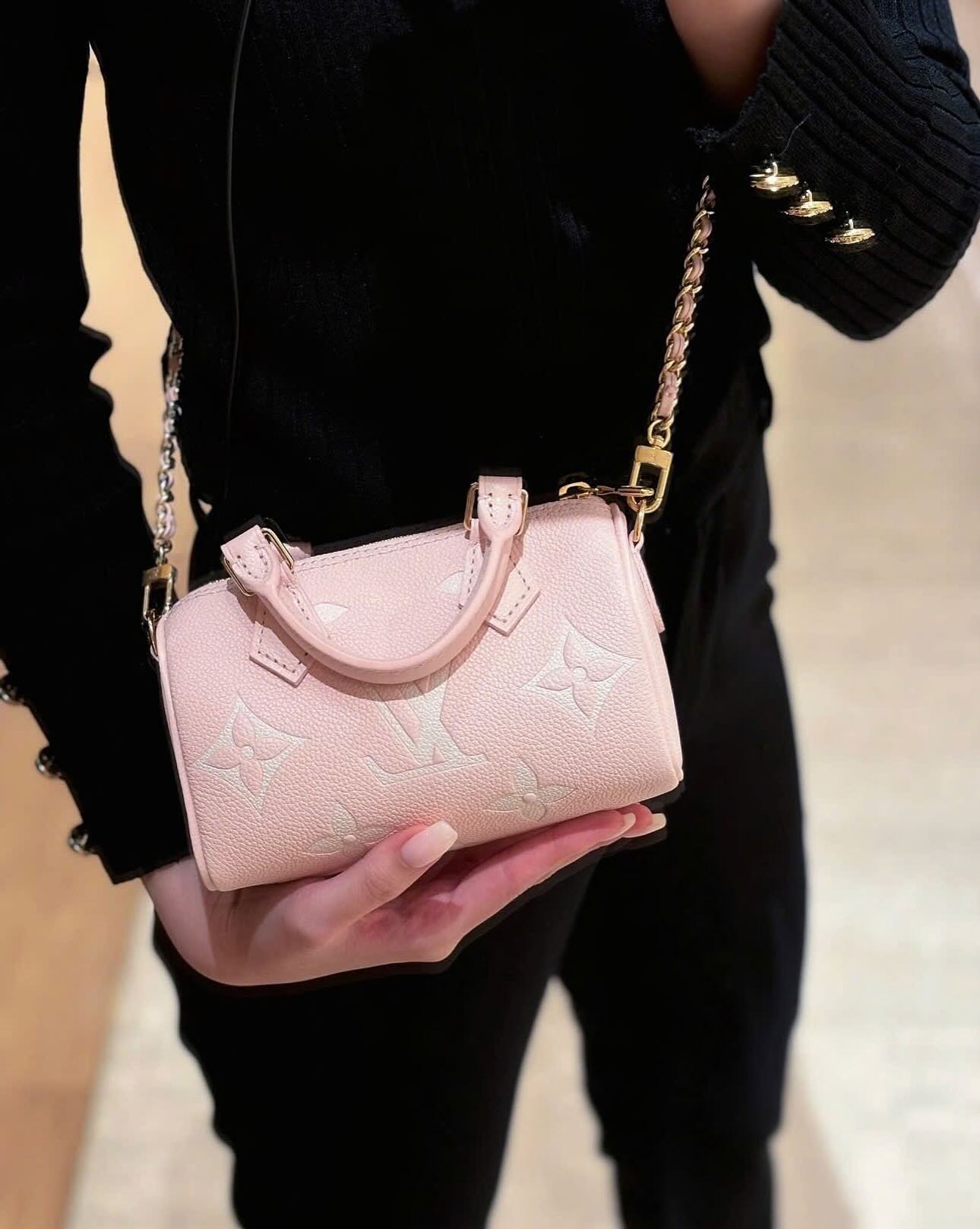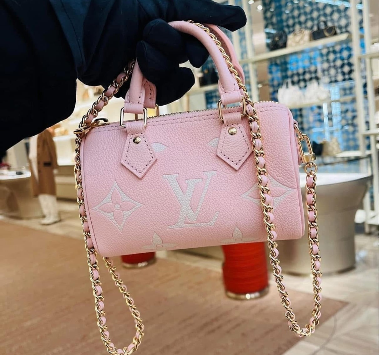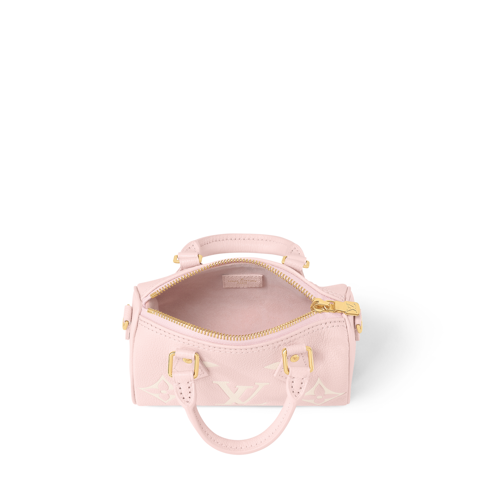 This contemporary edition of the Nano Speedy offers a feminine color palette, which contrasts beautifully with gold-toned hardware. The compact design is crafted from the House’s Monogram Empreinte leather and features a removable laced chain, offering multiple carry options. Use it store day-to-evening essentials.