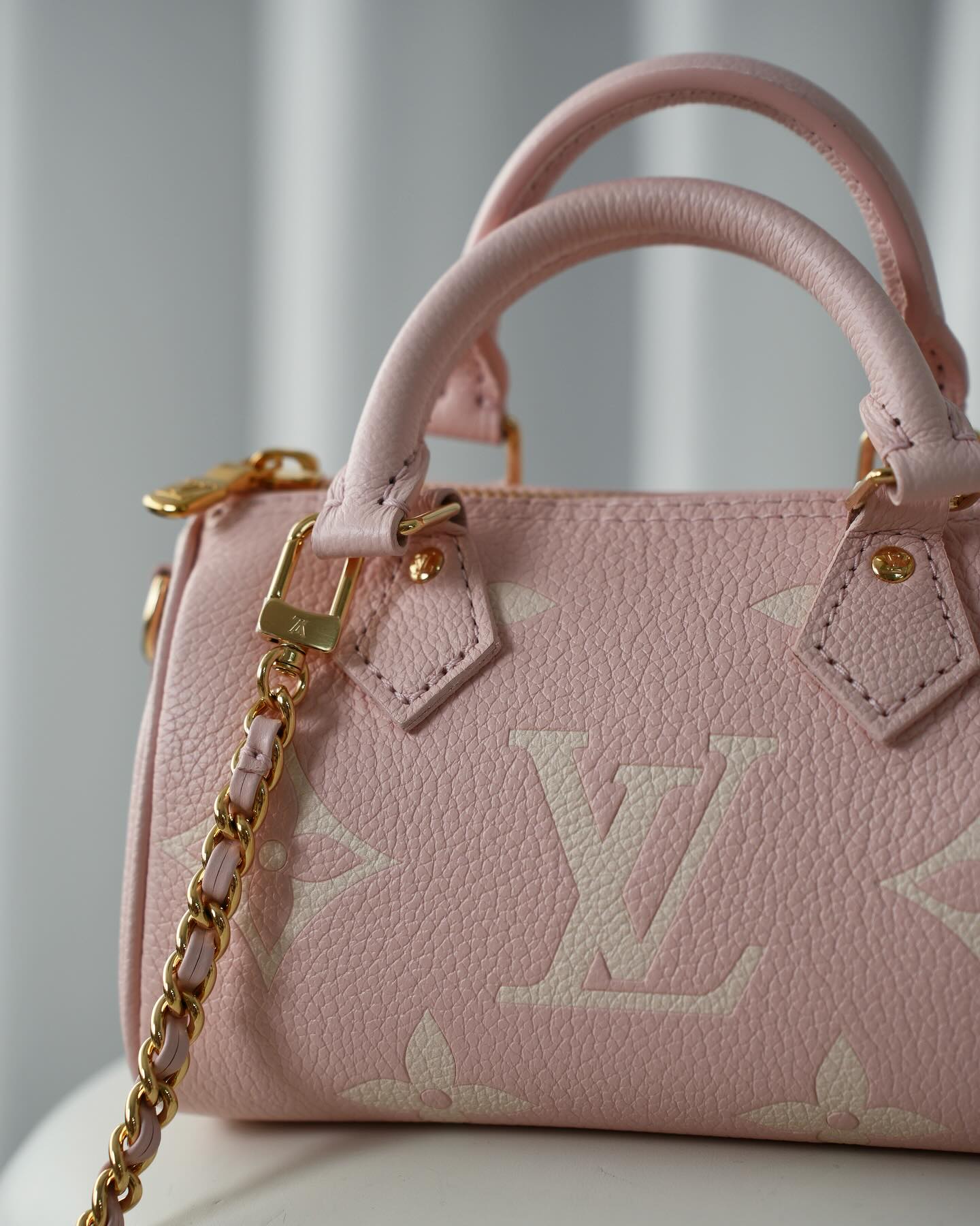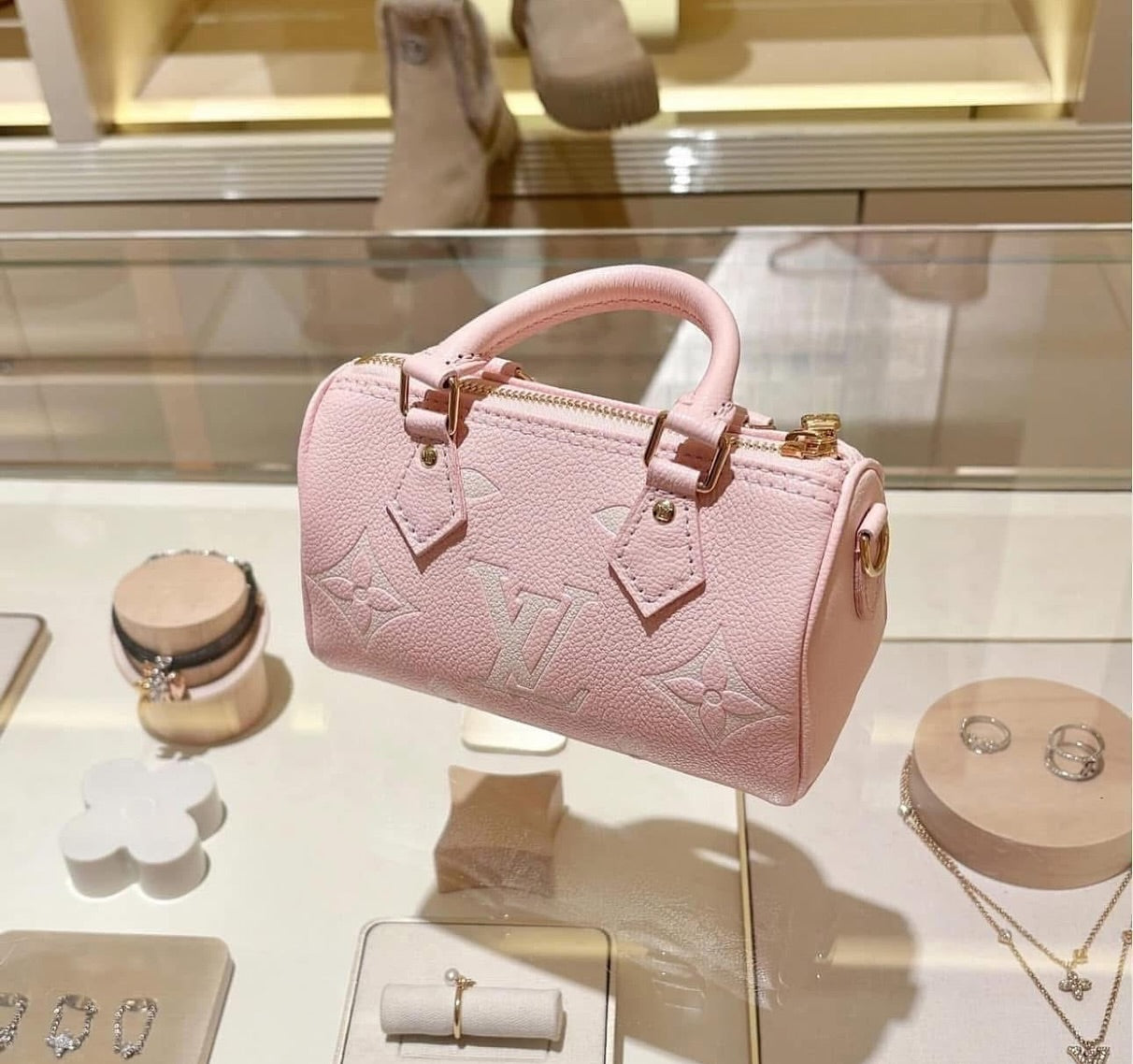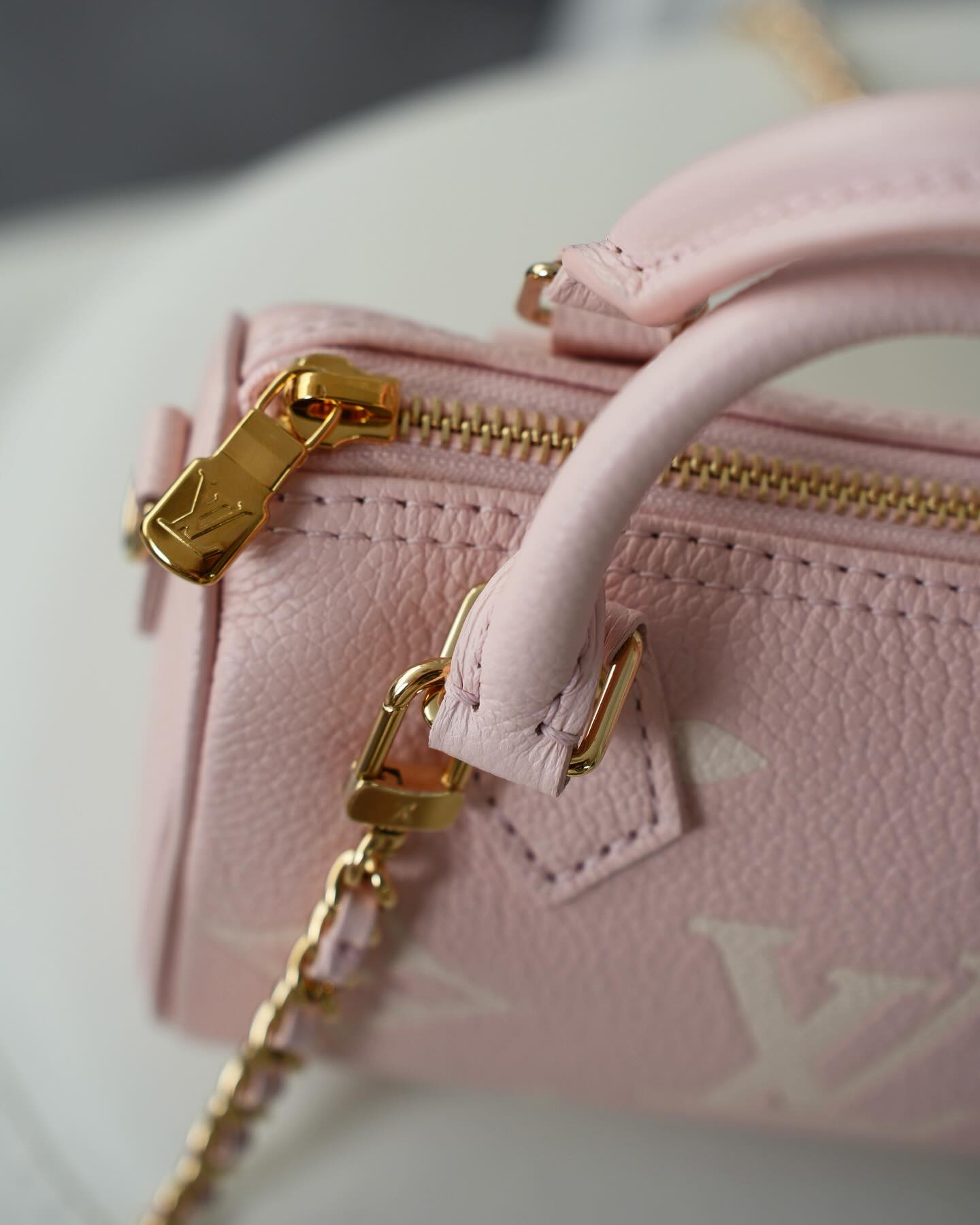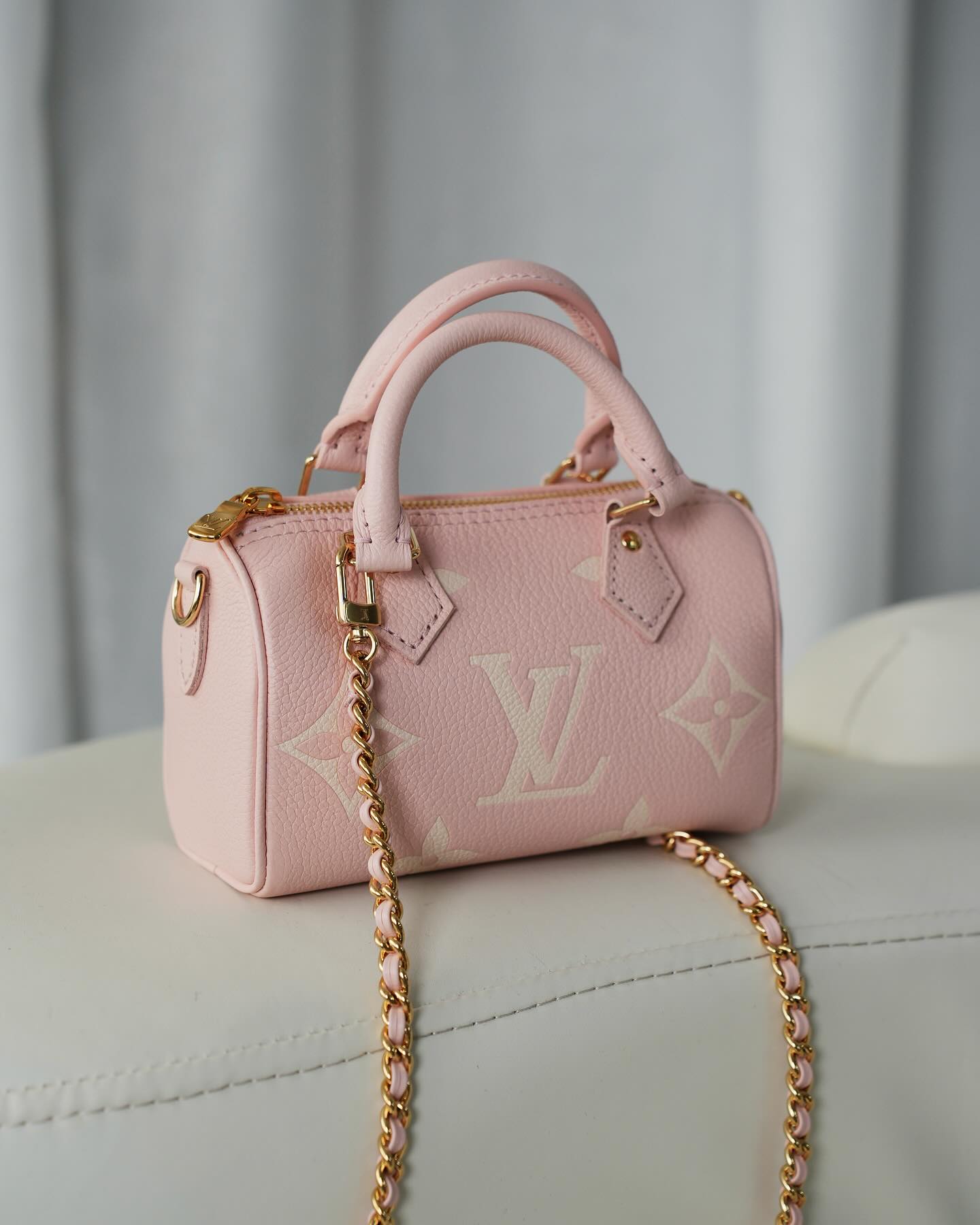 This contemporary edition of the Nano Speedy offers a feminine color palette, which contrasts beautifully with gold-toned hardware. The compact design is crafted from the House’s Monogram Empreinte leather and features a removable laced chain, offering multiple carry options. Use it store day-to-evening essentials.