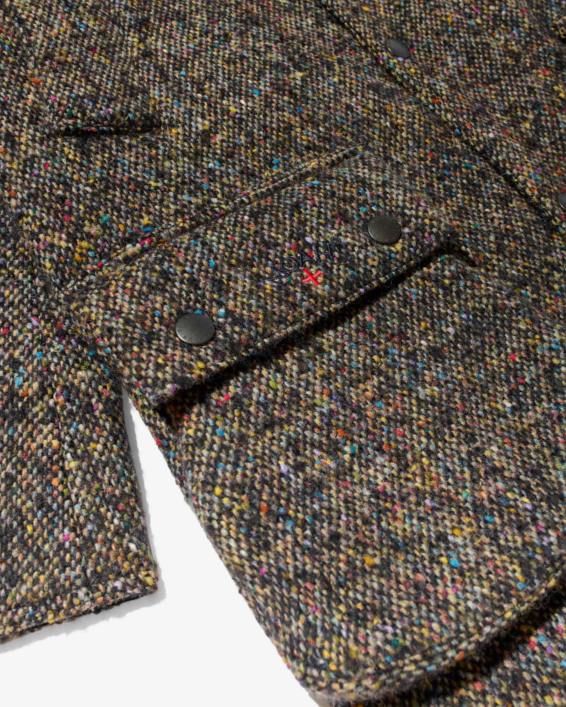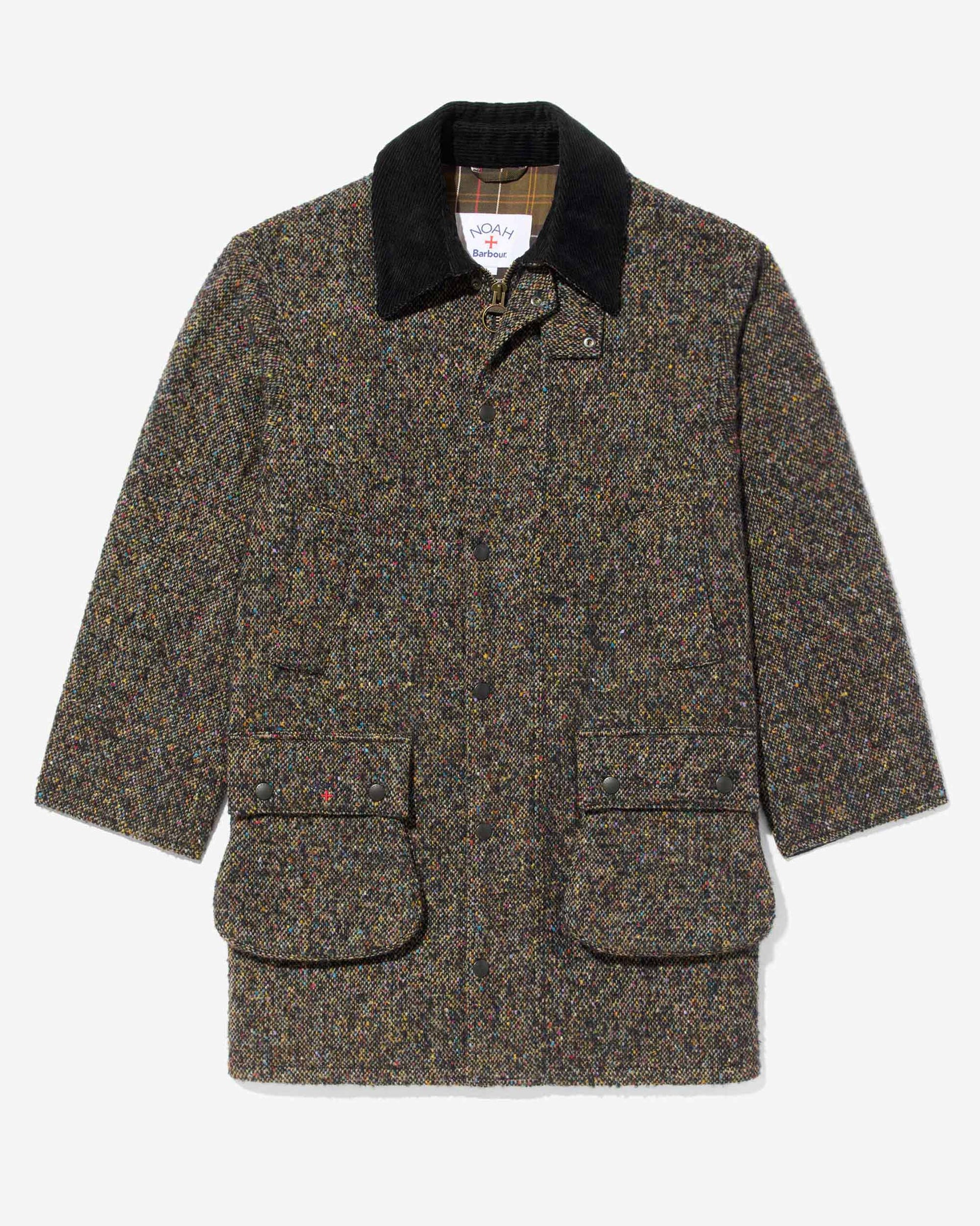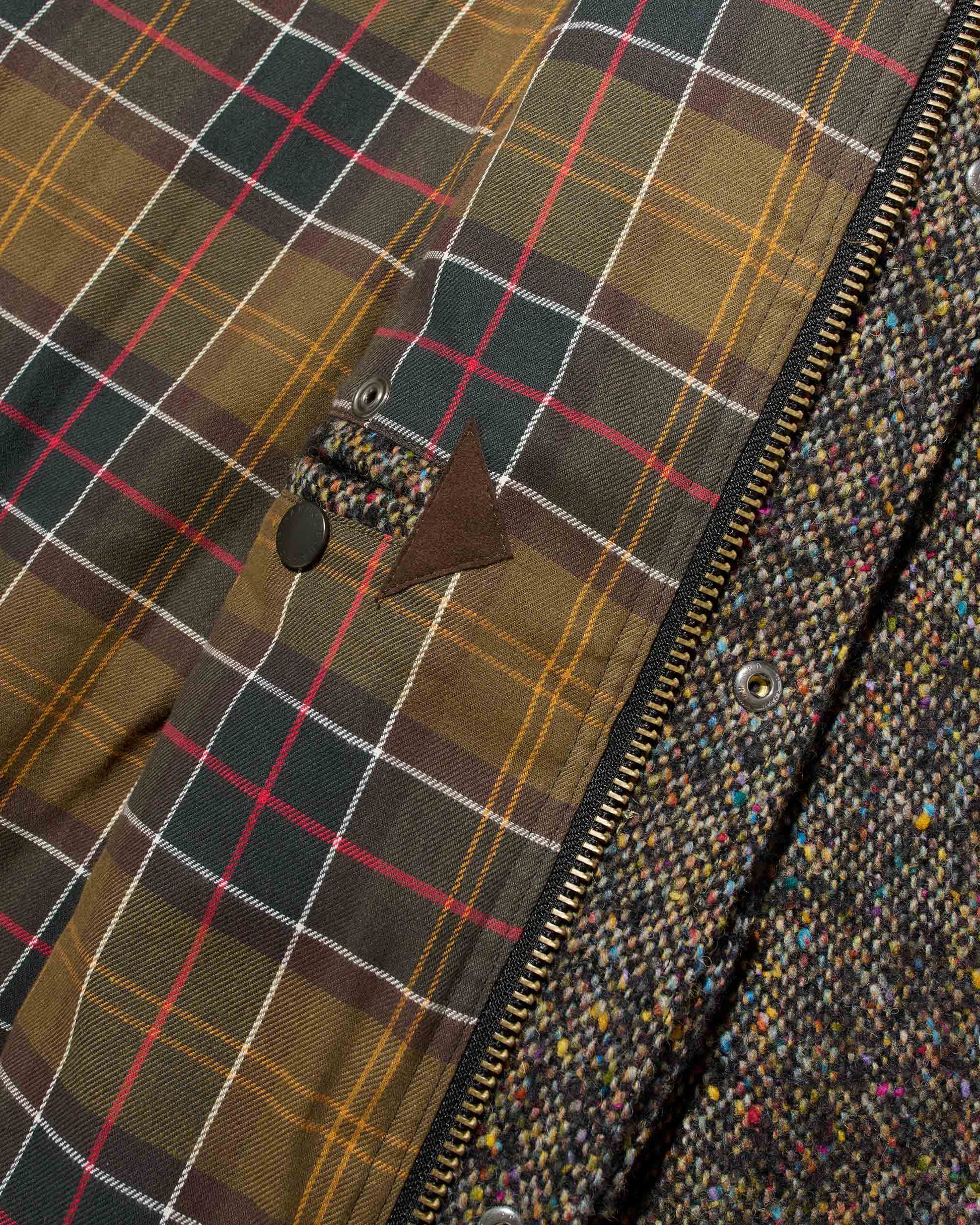 Made exclusively for Noah by Barbour. Genuine Donegal wool shell from Magee. Cotton tartan lining and corduroy collar. Heavy-duty two-way metal zip. Snap storm flap and storm collar. Adjustable snap cuffs. Two bellowed front pockets with snap flaps and drain vents. Handwarmer storm pockets at waist. Two interior game pockets with detachable pocket bags. Embroidered logos on back lining and front pocket flaps. Nile is 6'2" and wearing size M