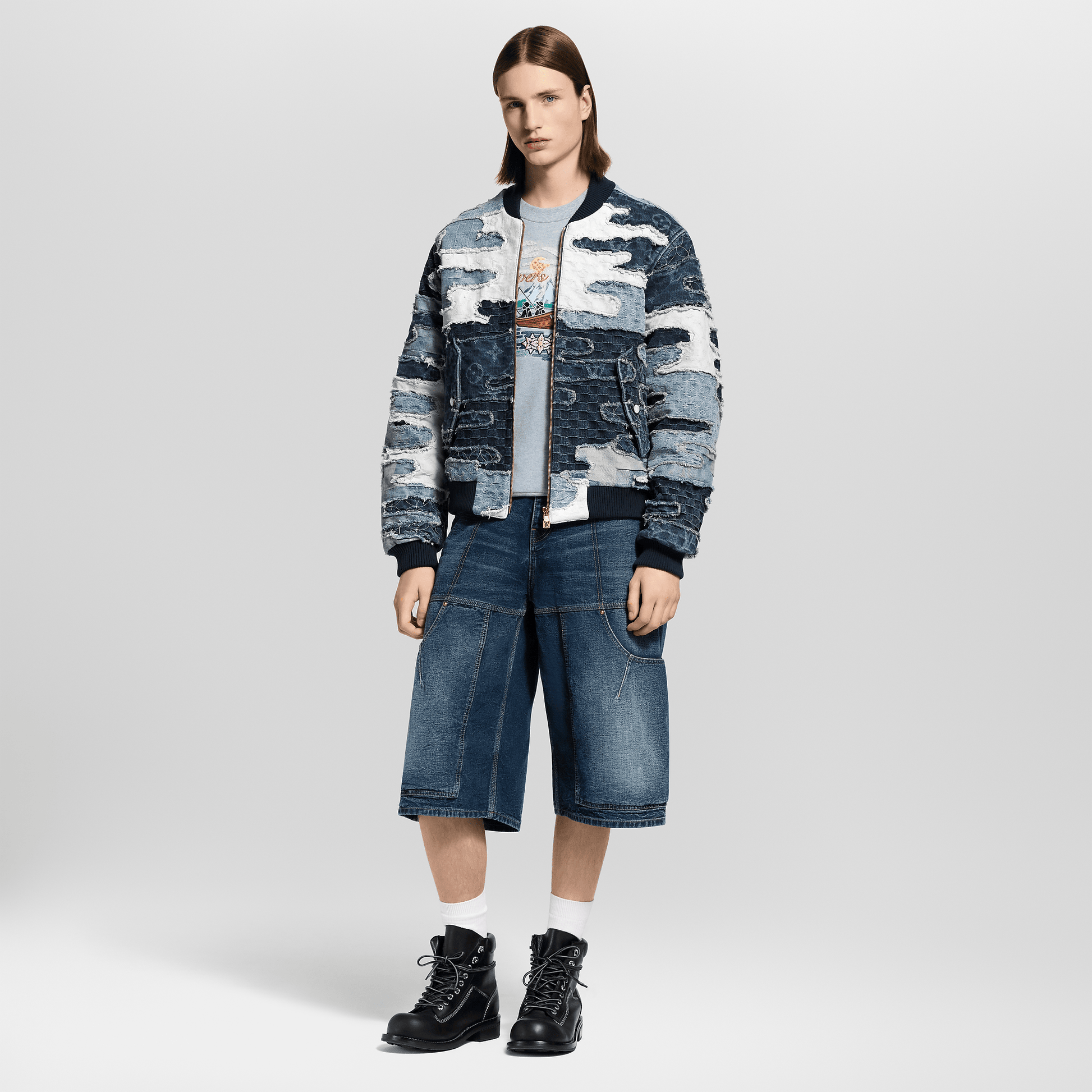 This patchworked denim bomber jacket is from the Fall-Winter 2025 collaboration between Pharrell and Nigo. Inspired by ancient mending techniques from Nigo’s native Japan, it is meticulously handcrafted from six different signature fabrics and assembled in a cloud-like collage with a textured vintage finish. Louis Vuitton embroidery signs the back, while pearly snap buttons adorn the pockets. Matching pants make a total look.