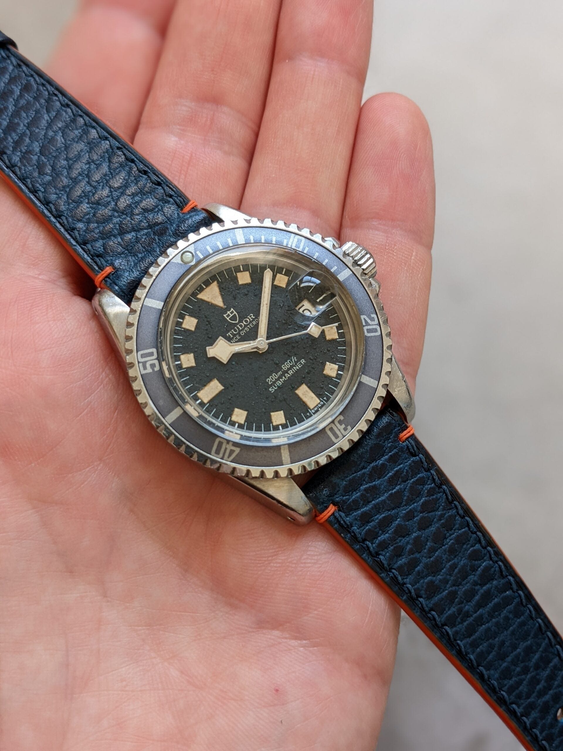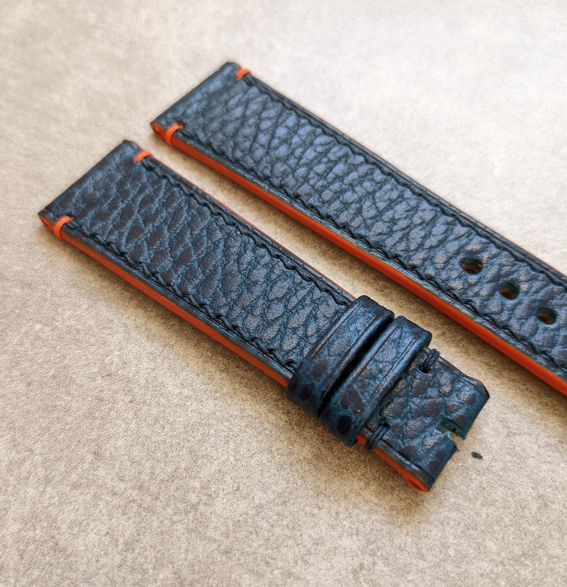 Pebbled Strap - Navy Blue - Orange Lug stitches & Edges
