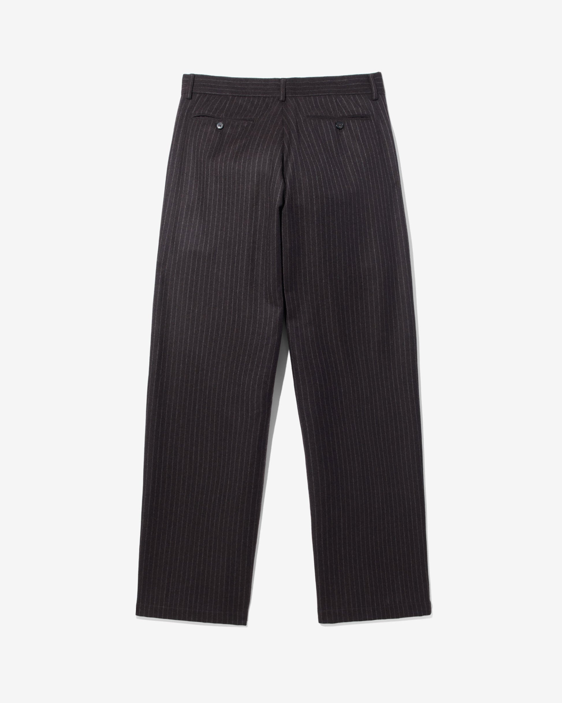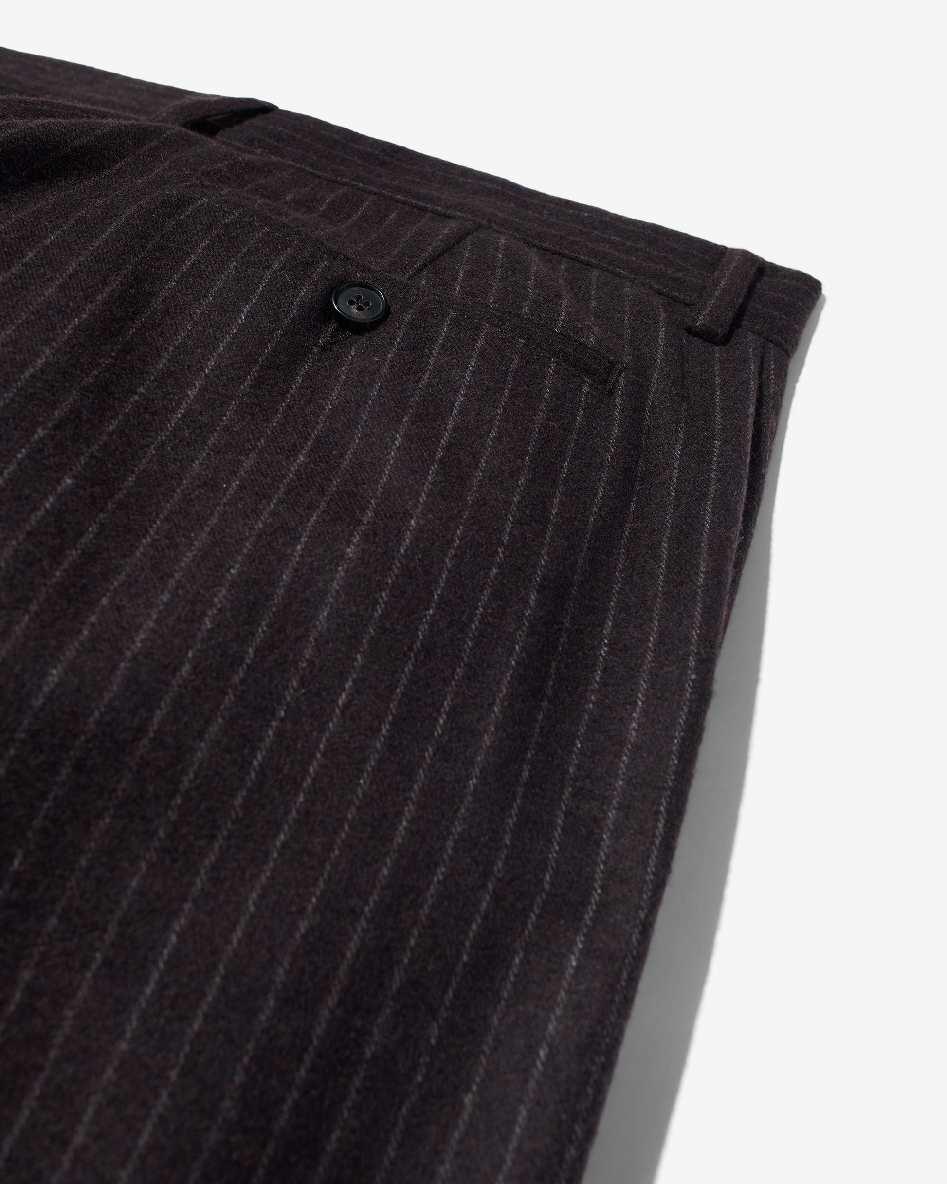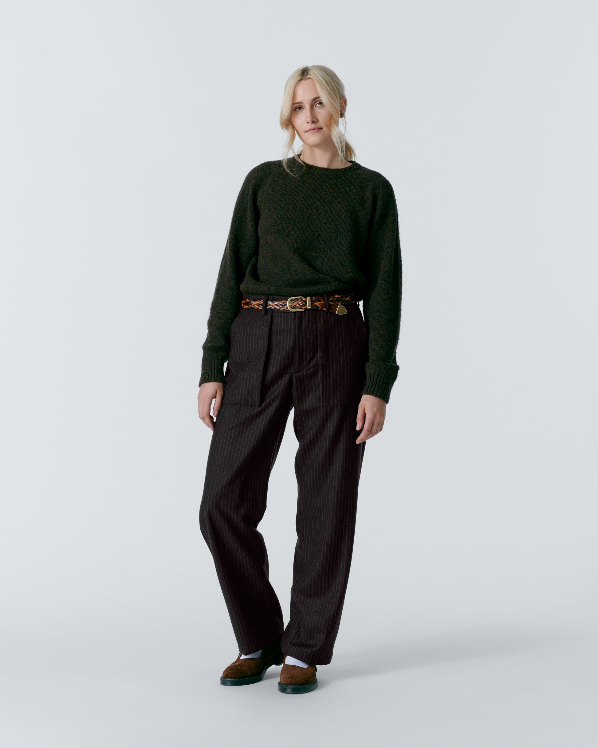 Made in Portugal. 100% super 120's flannel wool from England. Flat front with bellowed pork chop pockets. Zip-fly and genuine horn button closure. Half lined. Nile is 6'2" and wearing size 32. Cushla is 5'11" and wearing size 32