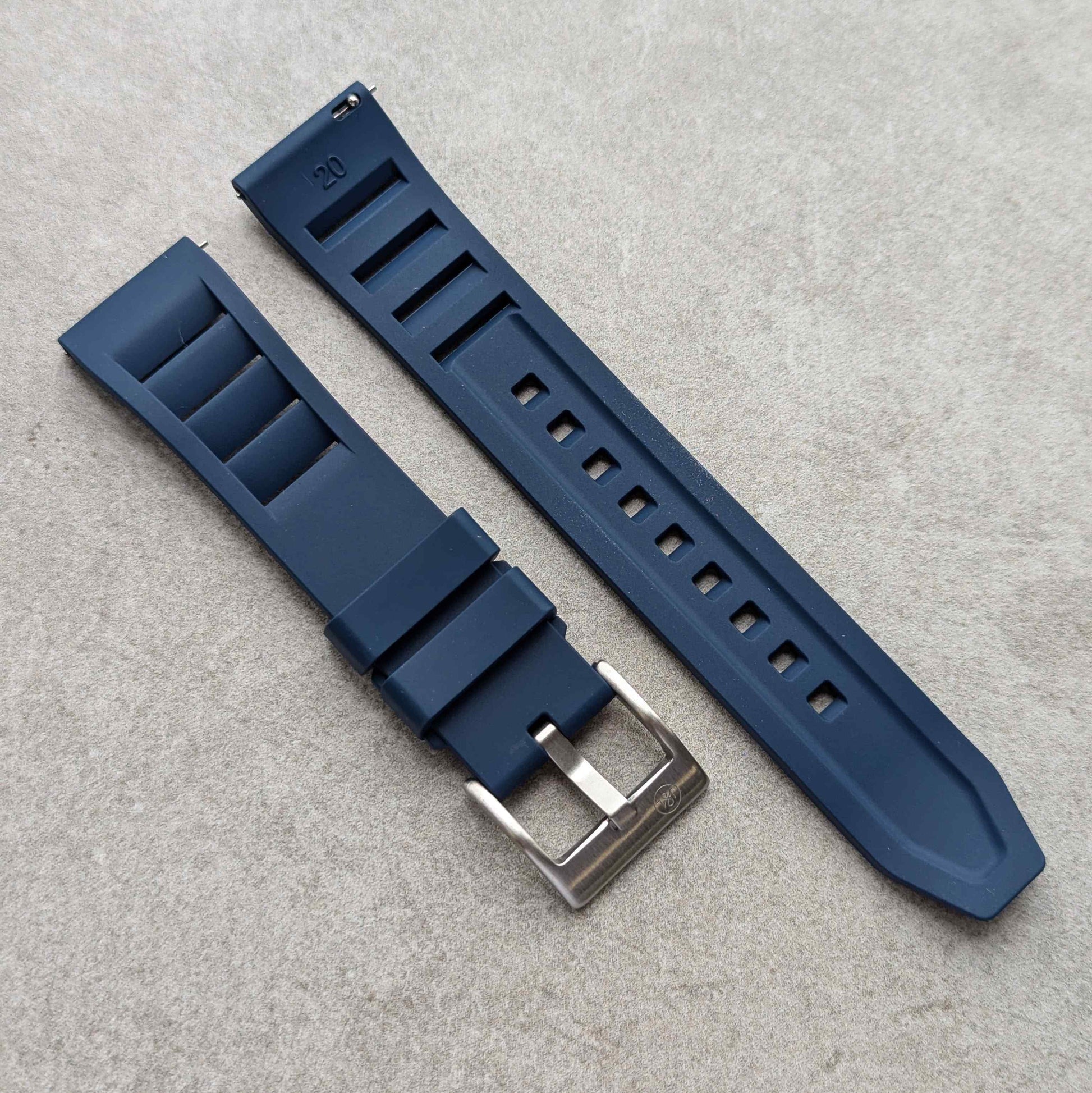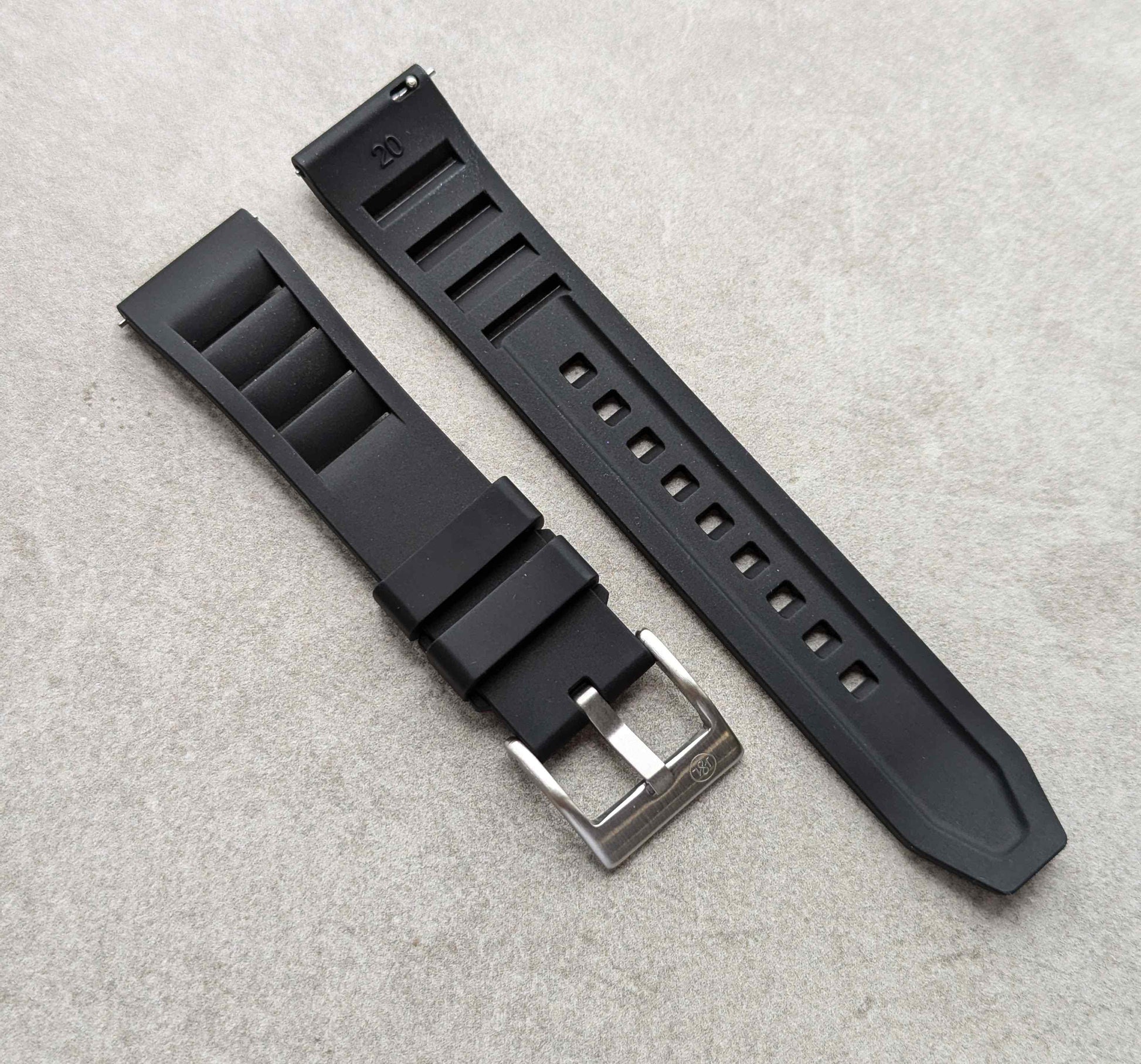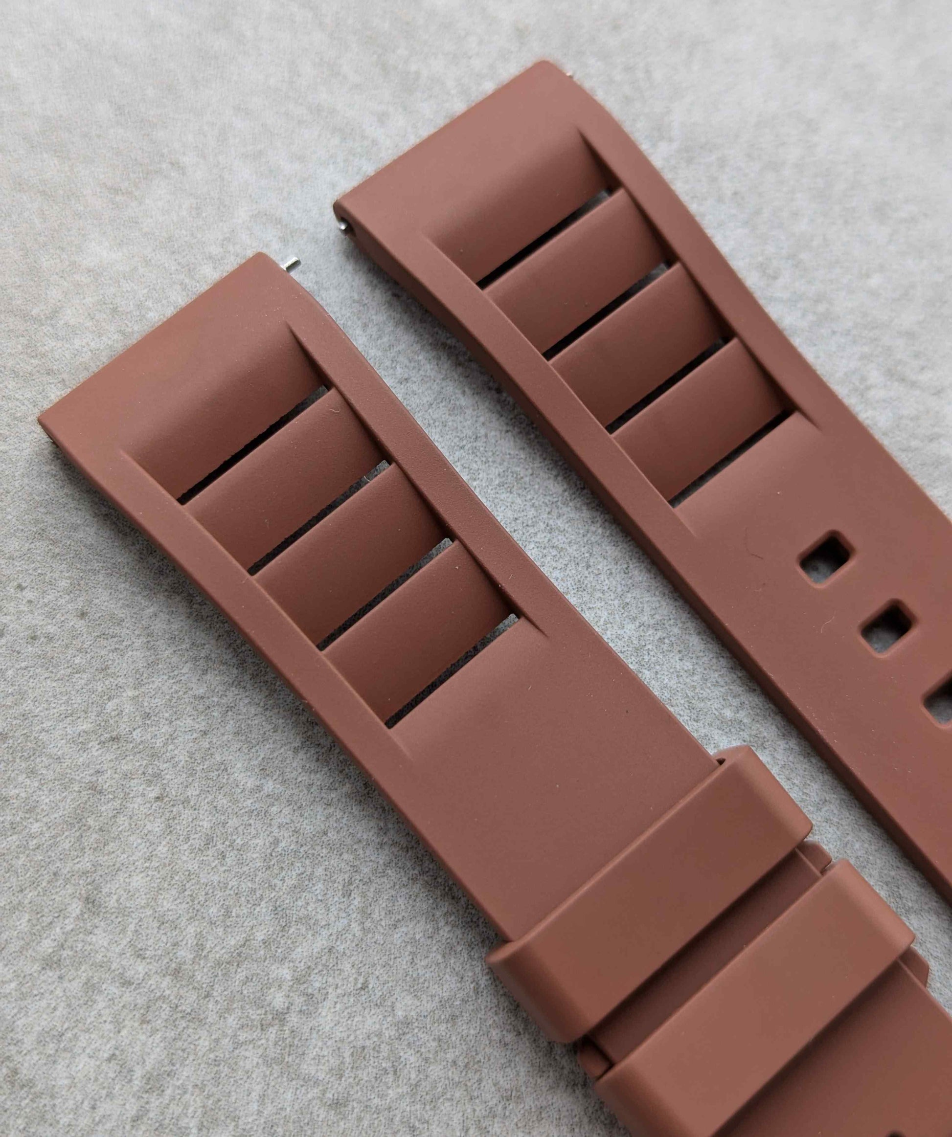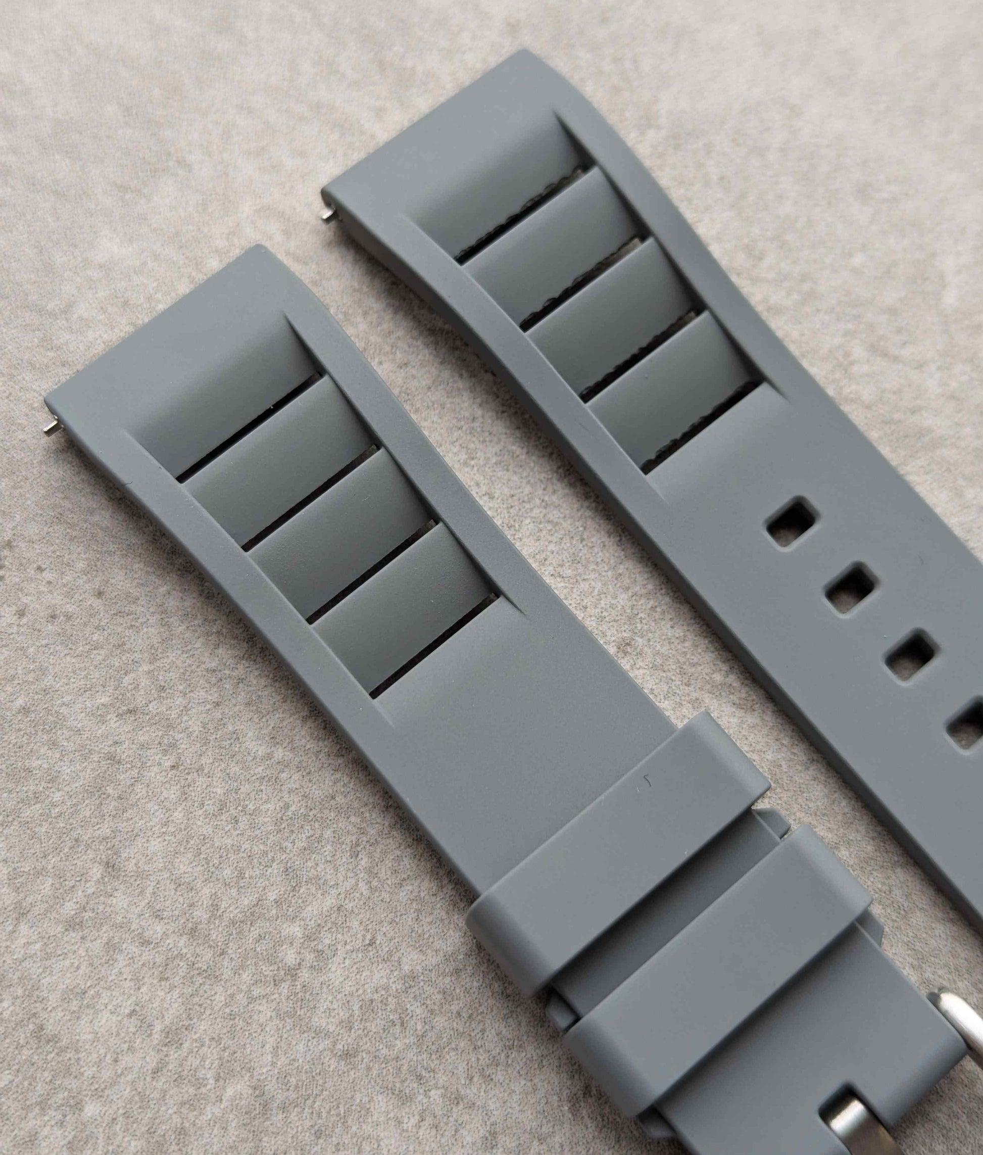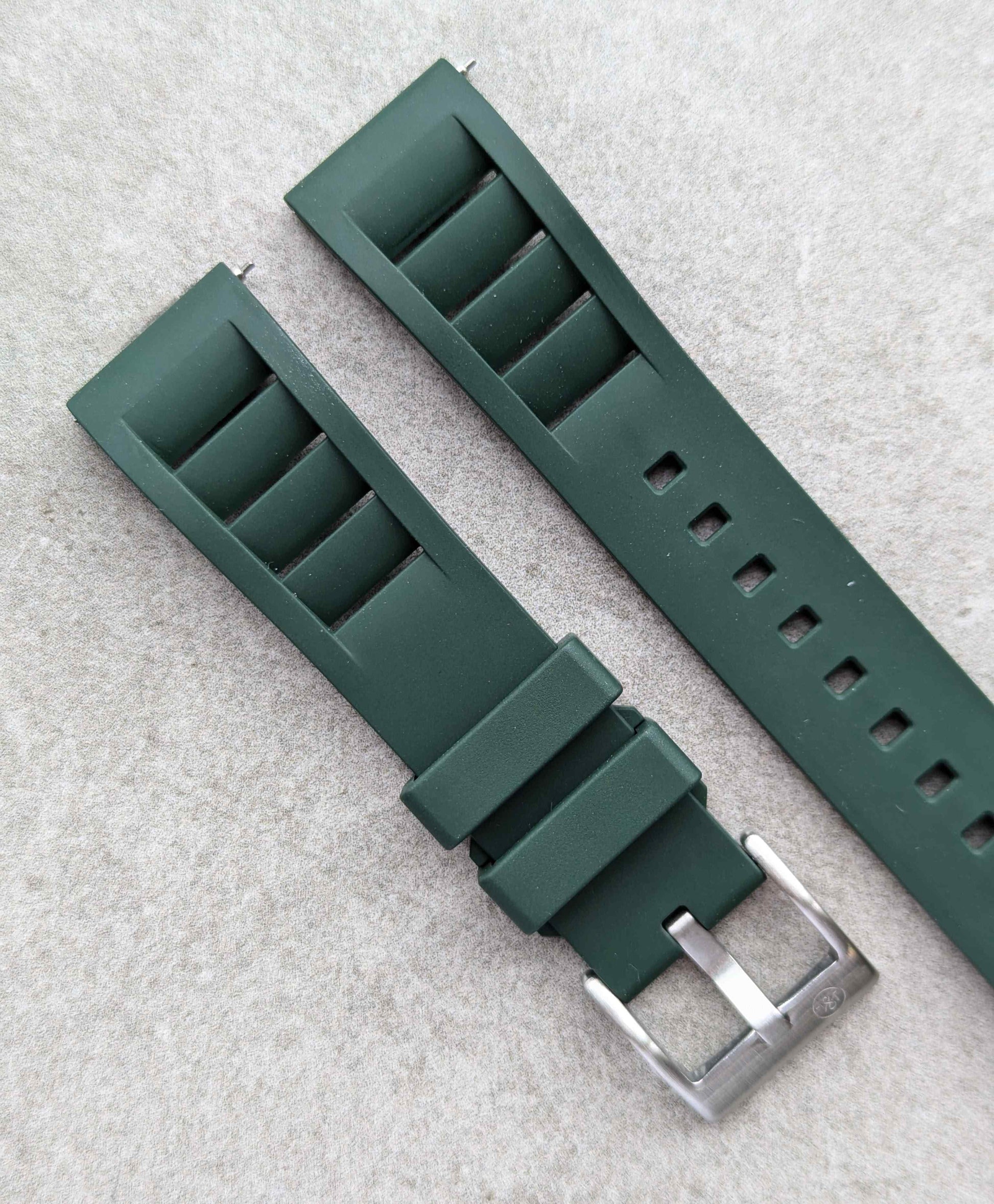 FKM rubber straps are a man-made rubber watch strap with high density but soft to the touch. It was important to me to find a rubber strap that offered ultimate comfort but very good resistance to the elements. FKM rubber can resist extremes of temperature and it is made to withstand harsh conditions such as chemical exposure making this perfect for summer holiday use - the pool, suncream, heat exposure etc. A long lasting rubber strap that is a joy to wear