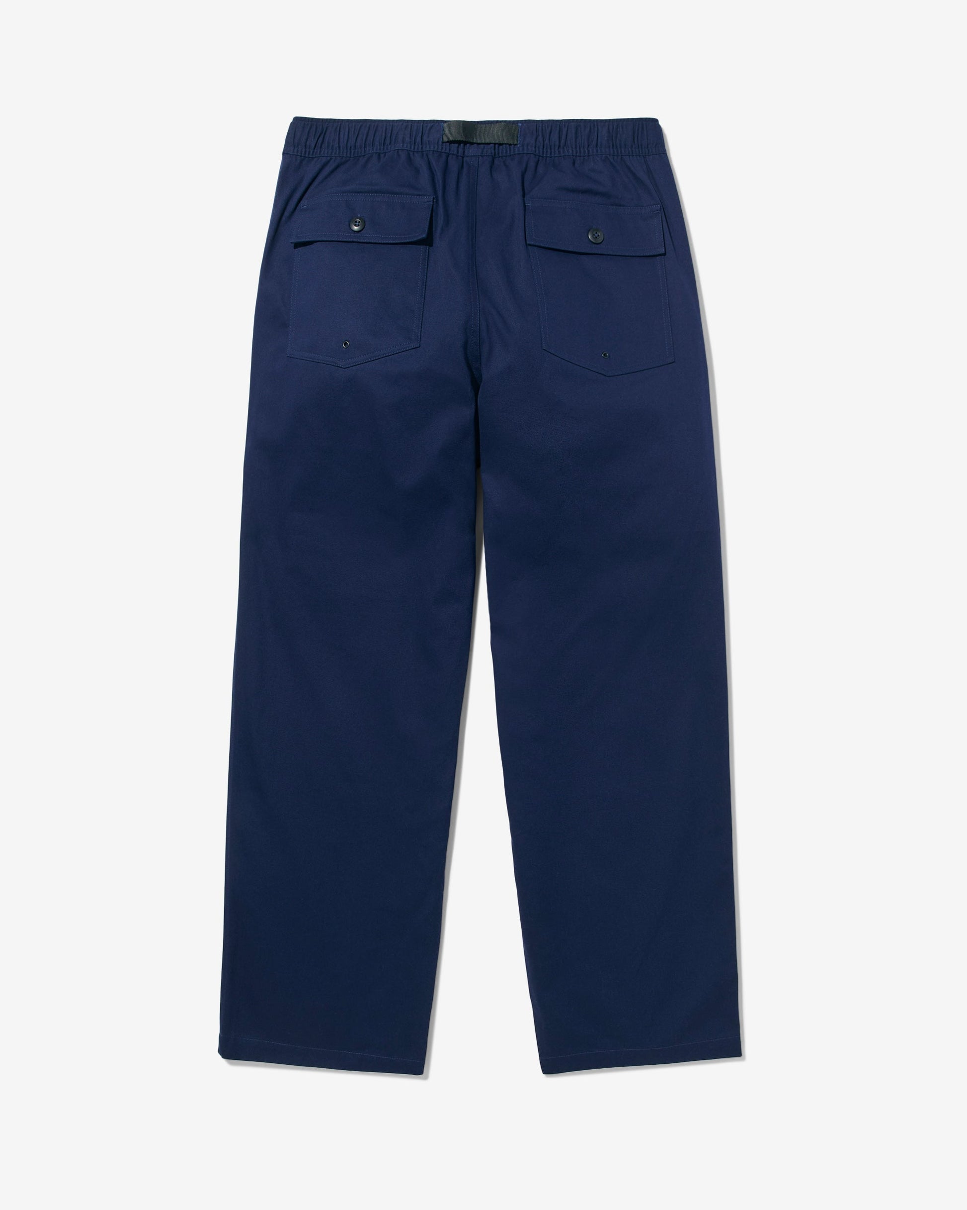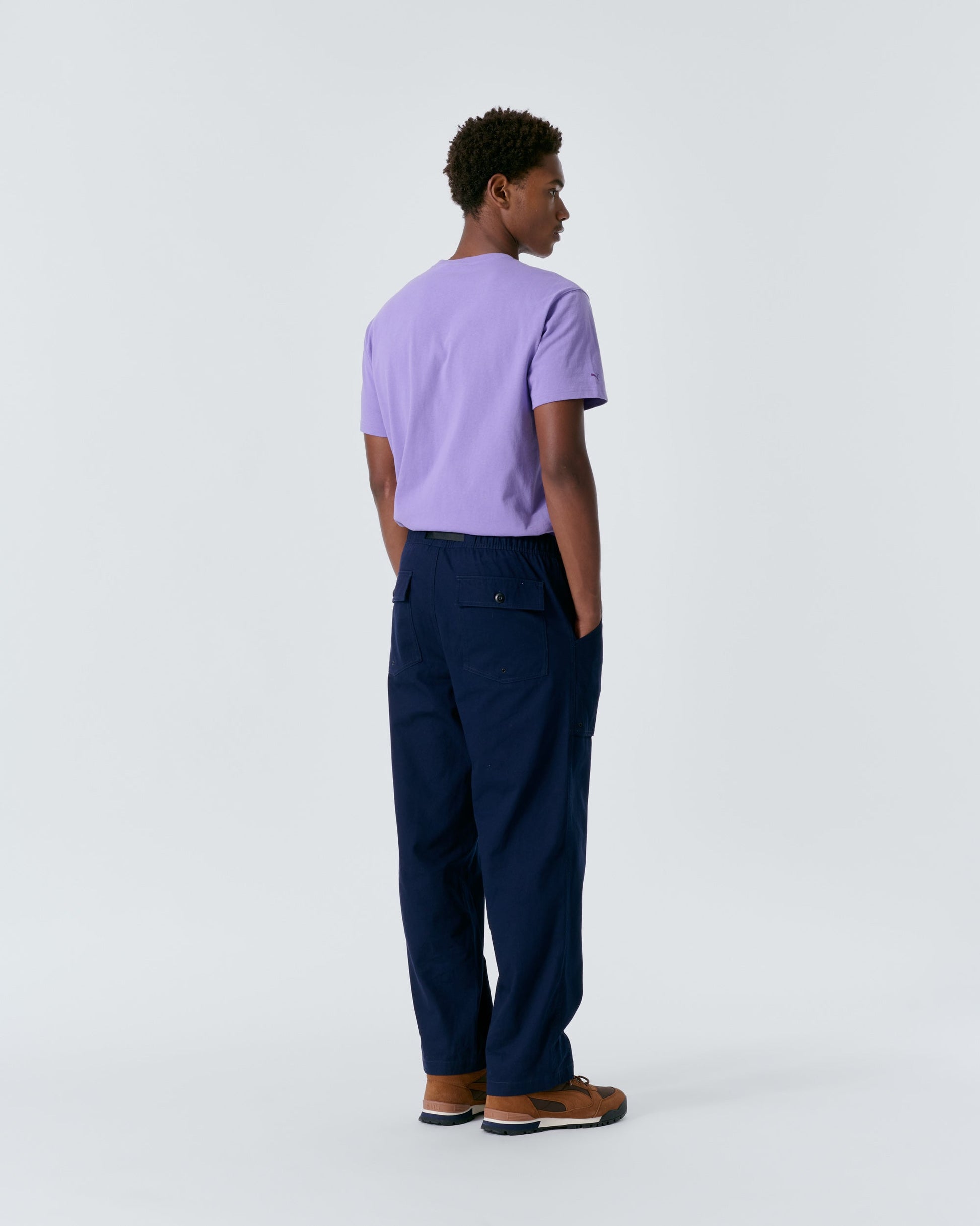 Made by PUMA exclusively for Noah 100% cotton (30% recycled cotton) twill 236 gsm. Elasticated waistband with built-in webbing belt. Two front porkchop patch pockets with drainage eyelets. Two back flap patch pockets with button closures and drainage eyelets. Embroidered logo below waistband on front leg. Woven label sewn onto belt tip. Nile is 6'2" and wearing size M