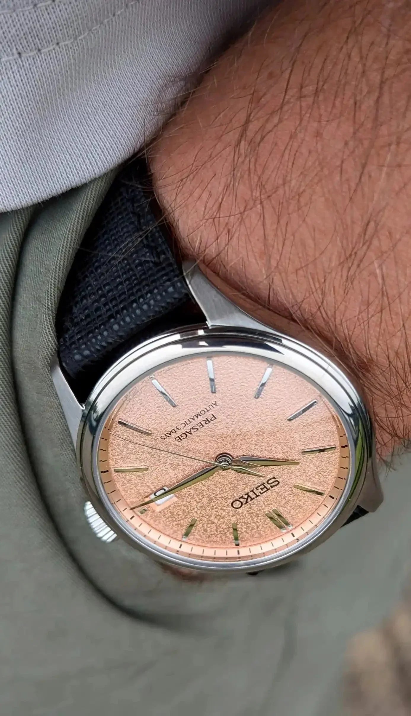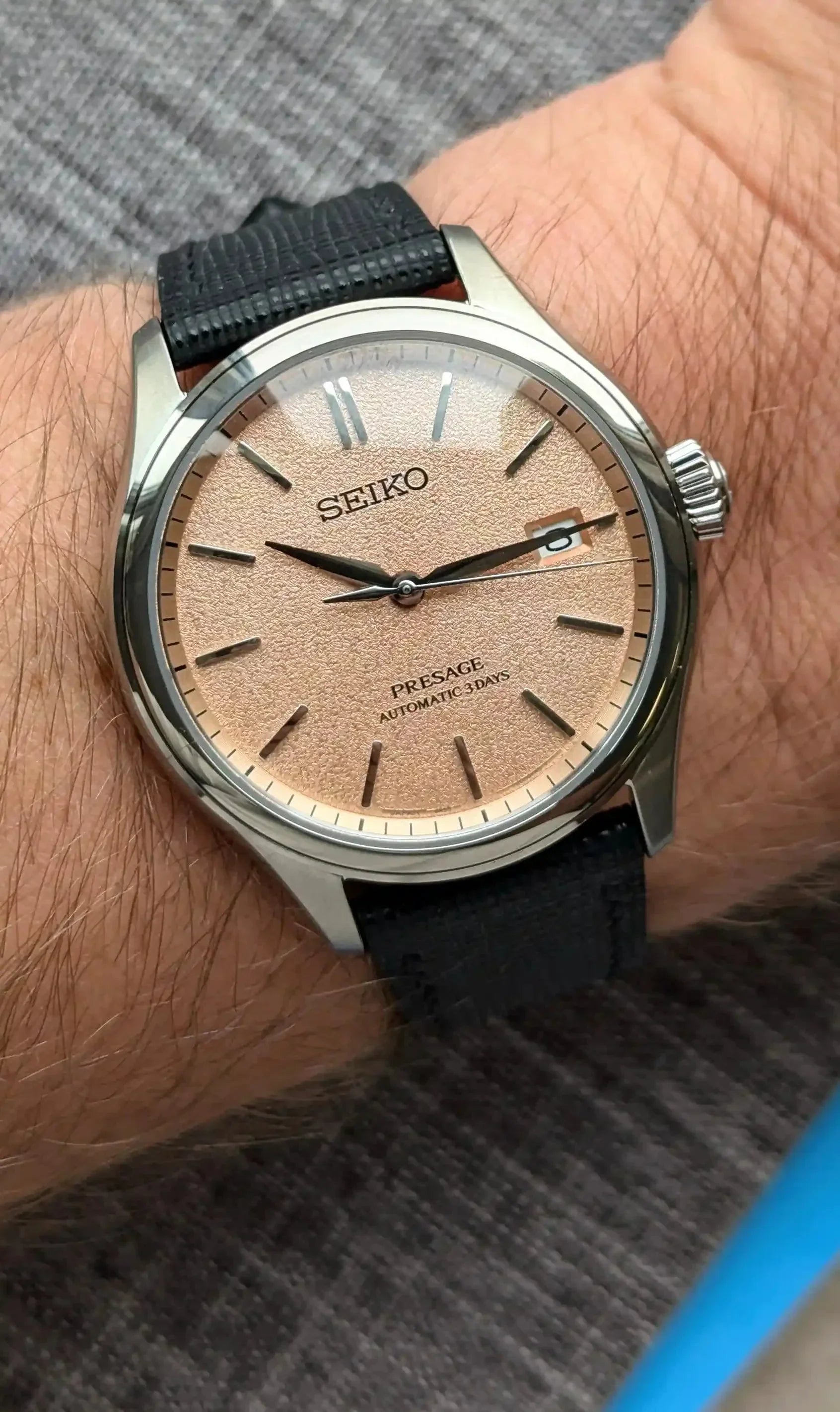 Saffiano has medium pliability and comfortable straight away, the moment you fit it to your watch. A pliable leather that wears beautifully on the wrist an exudes a casual elegance. The surface is scratch resistant and has a uniform grain with good water resistance