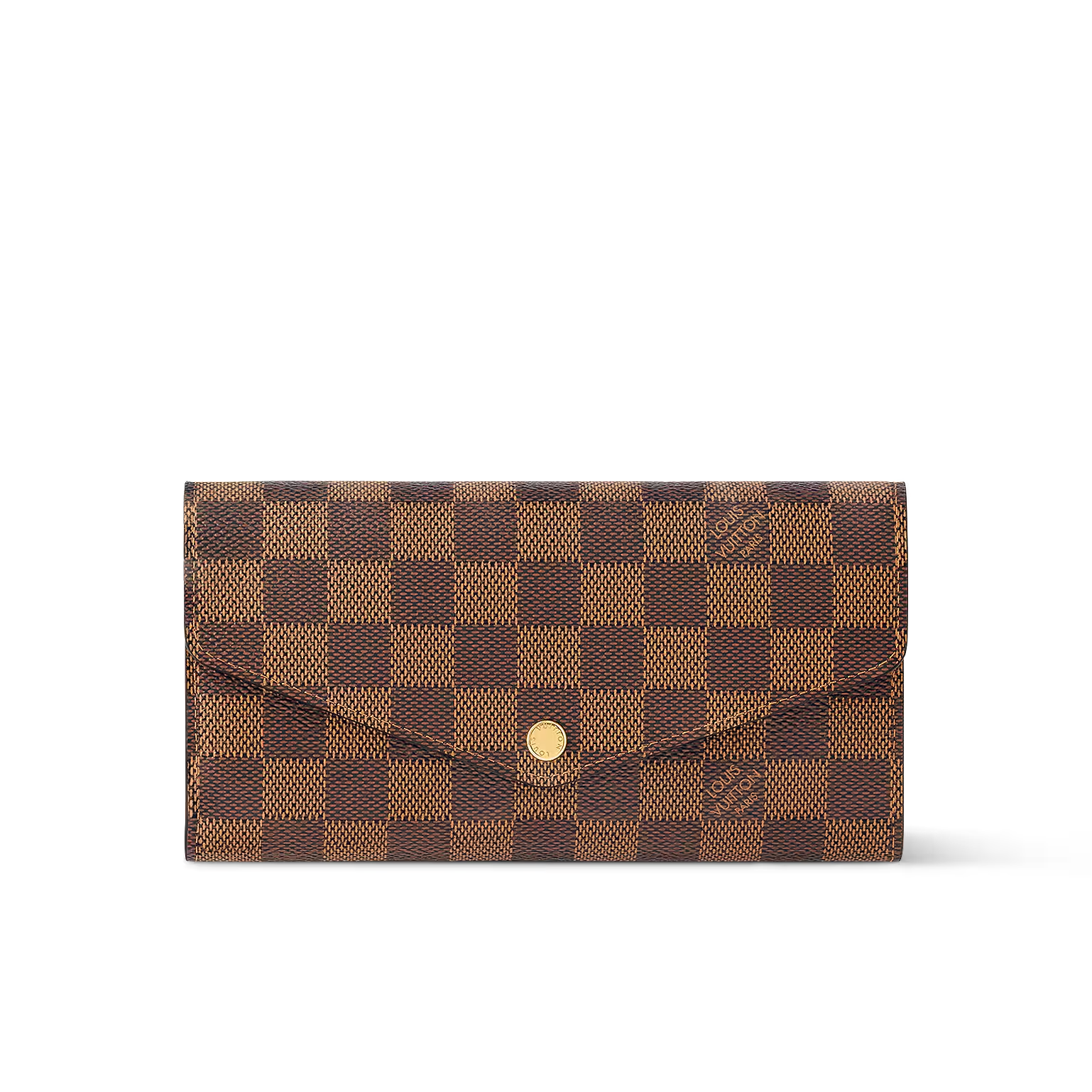 The Sarah wallet comes in Louis Vuitton's historic Damier Ebene canvas, complemented by a grained-leather lining. This classic wallet combines a feminine look with a highly functional design, including two roomy compartments, a zipped coin pocket and numerous card slots. Its envelope-style flap is sealed with an engraved, gold-tone press-stud.