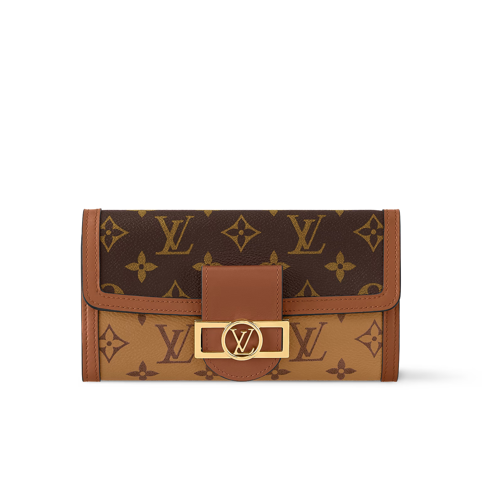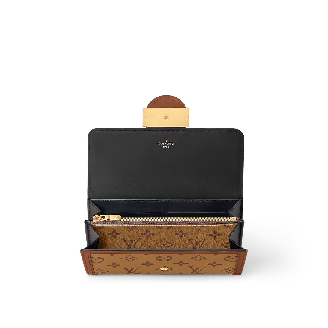 The Sarah Dauphine wallet revisits the classic Sarah flap wallet with the refined signatures of the Dauphine line: the combination of Monogram and Monogram Reverse canvas, the calf-leather trim and the vintage-look LV Circle clasp. This elevated design offers an array of practical features, including 12 card slots and a zipped coin pocket in Monogram Reverse canvas.