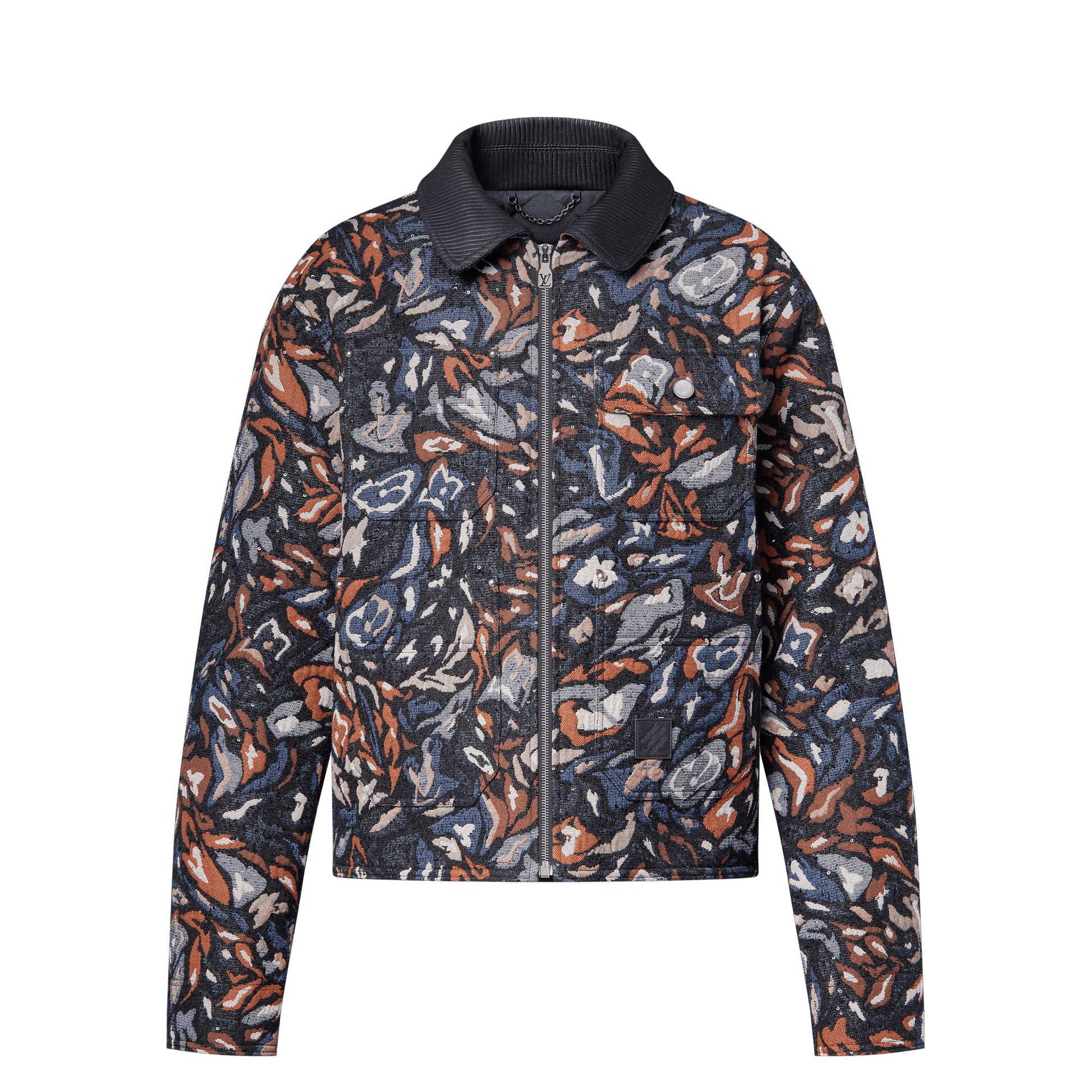 This exclusive jacket is crafted from a sophisticated tapestry-like jacquard adorned with embroidered sequins. It showcases the Fall-Winter 2025 show’s graphic LV Camo motif incorporating Monogram signatures in rich graphite and terracotta tones. Workwear accents include a ribbed corduroy-effect leather collar and patch pockets with silvery rivets, while a leather Marque L.Vuitton Déposée patch signs the front. Complete with a quilted lining.