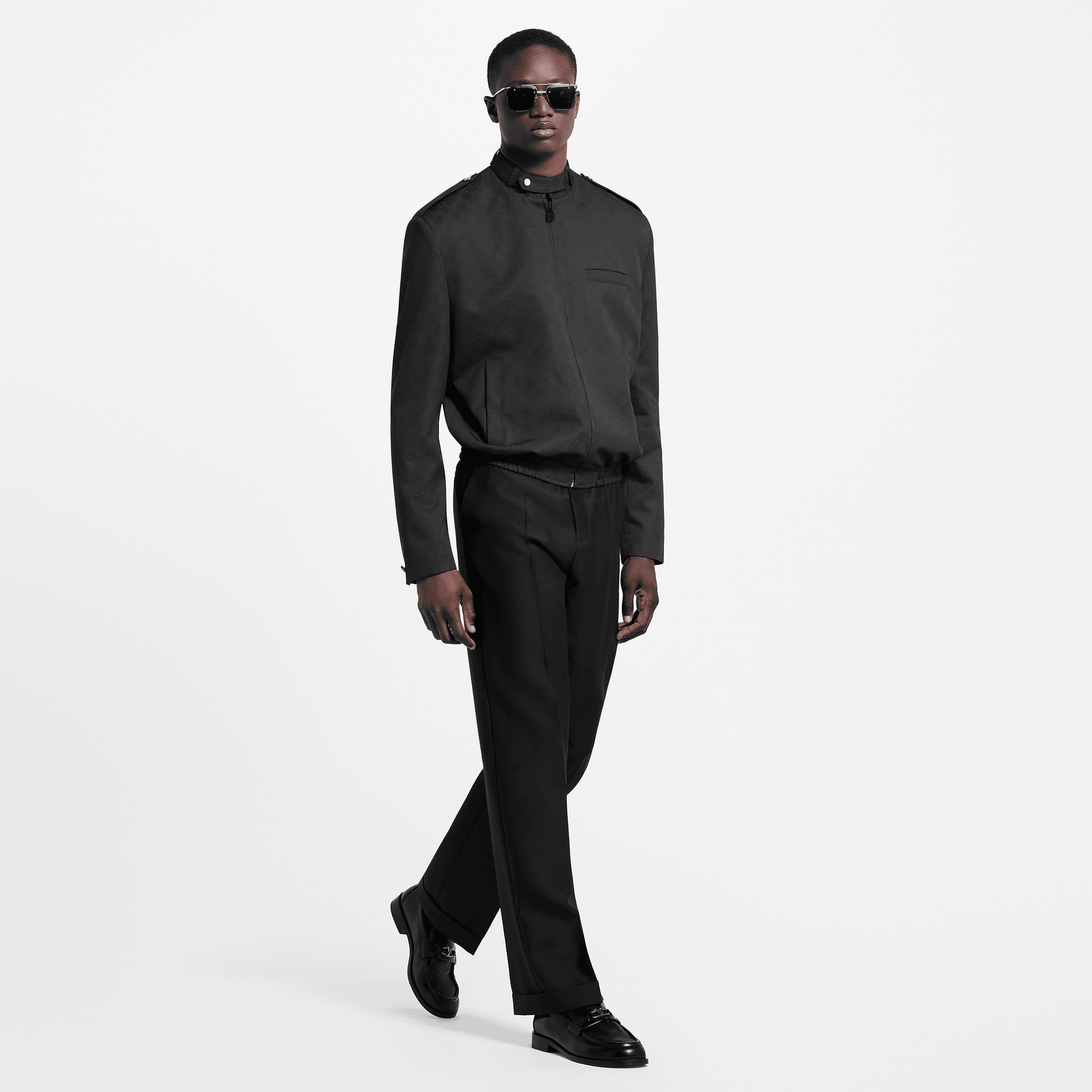 This black wool blouson takes a modern approach to tailoring, combining traditional details such as buttoned cuffs and piped pockets with contemporary accents such as a biker collar, zipper fastening and elasticated waist. The fine wool jacquard fabric is distinguished with a discreet lightly textured Damier Flower motif. This light jacket brings an elegant twist to everyday looks.
