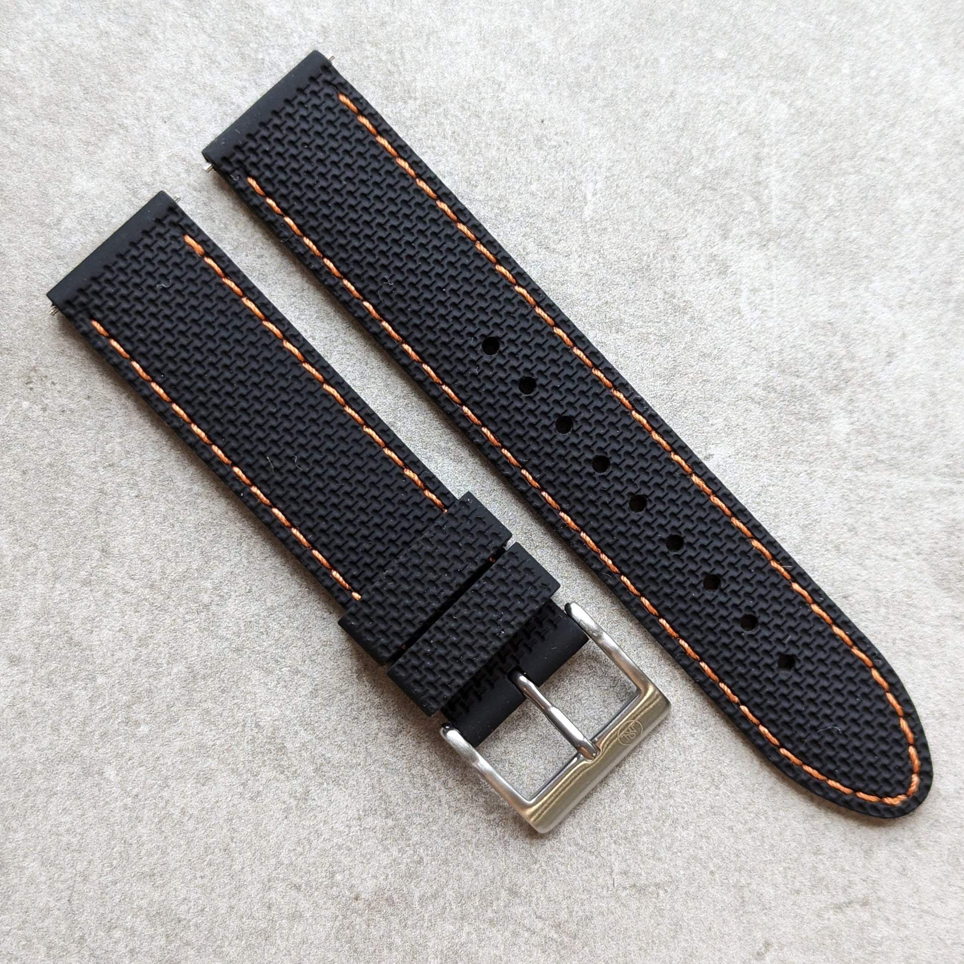 Our textured sport style rubber straps are a man-made rubber watch strap with high density but soft to the touch. It was important to me to find a rubber strap that offered ultimate comfort but very good resistance to the elements. FKM rubber can resist extremes of temperature and it is made to withstand harsh conditions such as chemical exposure making this perfect for summer holiday use - the pool, suncream, heat exposure etc. A long lasting rubber strap that is a joy to wear.