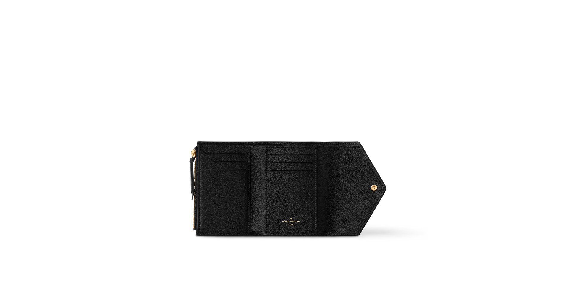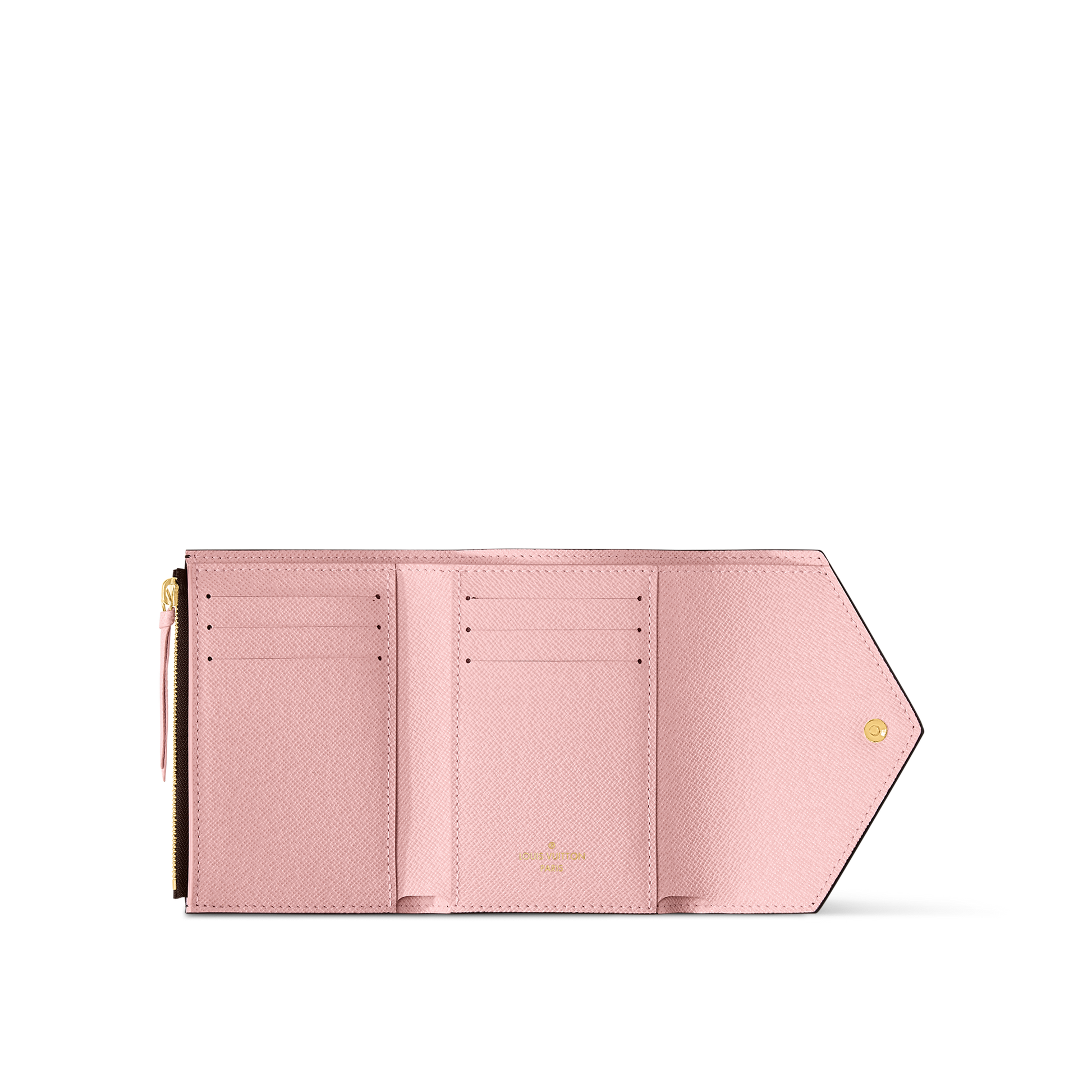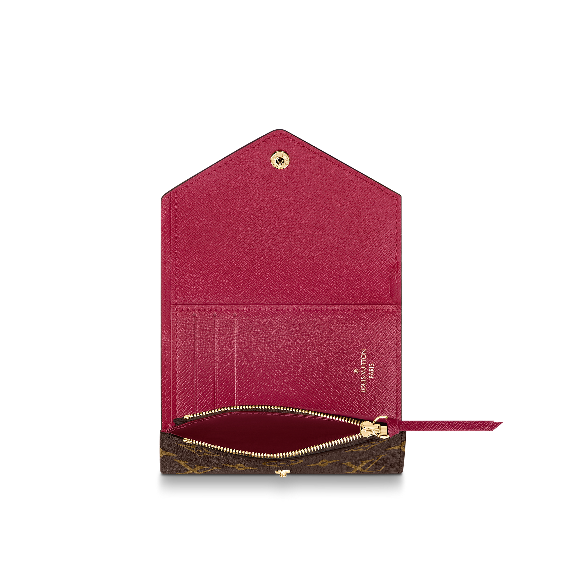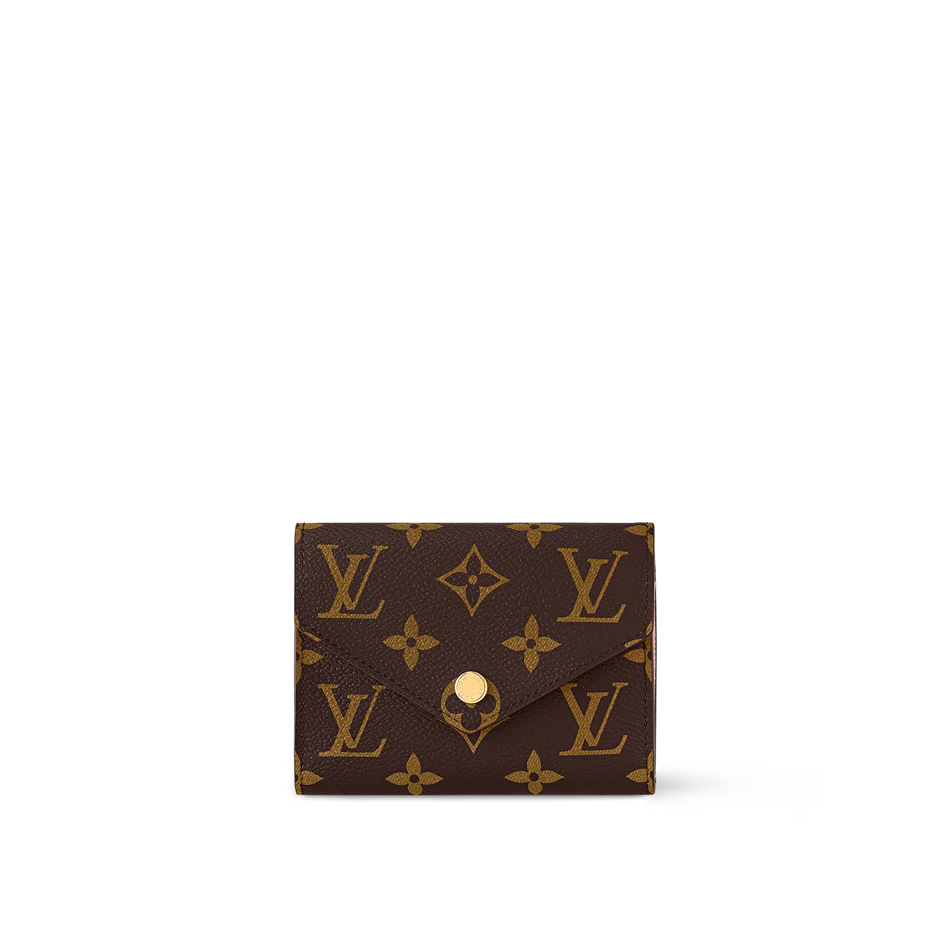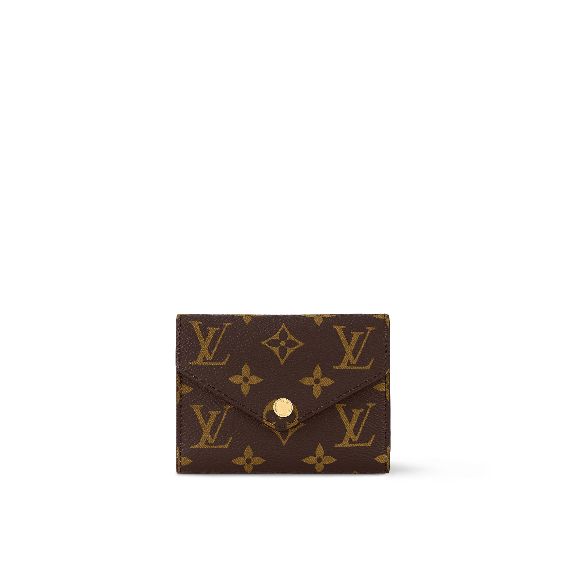 The compact Victorine wallet in Monogram canvas combines femininity and functionality. It opens out to reveal many practical features, including card slots and pockets for bills and coins. Its envelope-style flap is sealed with a press-stud.