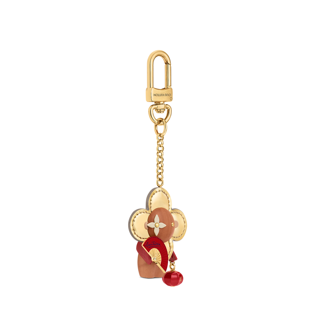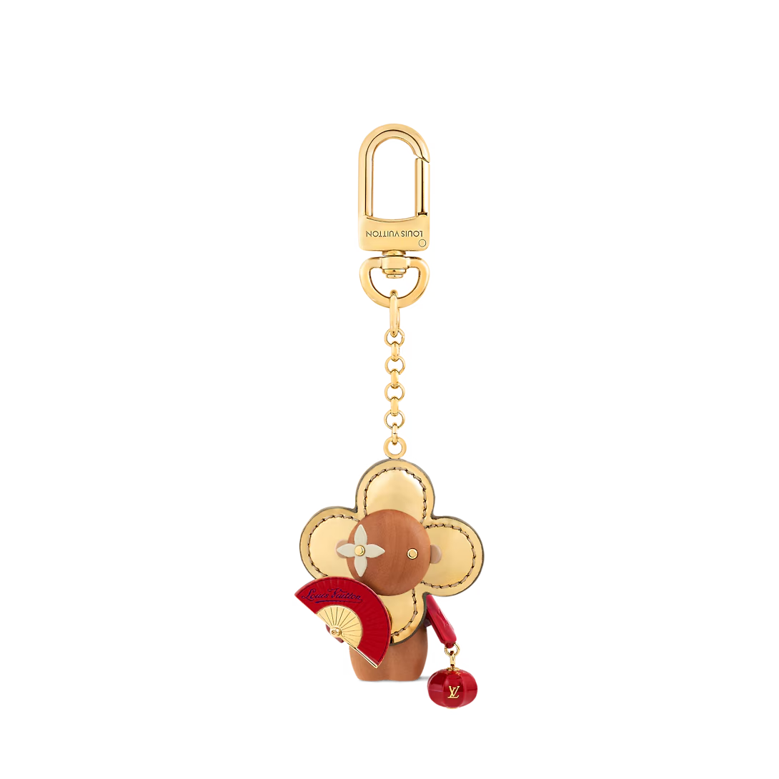 The Vivienne bag charm, crafted to celebrate the Year of the Snake, features a festive wooden image of the brand's mascot, depicting a fan. The clever design secures with a spring clasp.