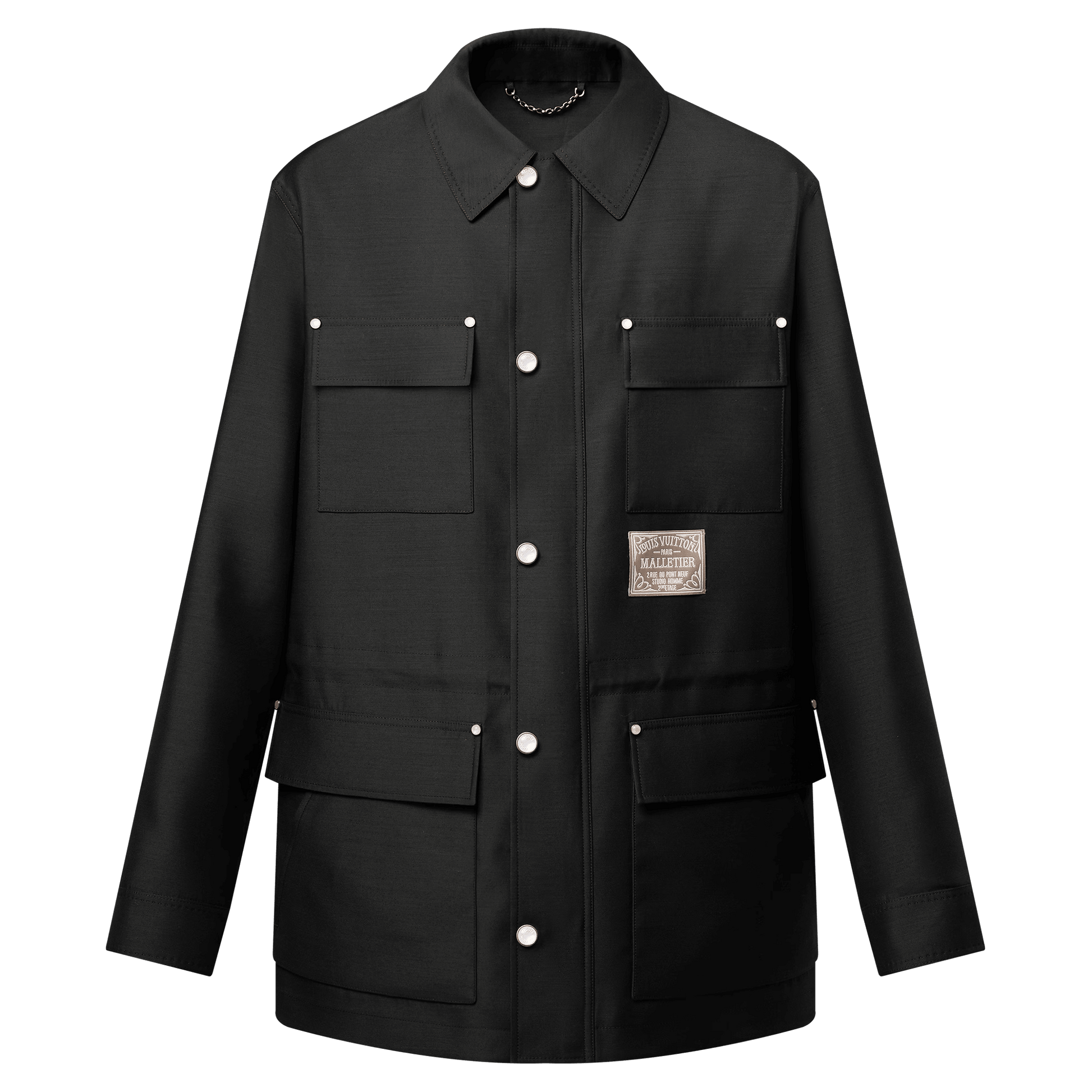 This sophisticated parka, crafted from a luxurious wool-silk blend double-face fabric, embodies the perfect blend of elegance and workwear aesthetics. The sleek, unlined silhouette features practical pockets, while pearl-effect snap buttons and golden rivet accents add a refined touch. This piece, enhanced by signature labels on the front and back, makes a chic and versatile addition to any wardrobe.