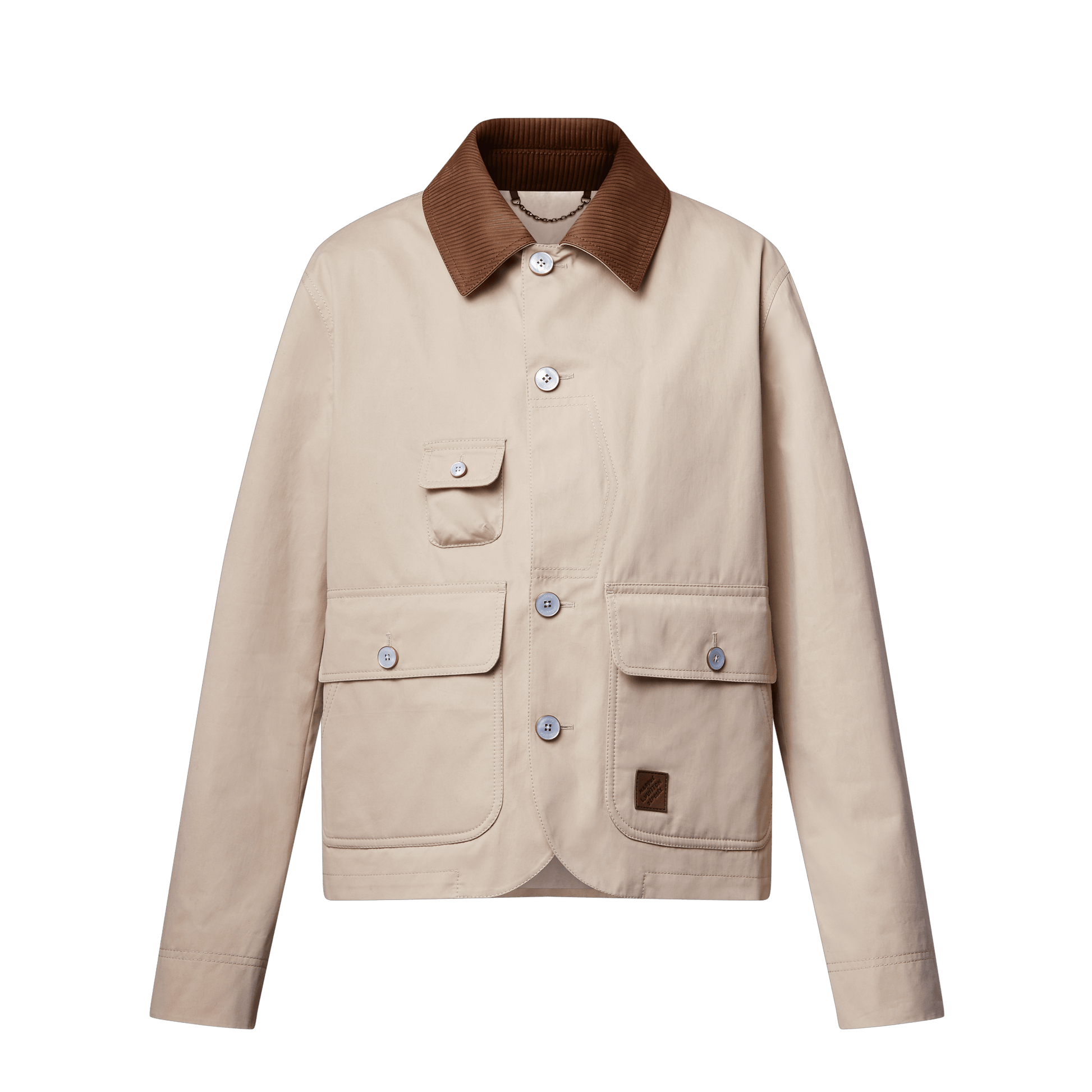 Considered details elevate this light canvas gardening jacket from the Fall-Winter 2025 show. Crafted from pale beige twill with a relaxed fit, it has a flattering curved hem, a leather ribbed collar and a Marque L.Vuitton Déposée patch. Workwear details include a handy chest pocket for holding earphones. Mother-of-pearl effect buttons add a sophisticated finishing touch to this timeless style.