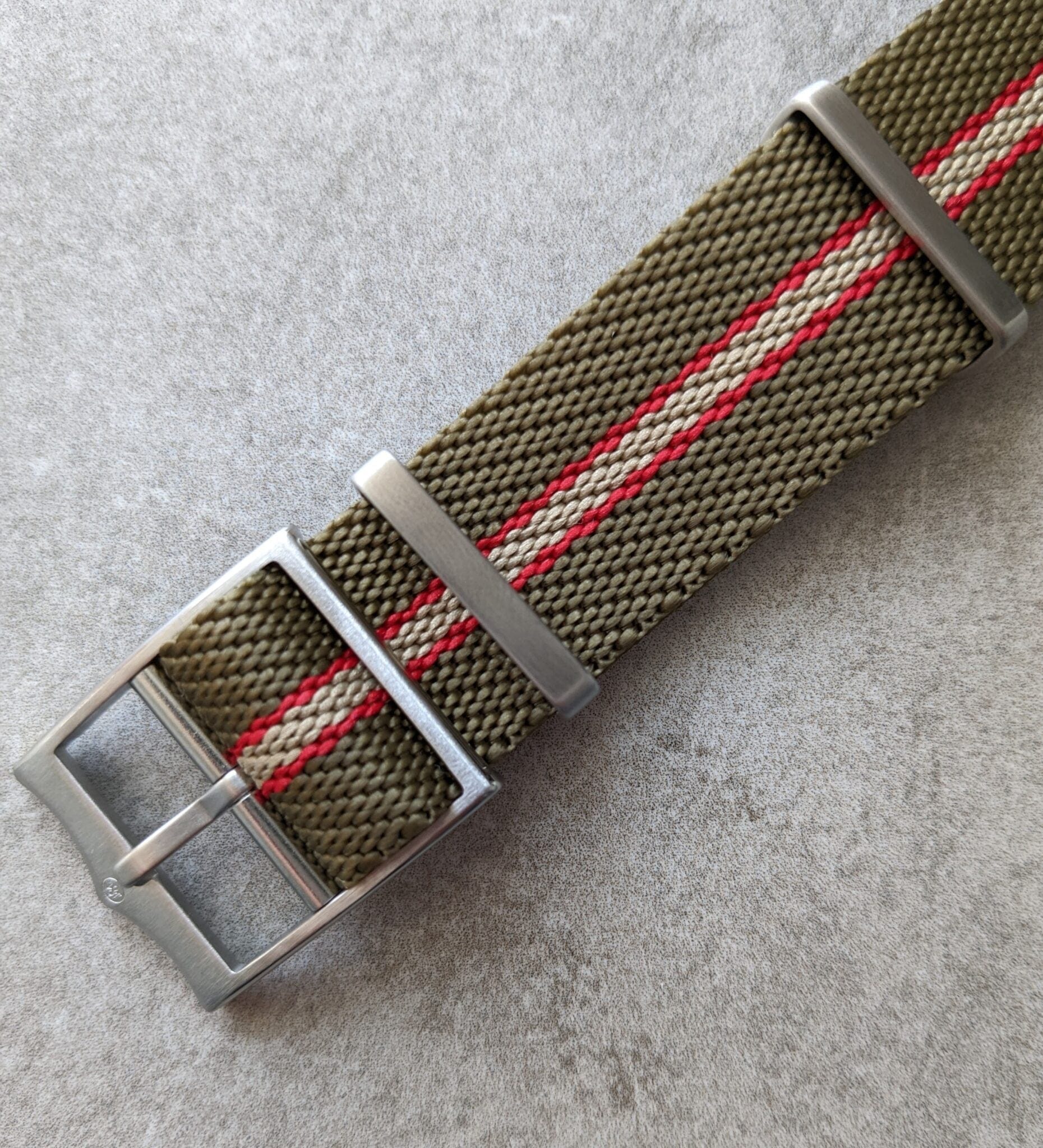 A hybrid between Perlon and Fabric straps, my premium branded woven single pass Fabric watch strap is one of the finest and most comfortable examples of a Fabric strap that you will find. Super comfortable to wear just like other Fabric straps but with a beautiful finish with wonderful depth due to the nature of the weaved alternating threads.