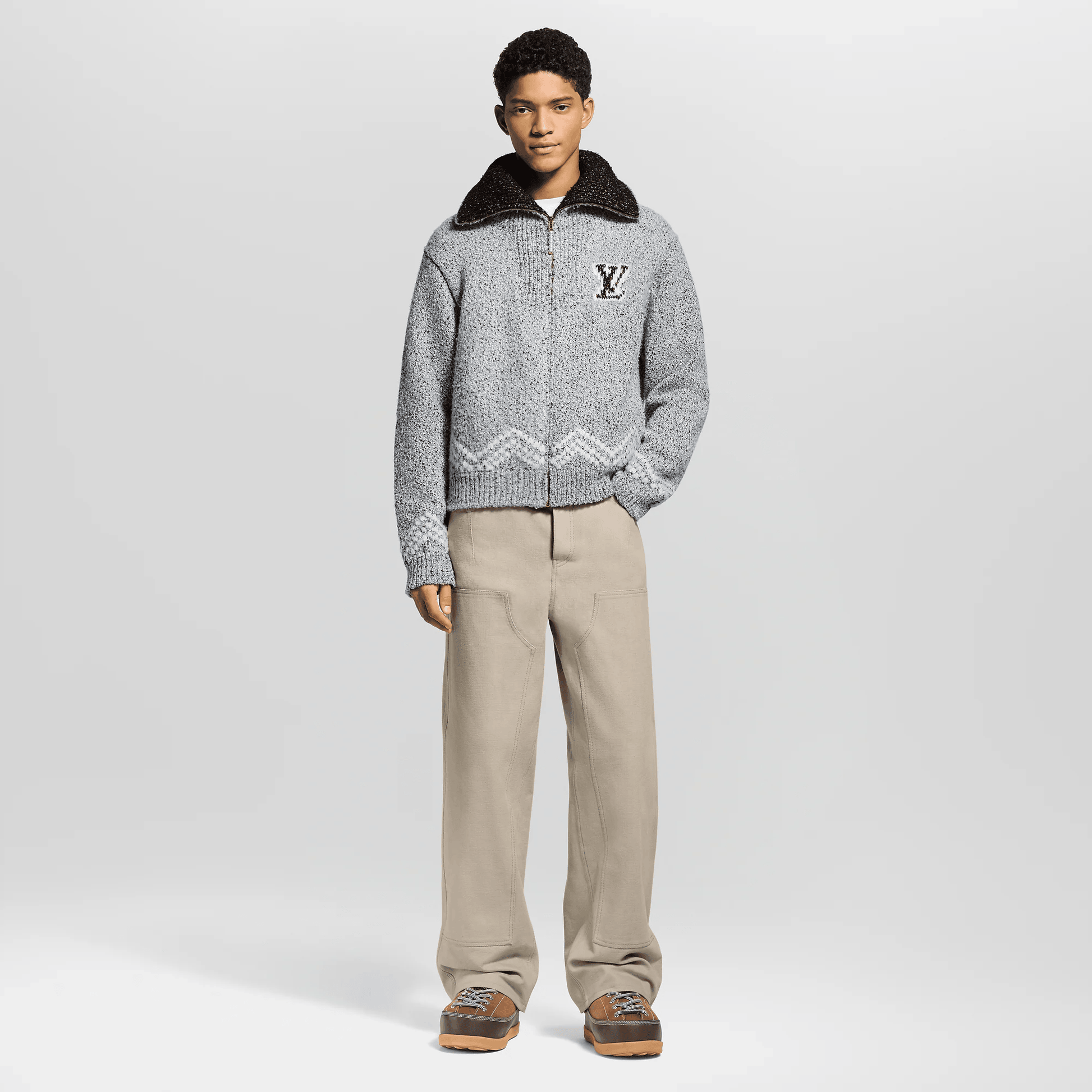 This pebbly gray knitted blouson has a handcrafted vibe. It has an embroidered LV on the chest and is adorned with a colorful intarsia design on the back from the Fall-Winter 2025 collection. The motif celebrates the long-standing friendship behind this season’s collaboration between Pharrell and Nigo, depicting the two artists on a fishing boat in an idyllic setting. A pearl-embellished zipper puller gives this piece a chic finishing touch.