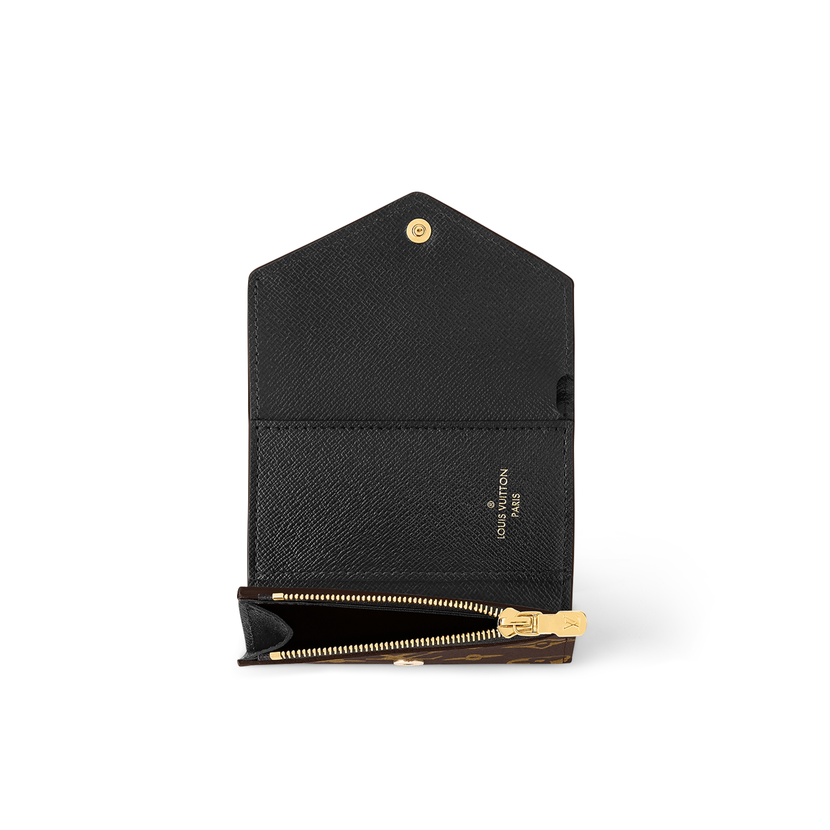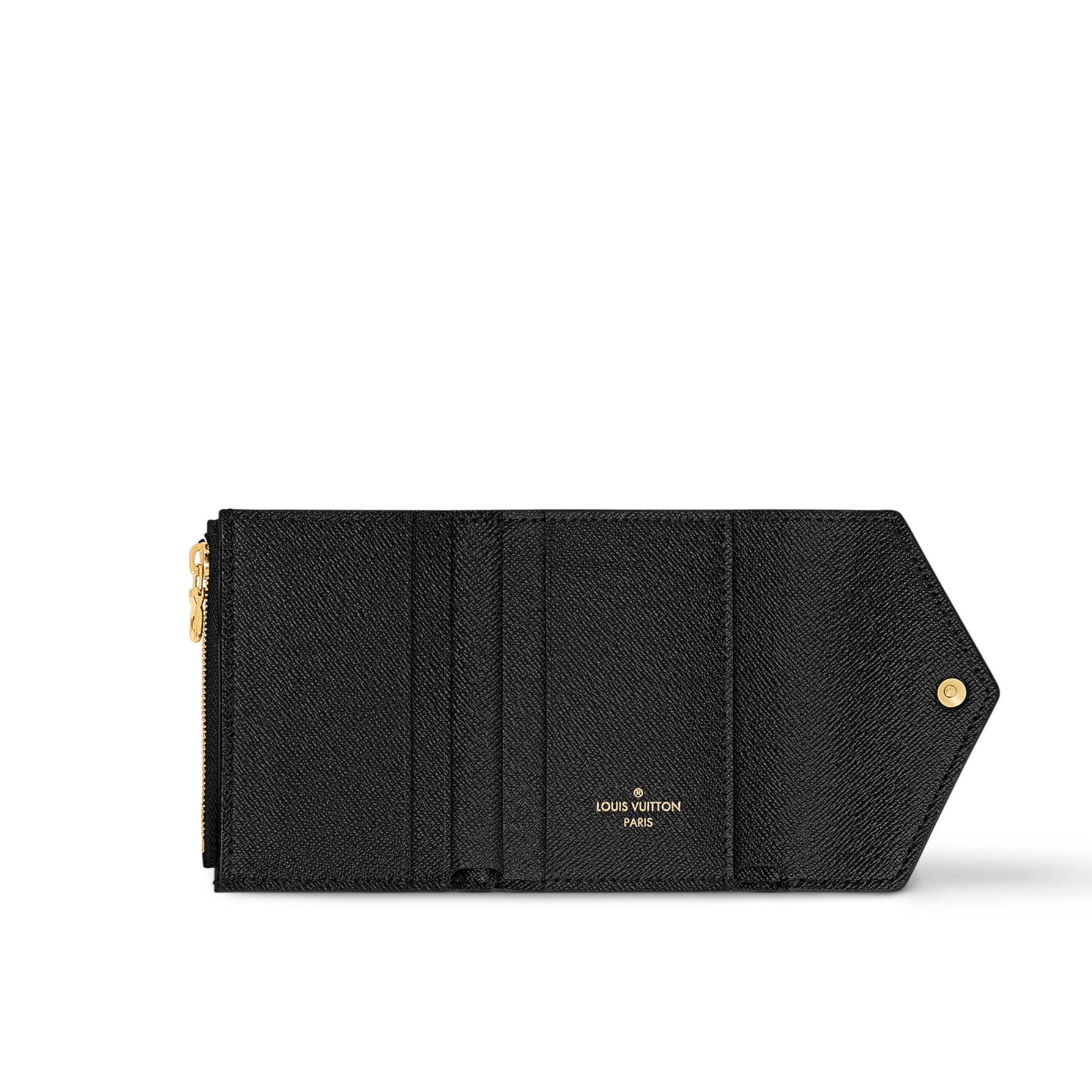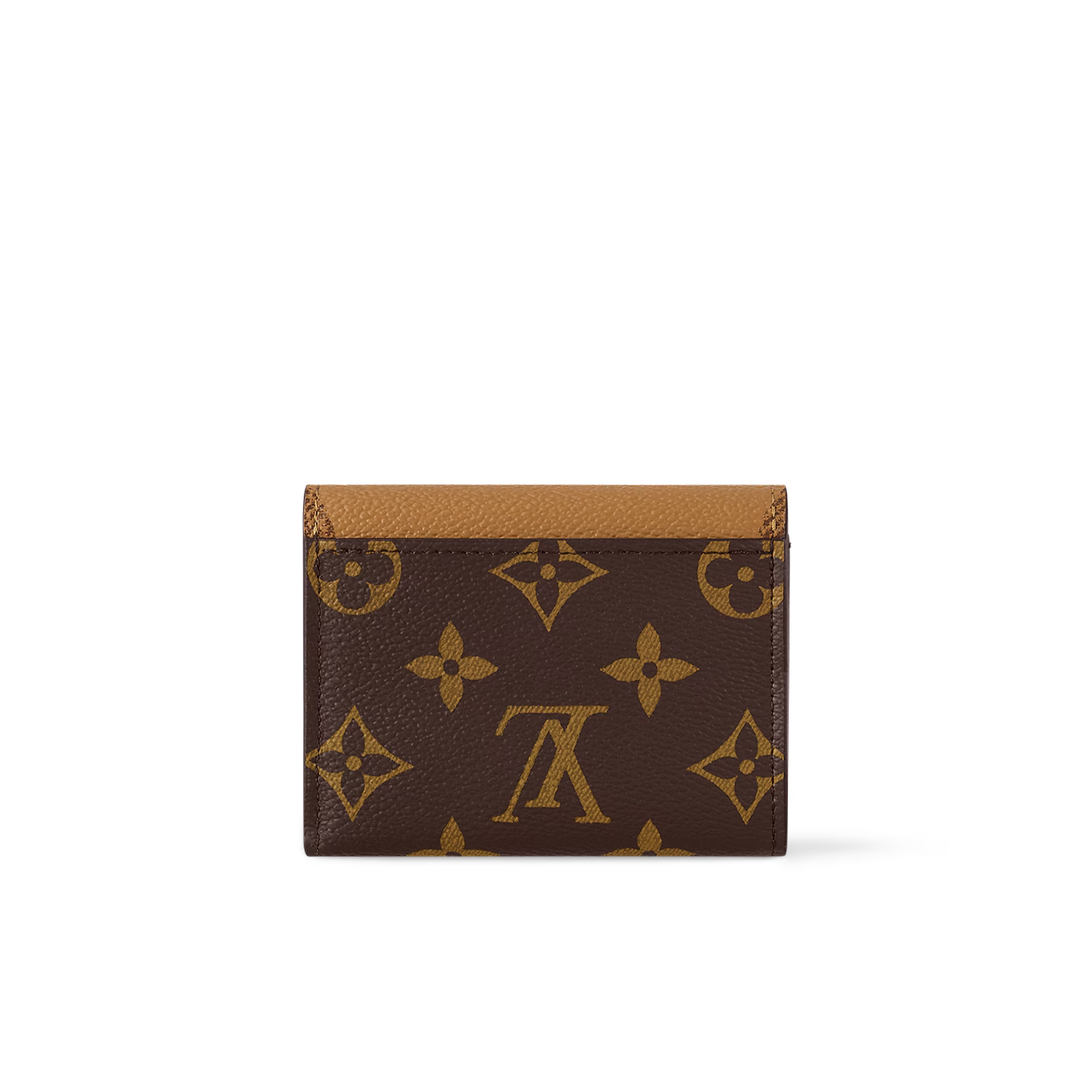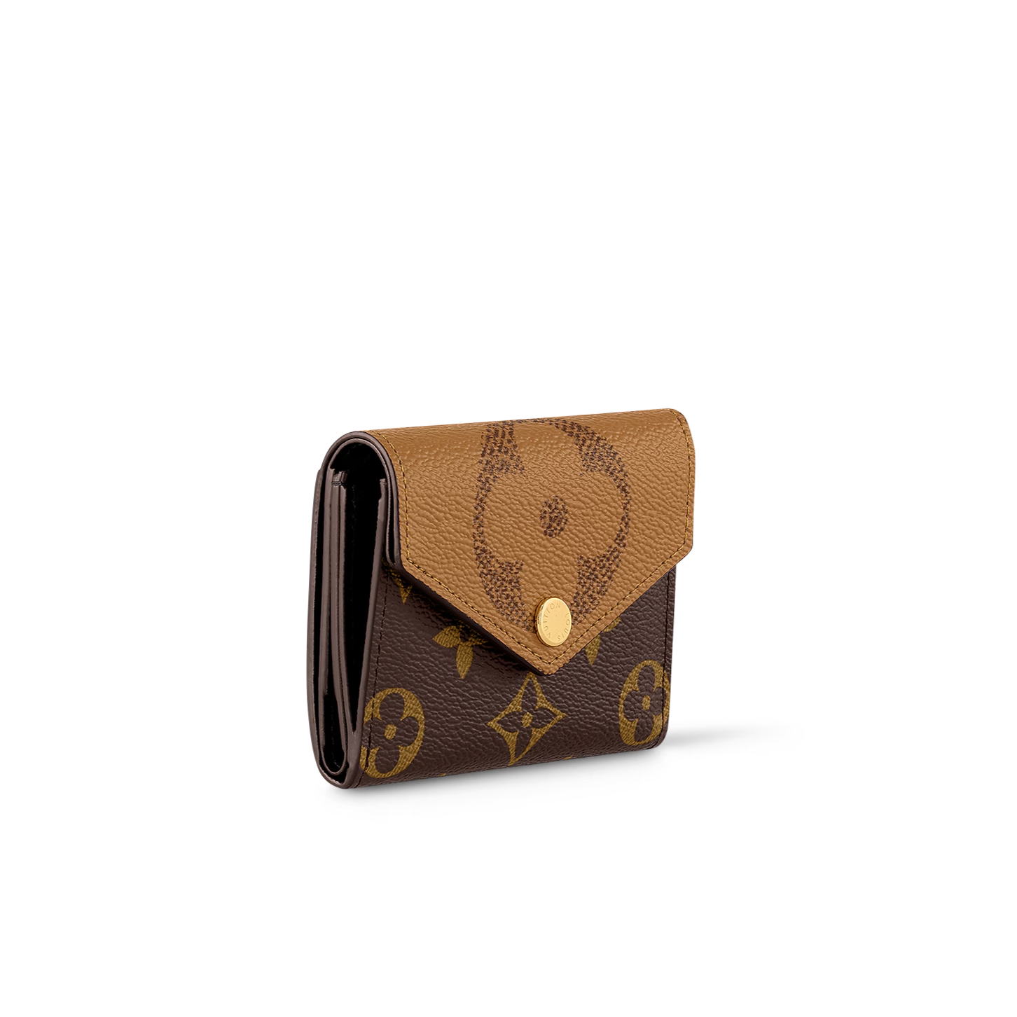 The Zoé wallet combines Monogram and Monogram Reverse Giant canvas for a chic, playful look. This tiny wallet is notable for its practical design, opening out to reveal a large flat pocket, a zipped coin pocket and several card slots. Its flap is secured with an engraved, gold-tone press-stud.